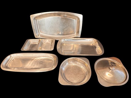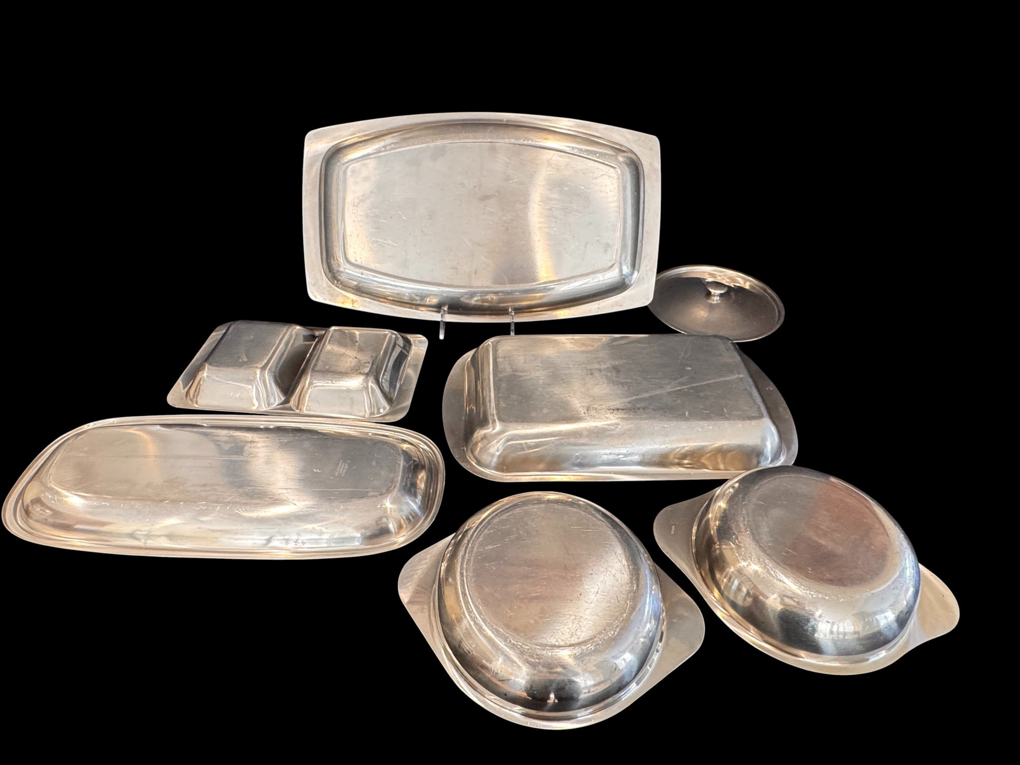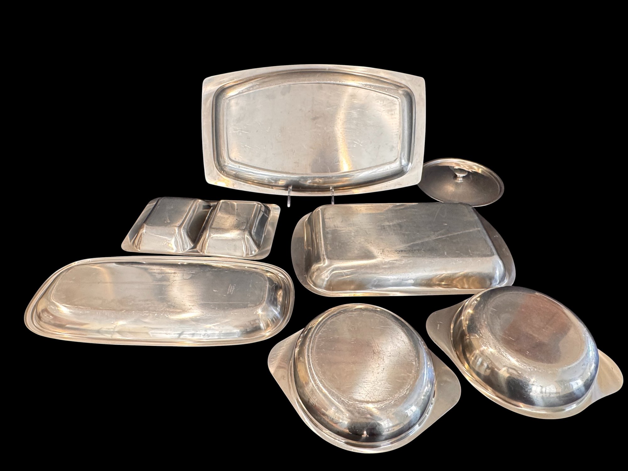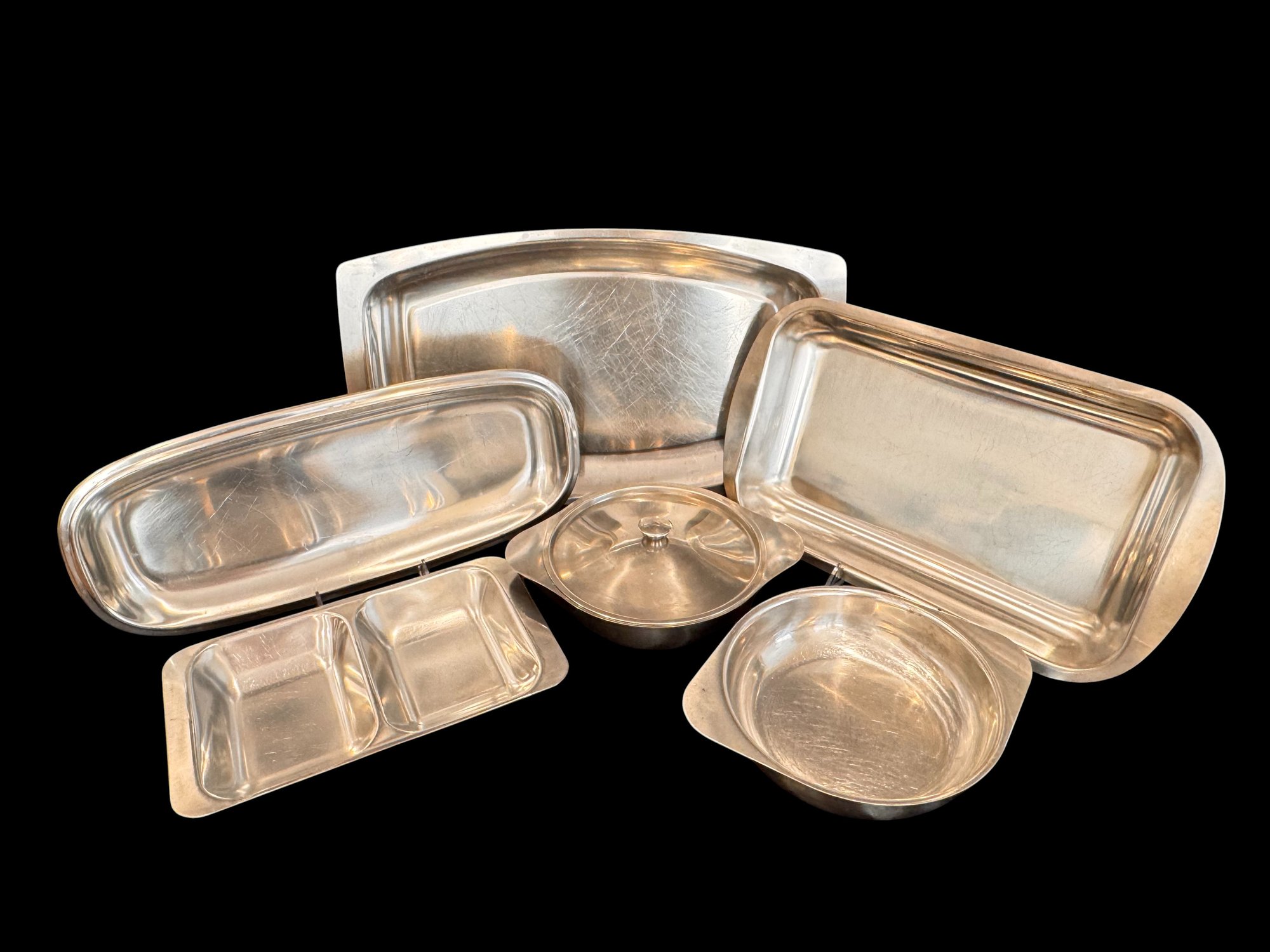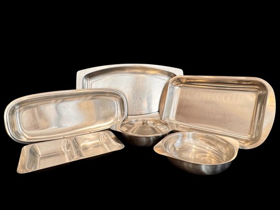 A sleek and functional grouping of mid-century Scandinavian stainless steel serveware by respected Swedish makers. This lot includes a coordinated assortment of serving trays and dishes in clean, modernist forms.