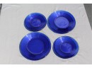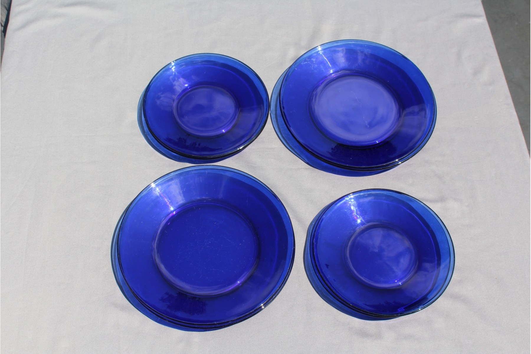 Very nice looking cobalt blue glass dinner and salad plates. diner plates are 10" dia. & salad plates are 8", no chips and some wear associated with age and use. 1st photo is both dinner and salad plates stacked by 2's.