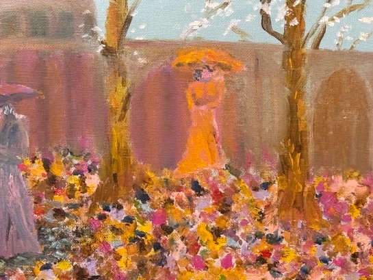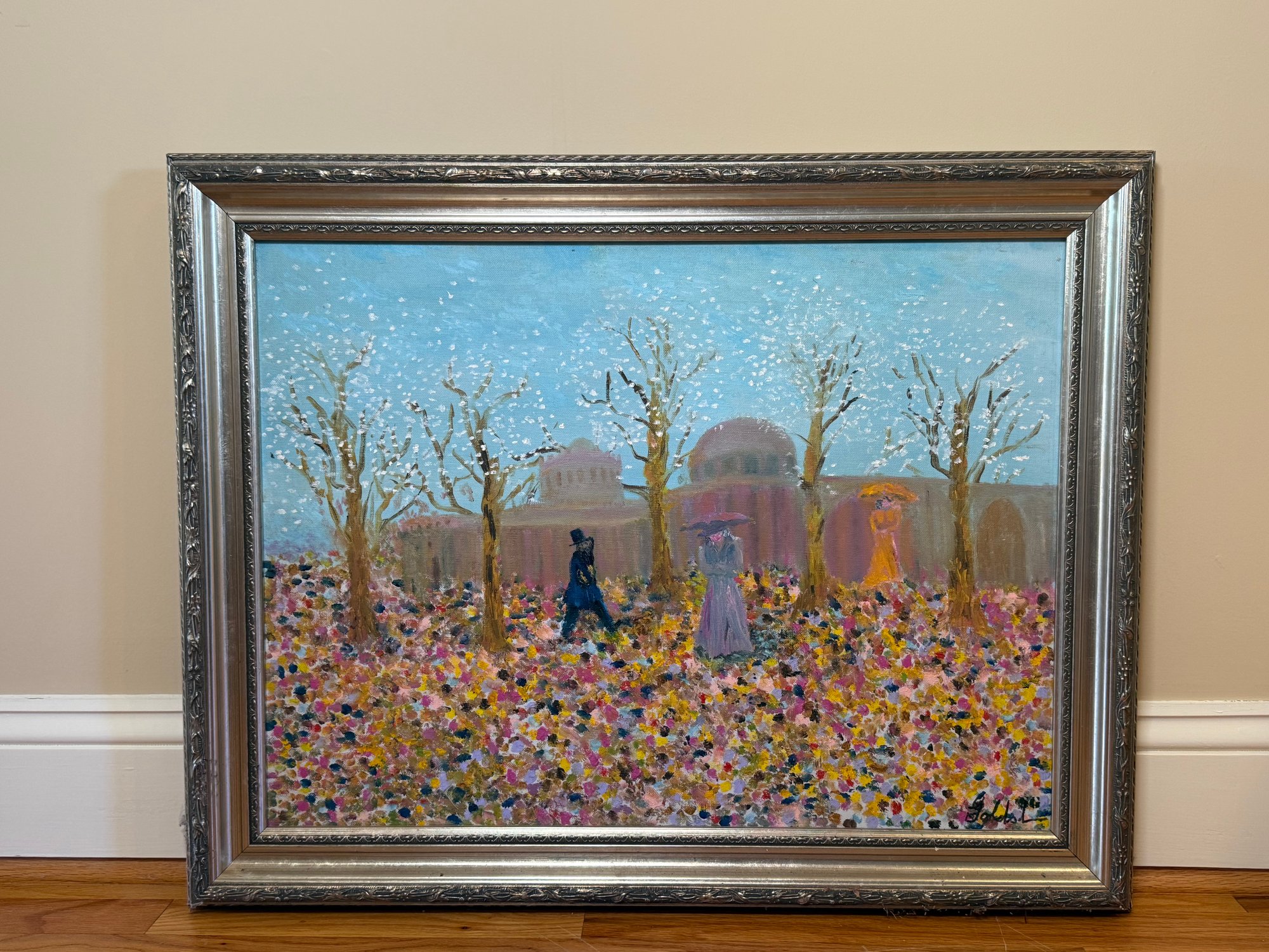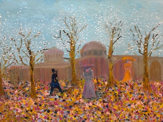 A stunning painting by Sydney Goldstein depicting a beautiful autumn morning with people greeting each other. This is a very uplifting creation. Signed lower right hand corner