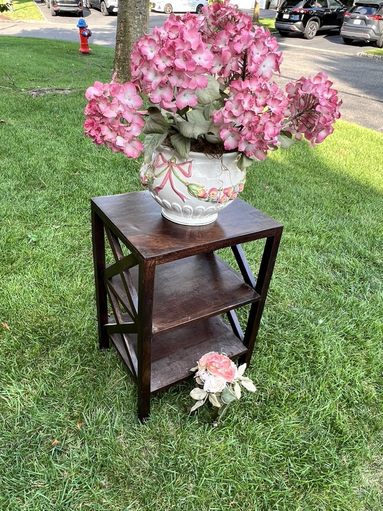 Table, Planter With Faux Flowers, Small Flowers On Stand