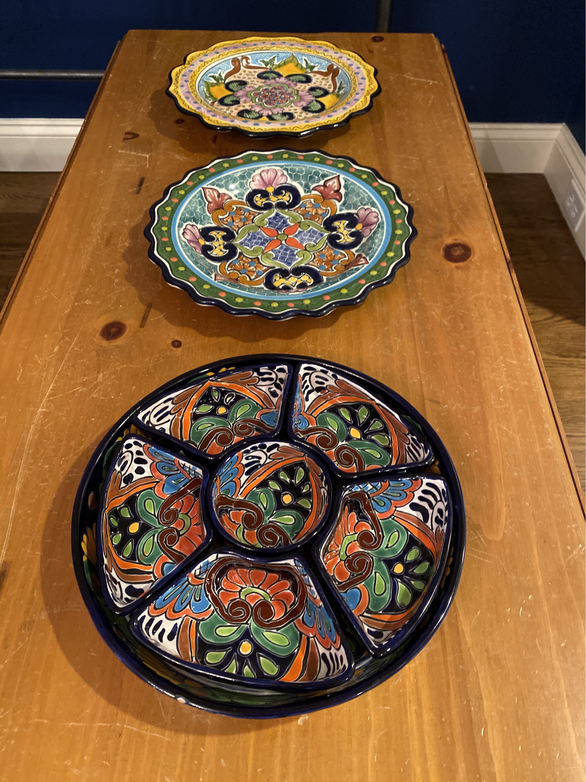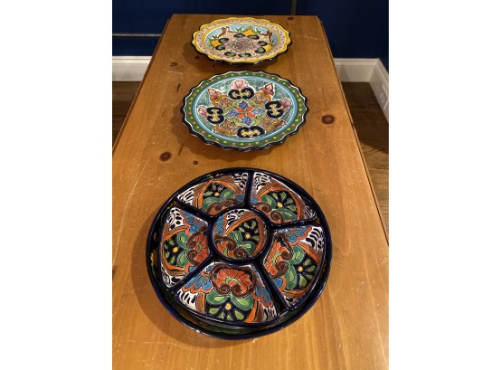 Hand painted Mexican tin-glazed earthenware. Two serving plates and chip dip set. 100% artisan handcrafted.