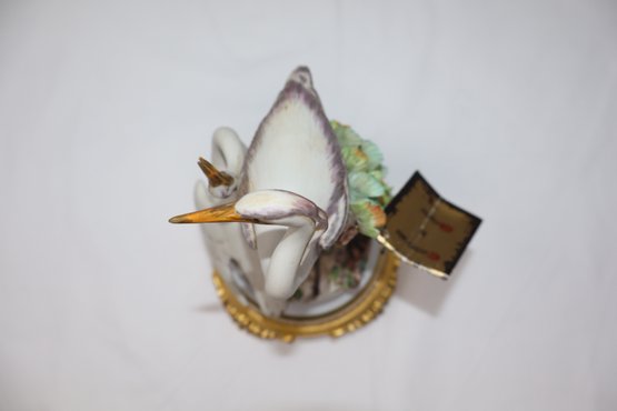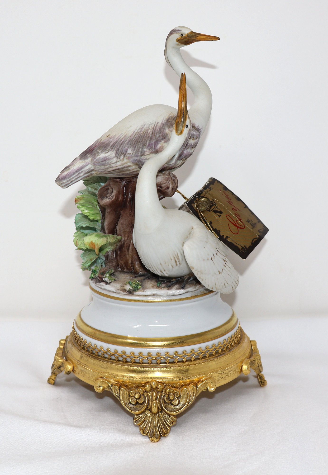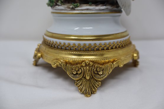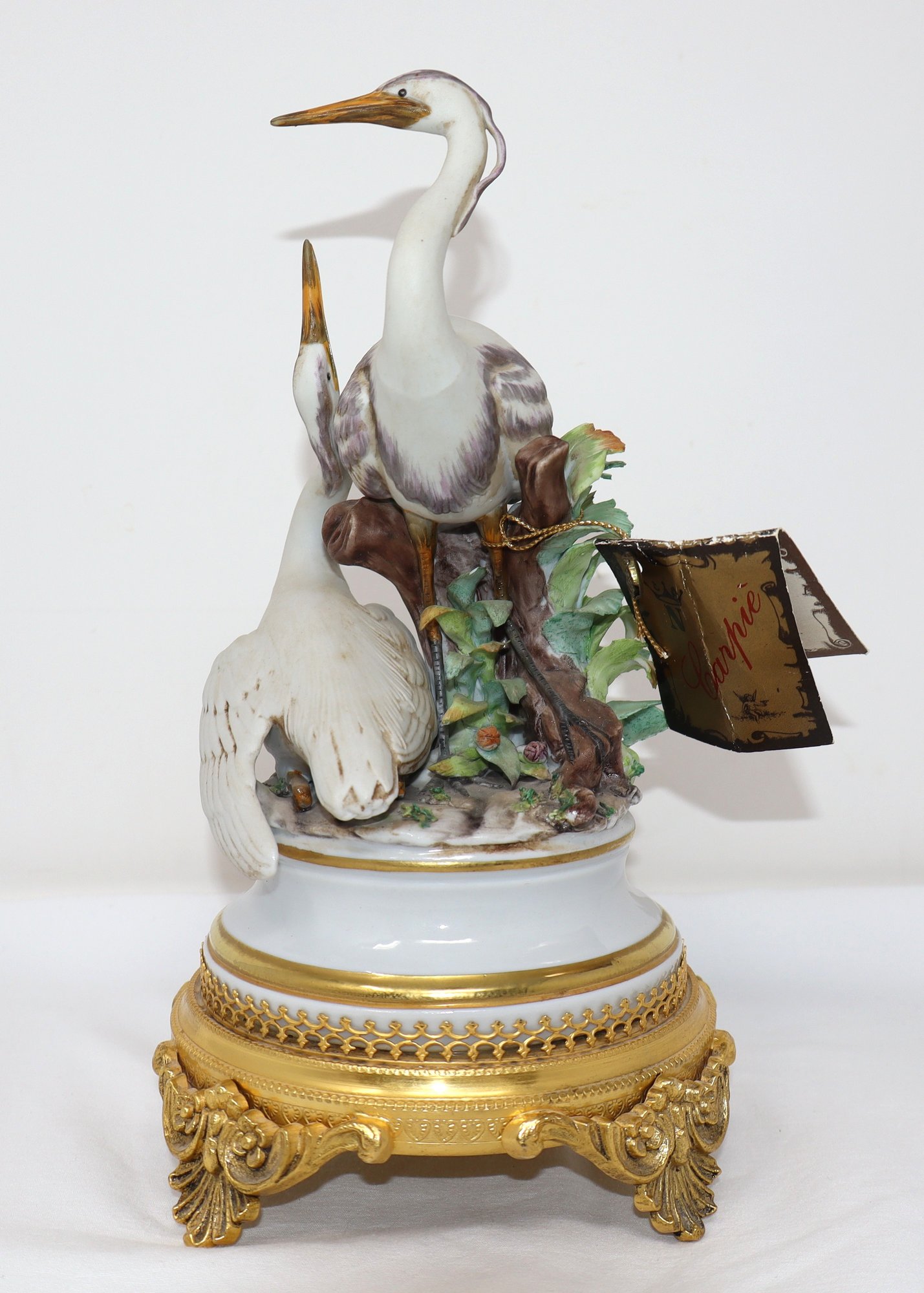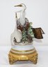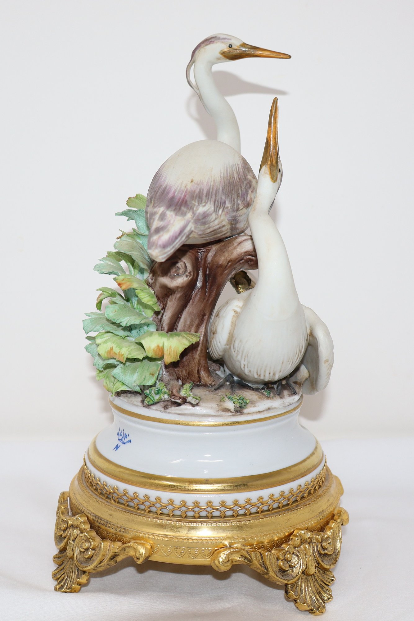 Two Herons are depicted amongst a tree stump & foliage mounted on an ormolu stand featuring 4 acanthus feet with floral motif
