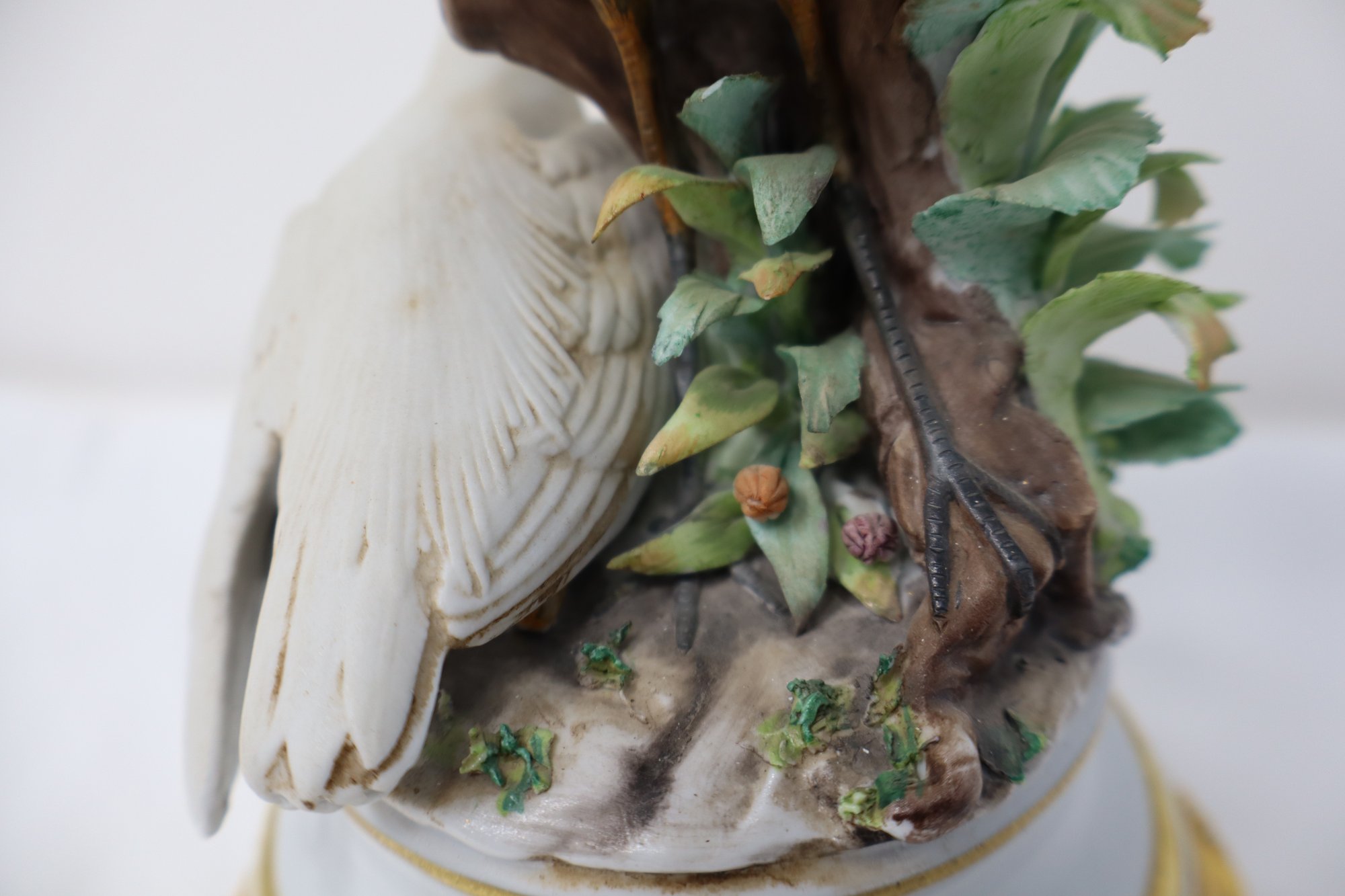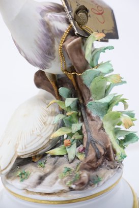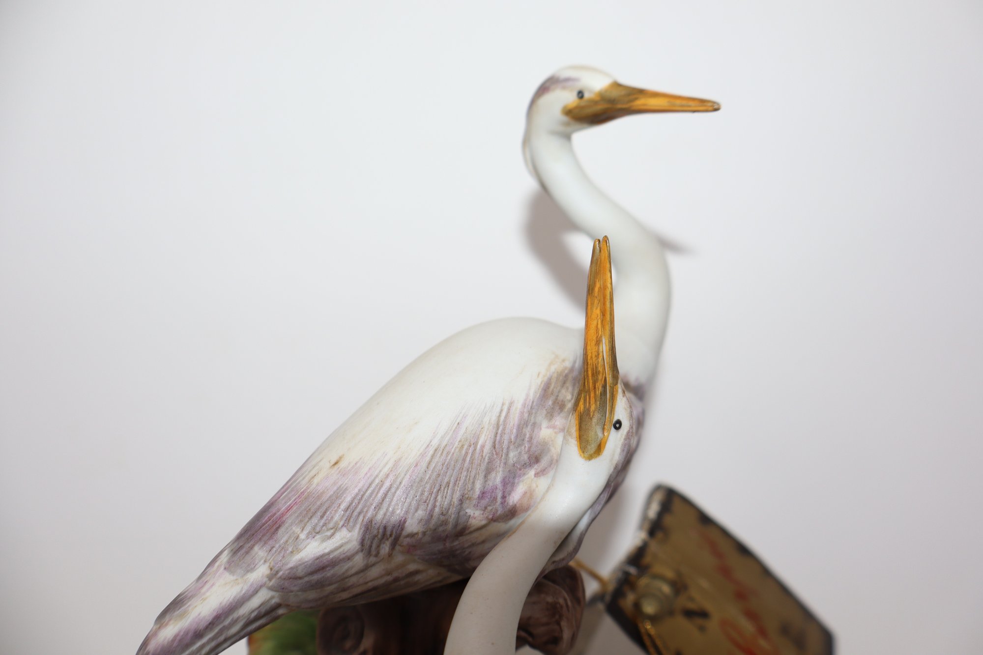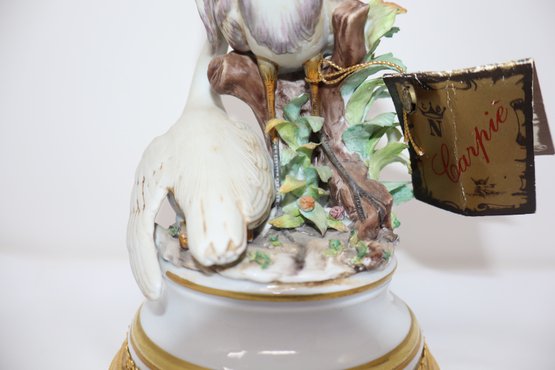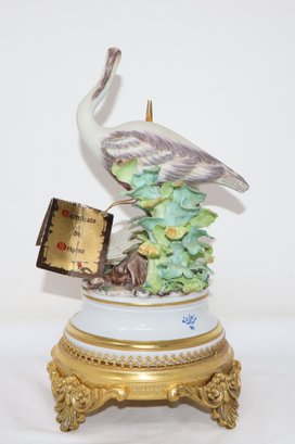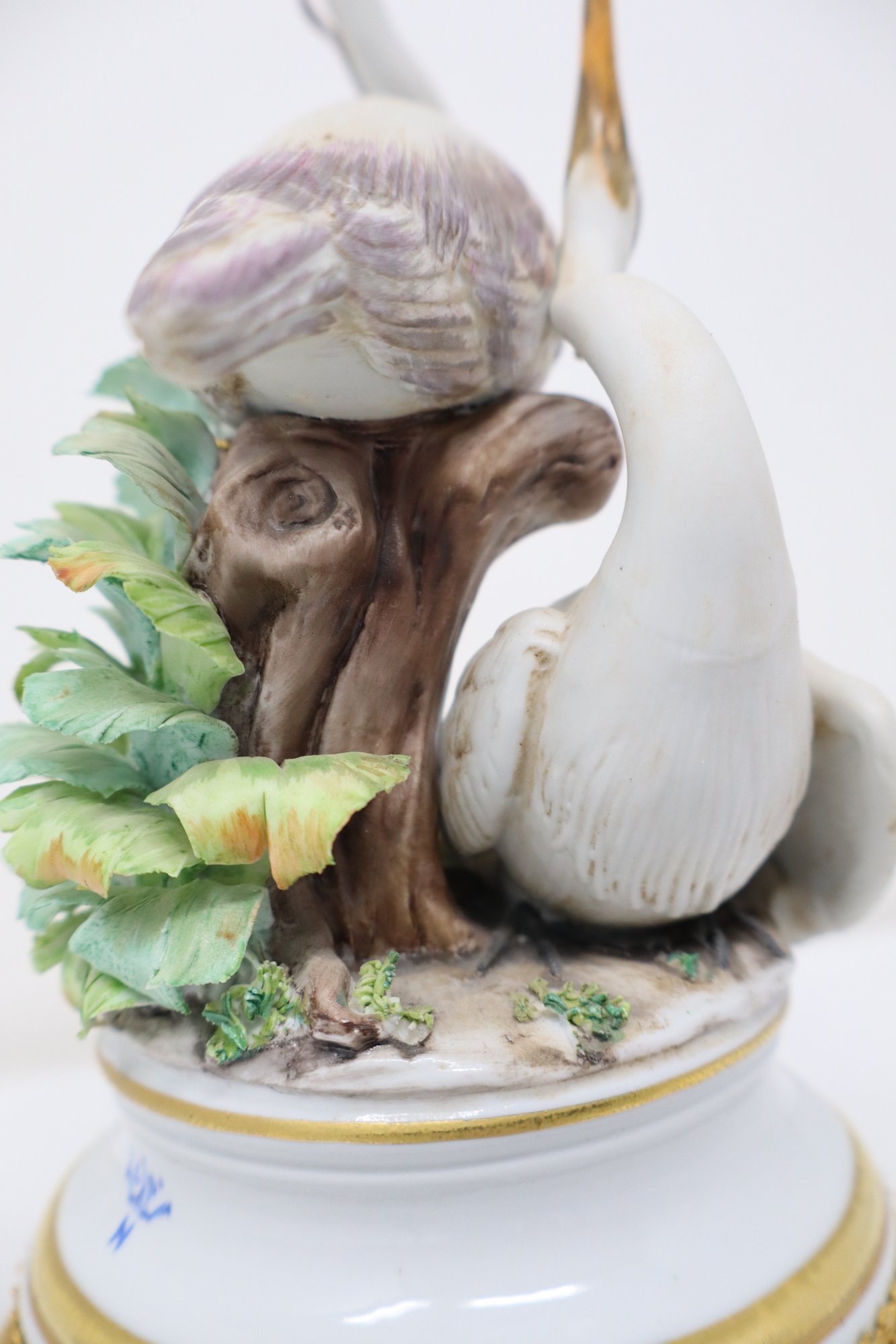 Two Herons are depicted amongst a tree stump & foliage mounted on an ormolu stand featuring 4 acanthus feet with floral motif