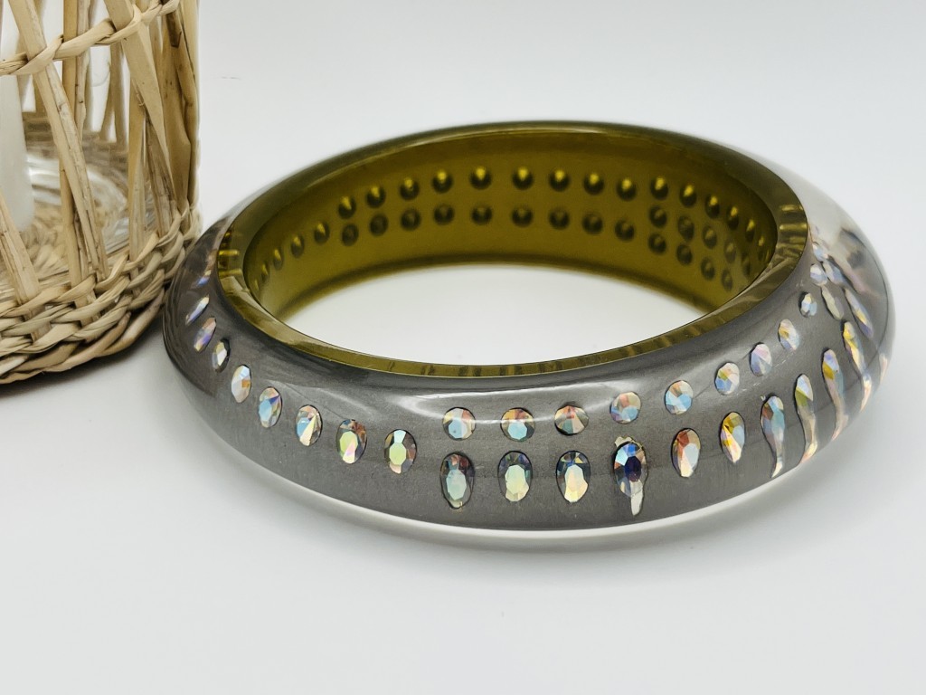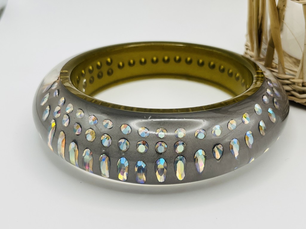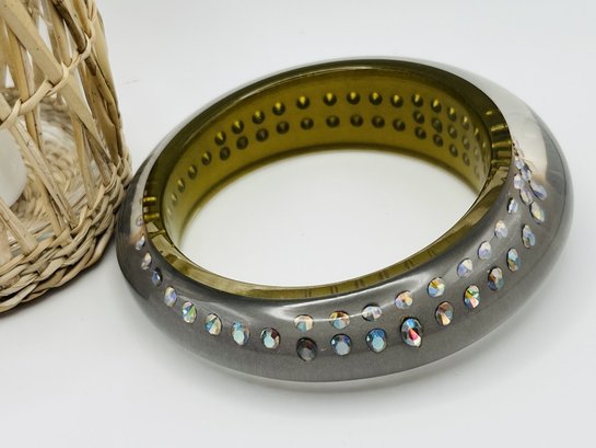 From Italy, this art deco gray Lucite crystal bangle is a show stopper!