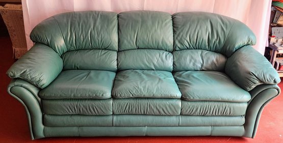 Italian Green Plush Leather Couch. Beautiful Green Color, Very Beautiful Soft Leather, Plush Pillow Backs, Armrests and Seat Cushions. Extremely Comfortable. There are two marks on the couch which can be filled with leather polish. Overall Very Good Condition. Please see all photos as part of the description and condition. 84"W x 42"D x 38"H / Seat 20"H