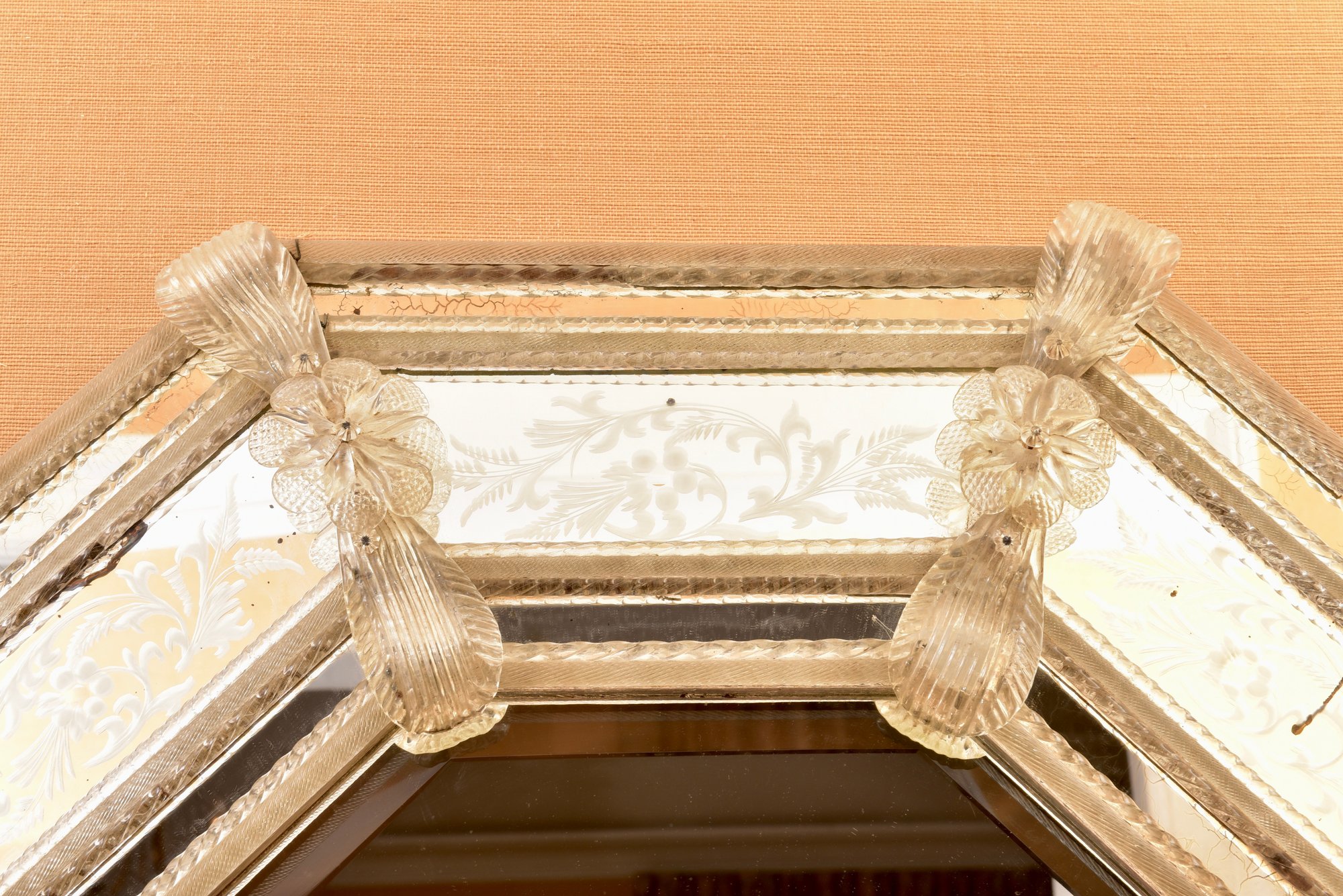 Octagonal Venetian-style mirror with etched glass panels and decorative rosettes, Italian, mid-20th century.