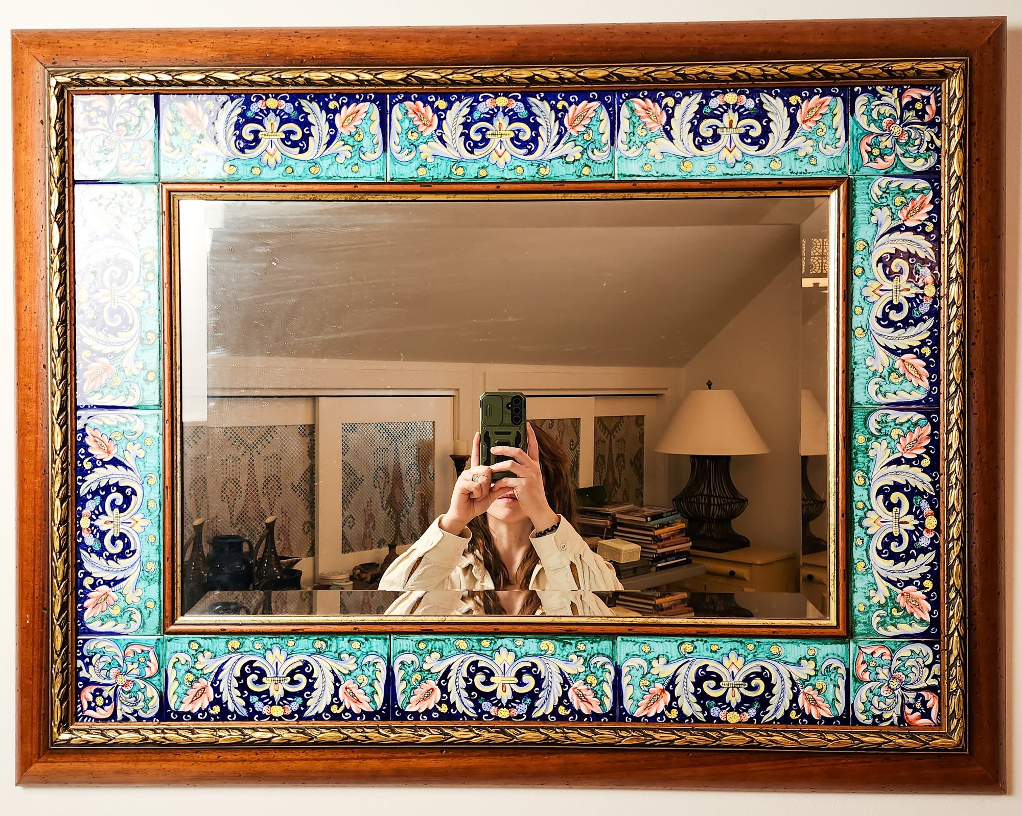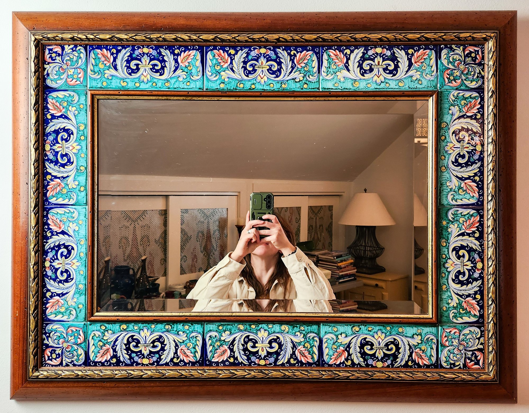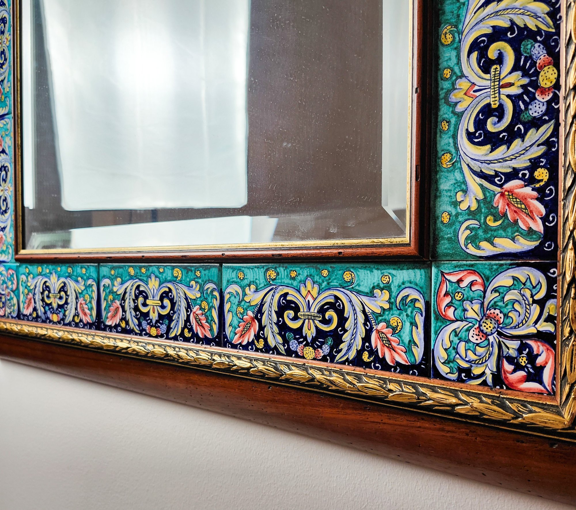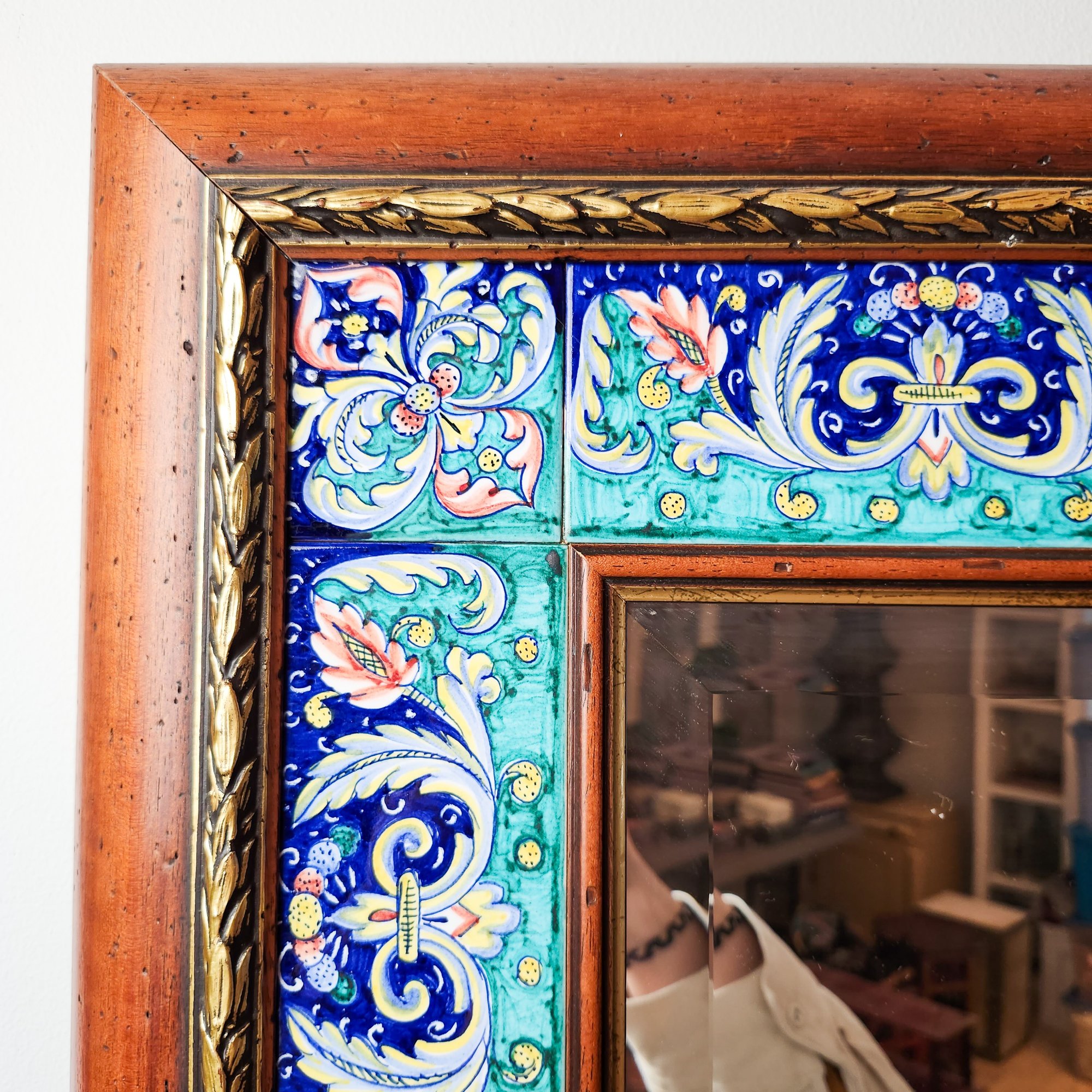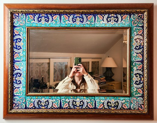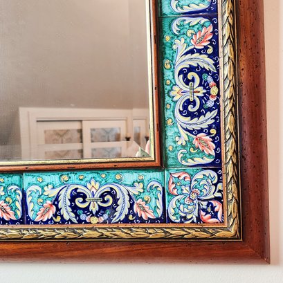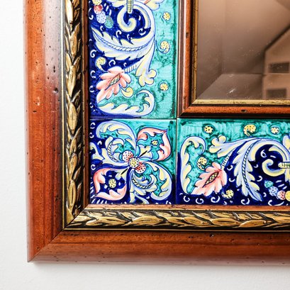 Great high quality beveled mirror with Deruta Italian tile surround and beautiful wooden frame.