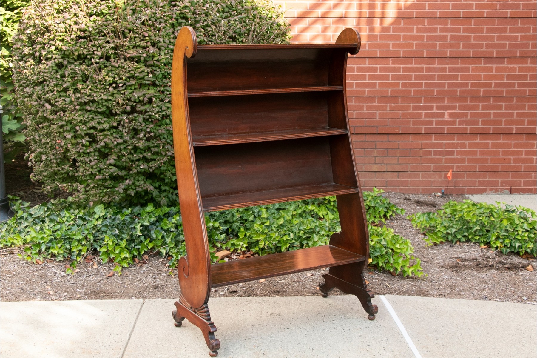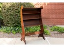Highly decorative scrolled and dark-stained wood bookcase with four shelves. Stands on wood ball feet.