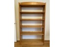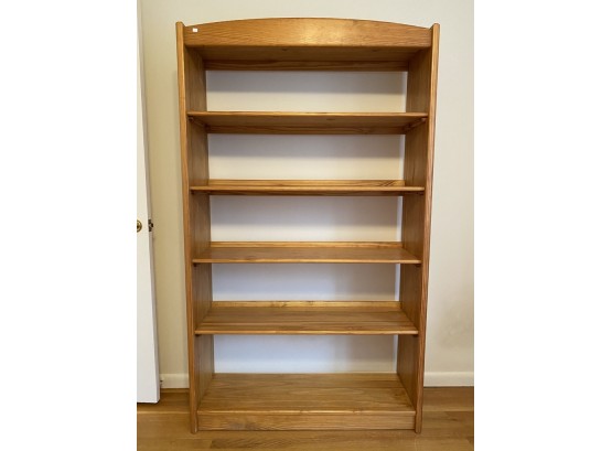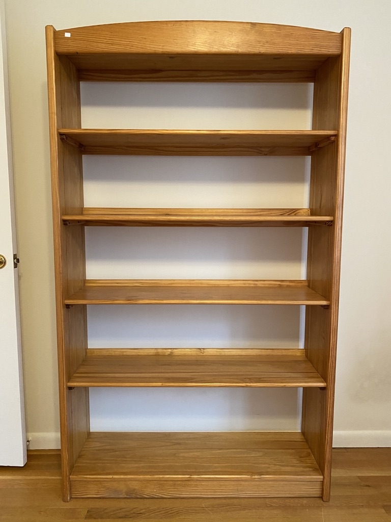 Varnished wood, curved top. Features 5 decently sized shelves, perfect for books, collectibles or storage. Good condition, light wear. Additional furniture pieces from this set are available in alternate lots.