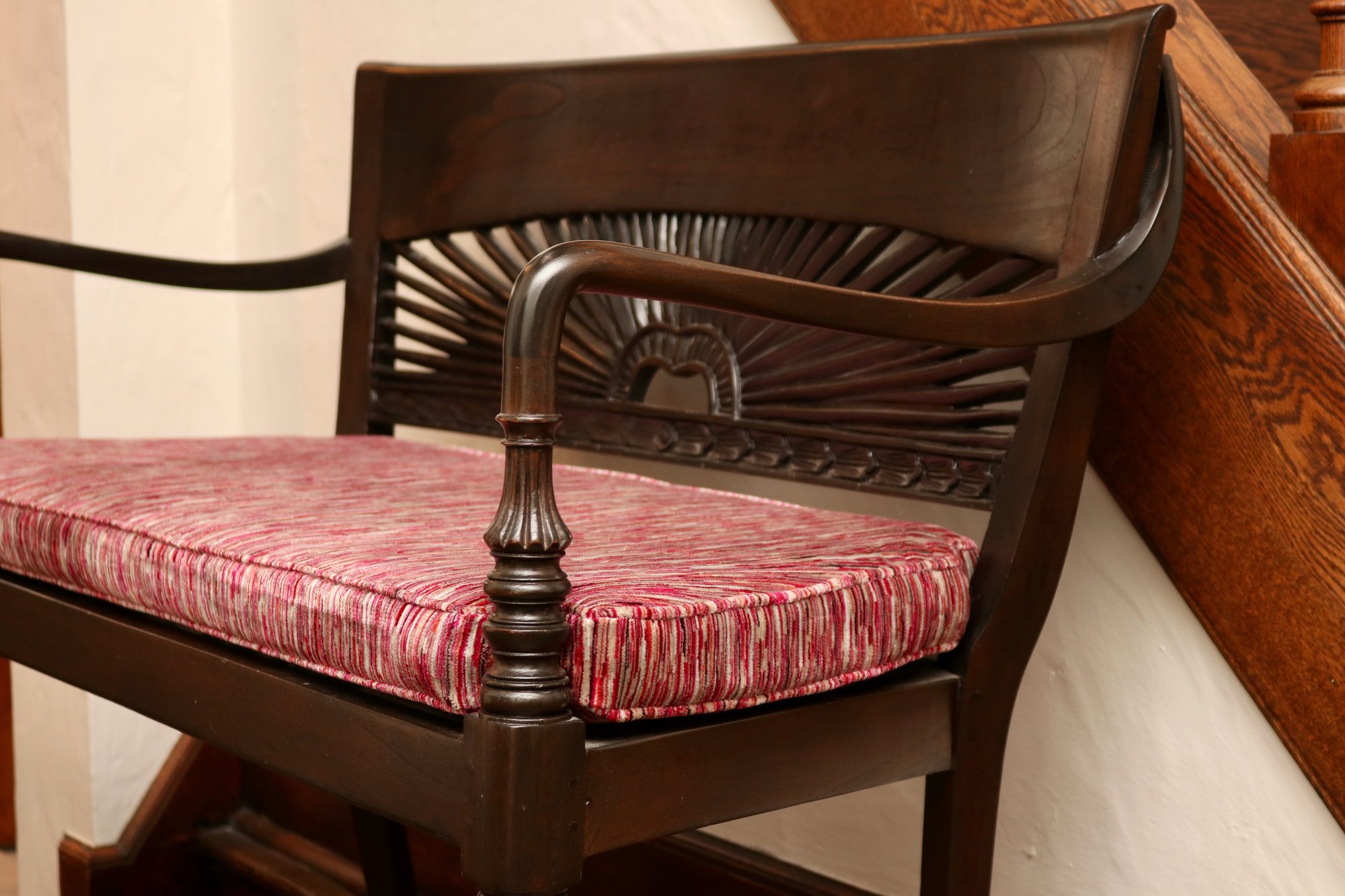 A seat that shines! This wooden settee blends traditional craftsmanship with vibrant design. The striking sunburst backrest adds an eye-catching focal point, while the textured upholstered seat in rich red and pink hues brings warmth and comfort. Fluted legs and curved arms complete the elegant look, making it a perfect addition to entryways, living rooms, or hallways.