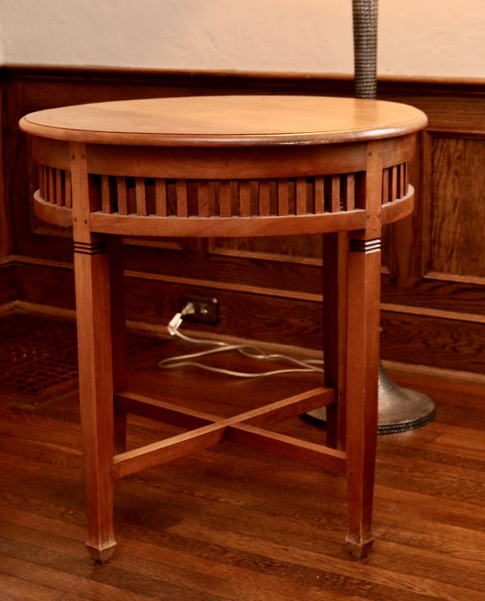 This occasional round side table reminiscent of the Wiener Wekstatte style in its geometric form and simplicity, exudes sophistication with its warm wood tone and unique slatted apron design. The sturdy cross-stretcher base provides both stability and a rustic charm, making this piece versatile for various interior styles. Whether used as a side table, accent table, or even a unique nightstand, this table adds warmth and character to any space.