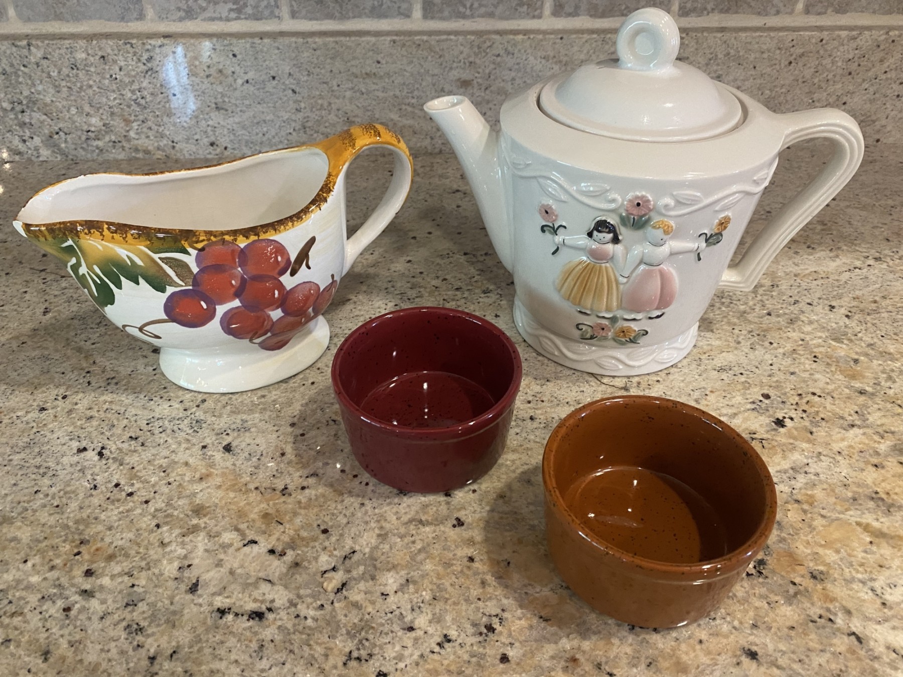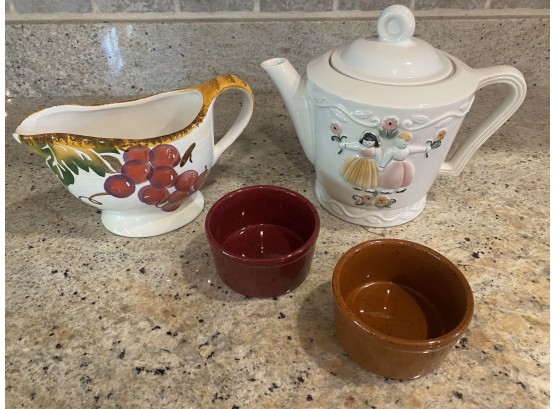 porcelain teapot made in USA, gravy boat by Potter & Smith and 4 ramekins (found 2 more)