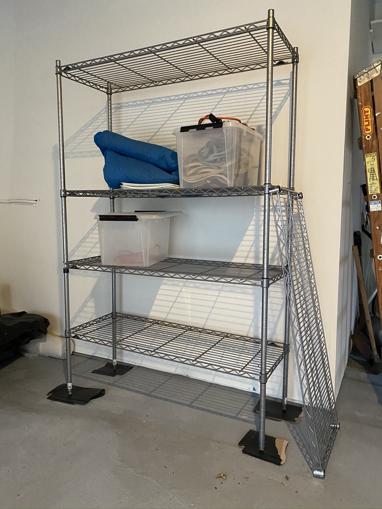 4-shelf storage as is, includes one additional shelf. Leans slightly. Contents not included.