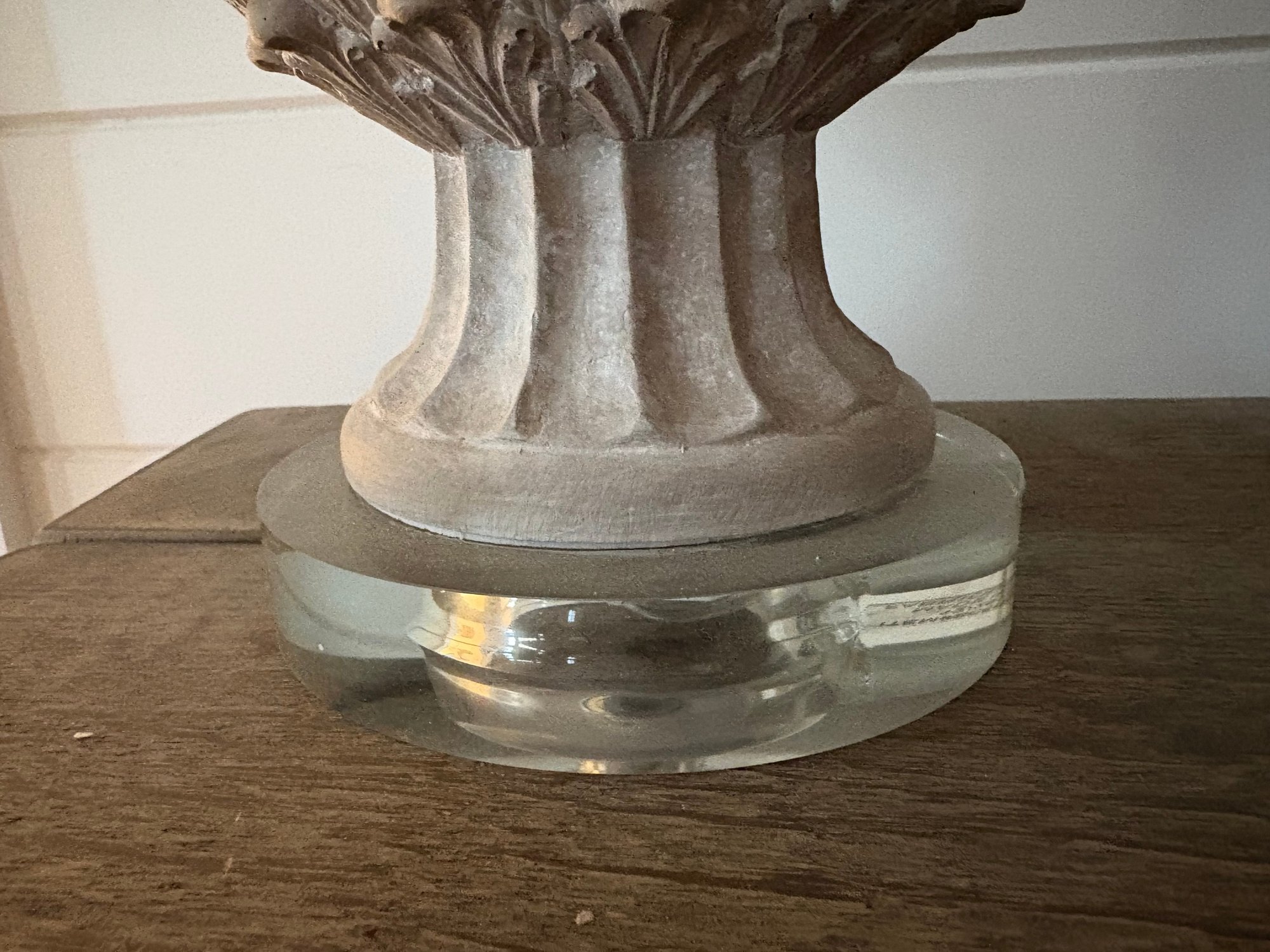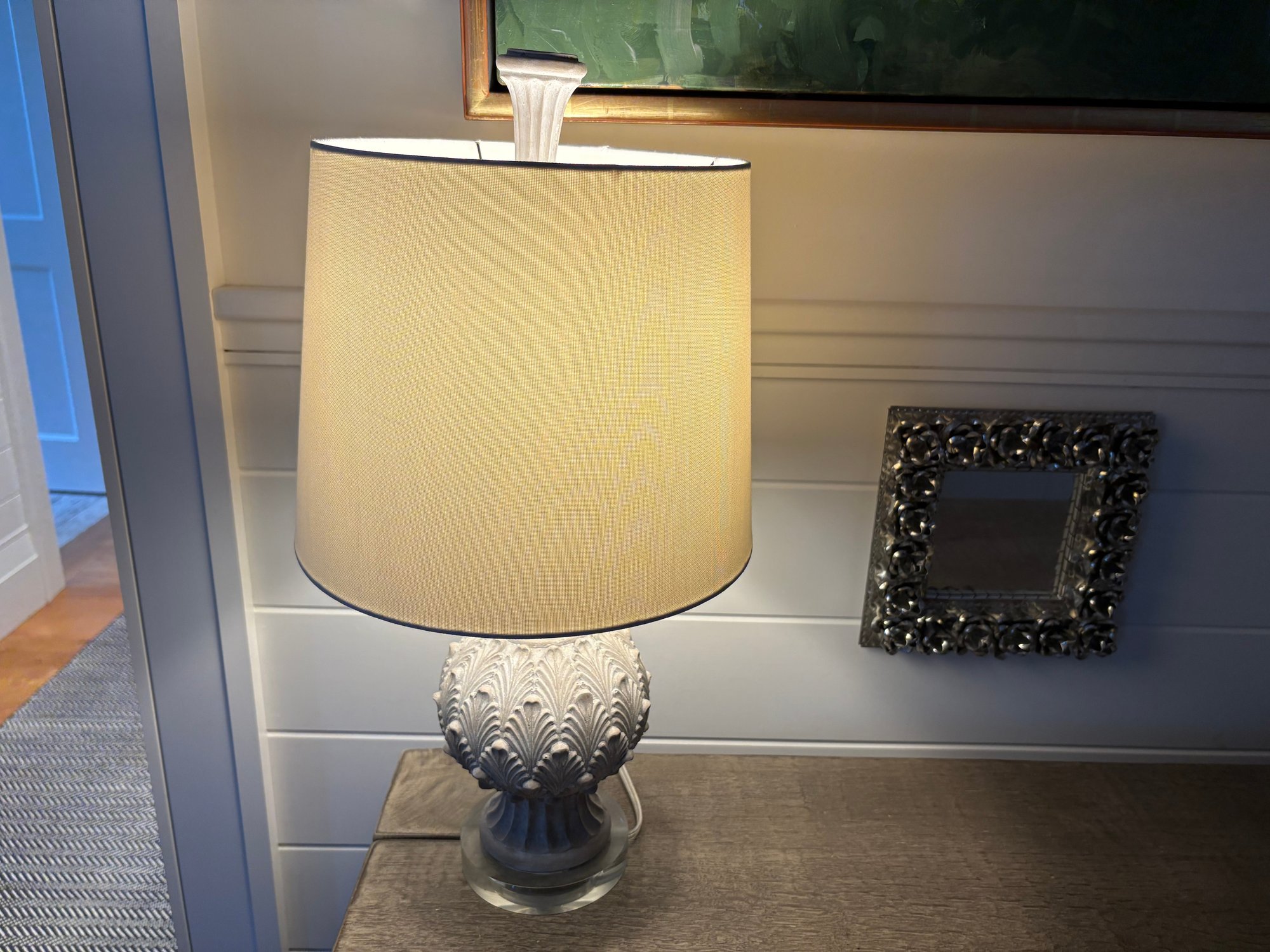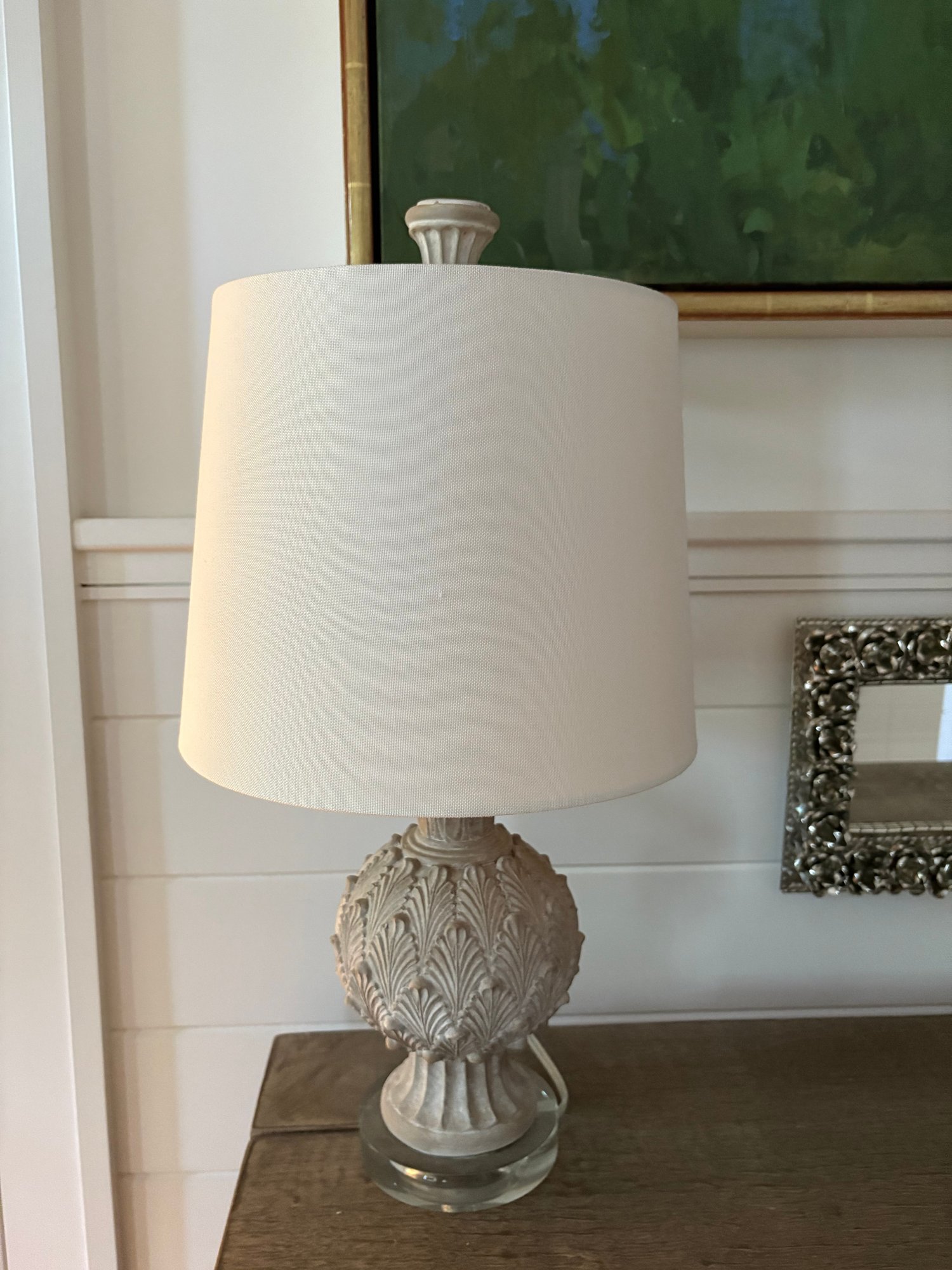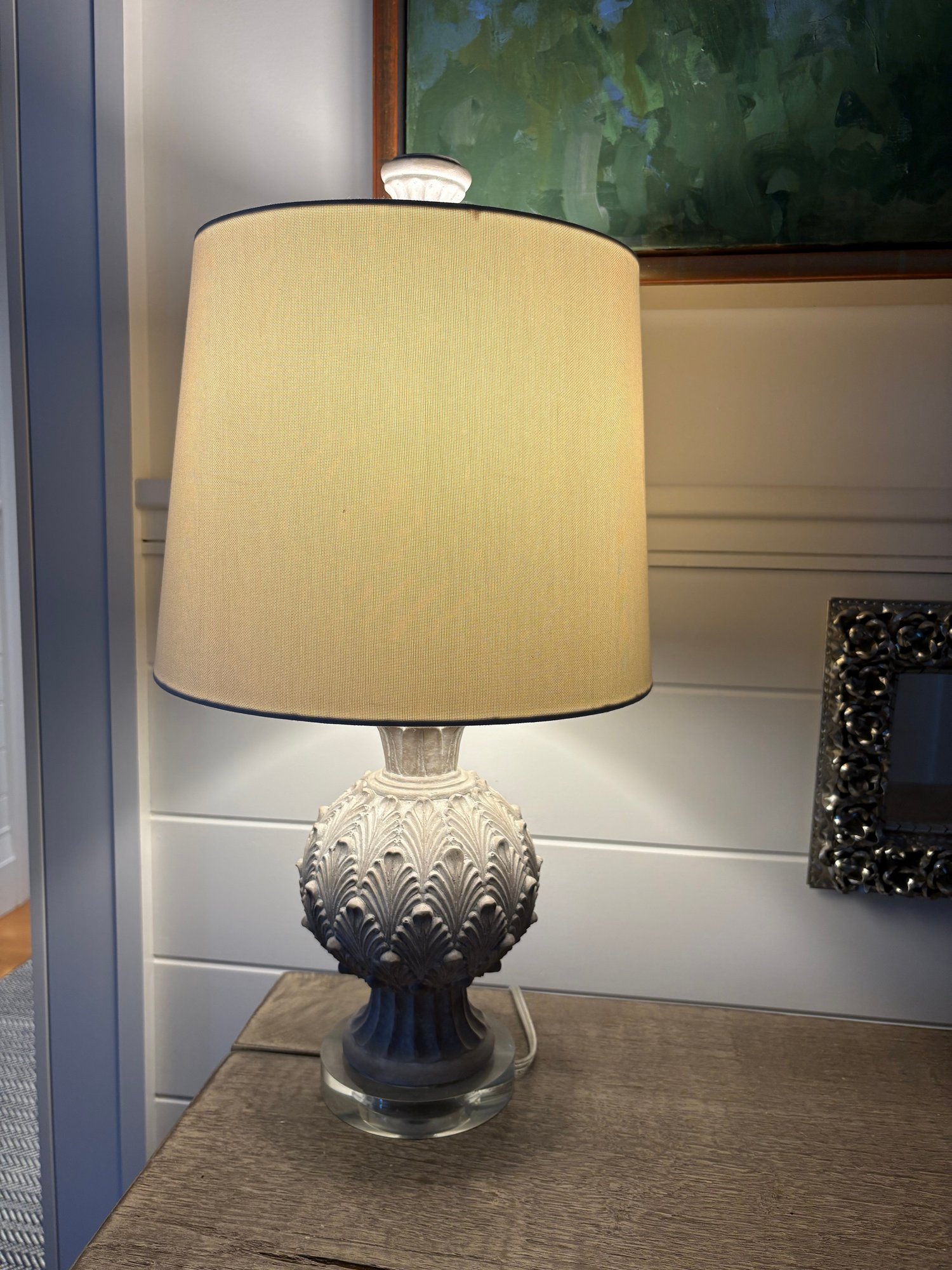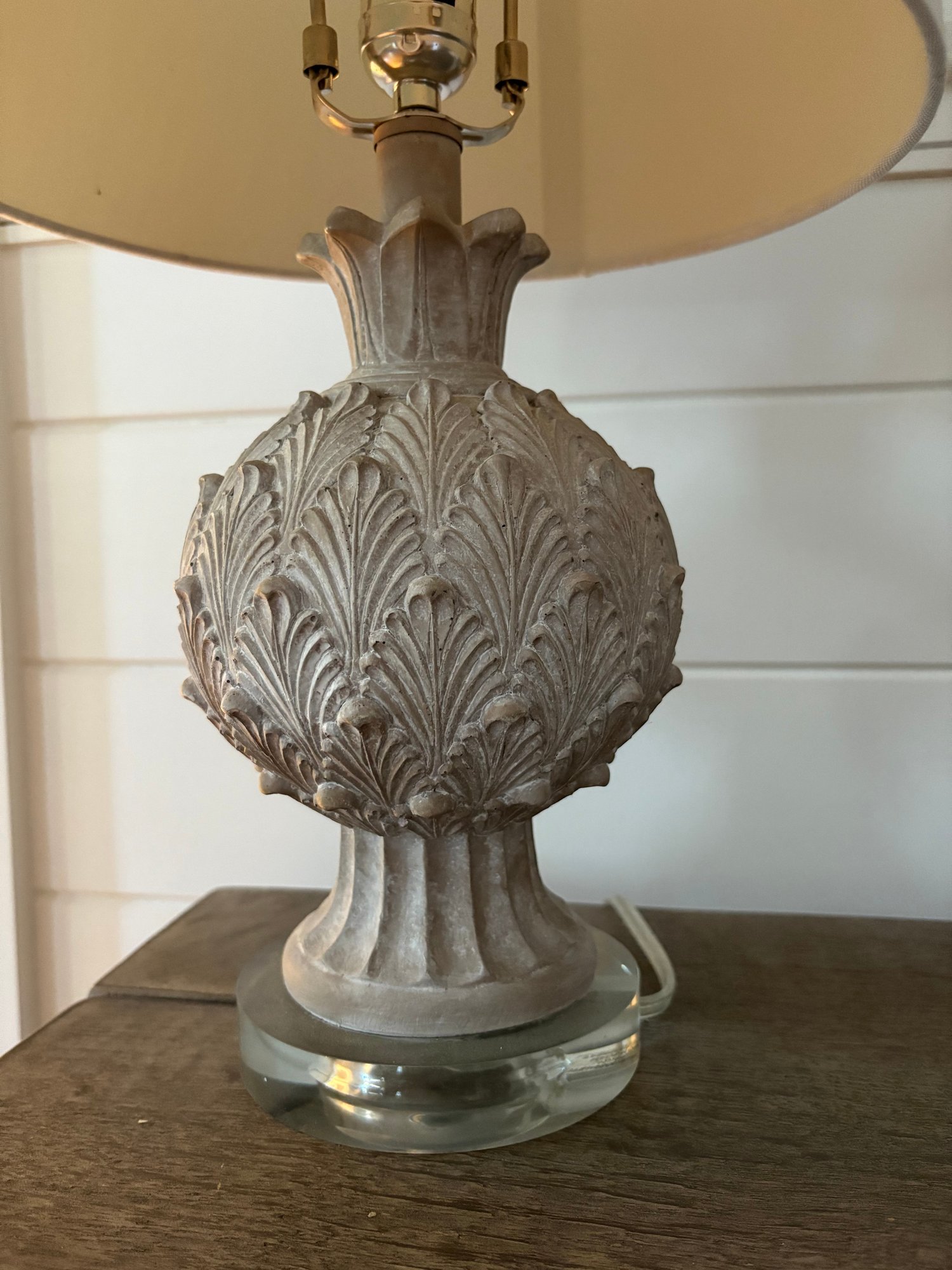 Attractive table lamp featuring a detailed, textured base resembling an artichoke, finished in a light color. The lamp has an off-white fabric shade and clear glass base.