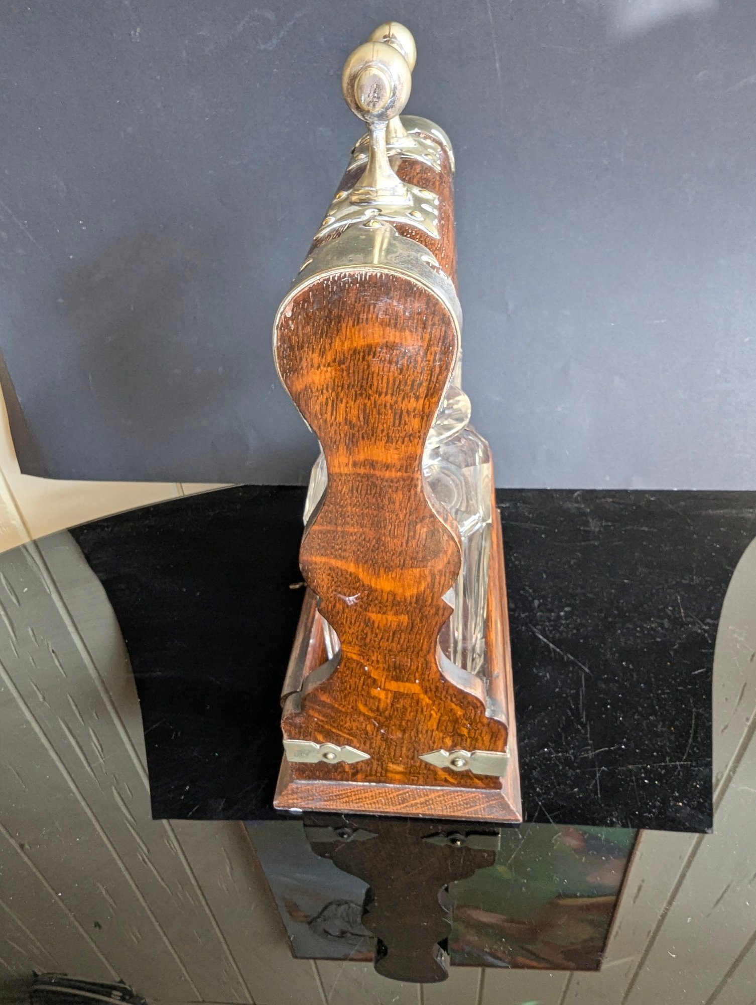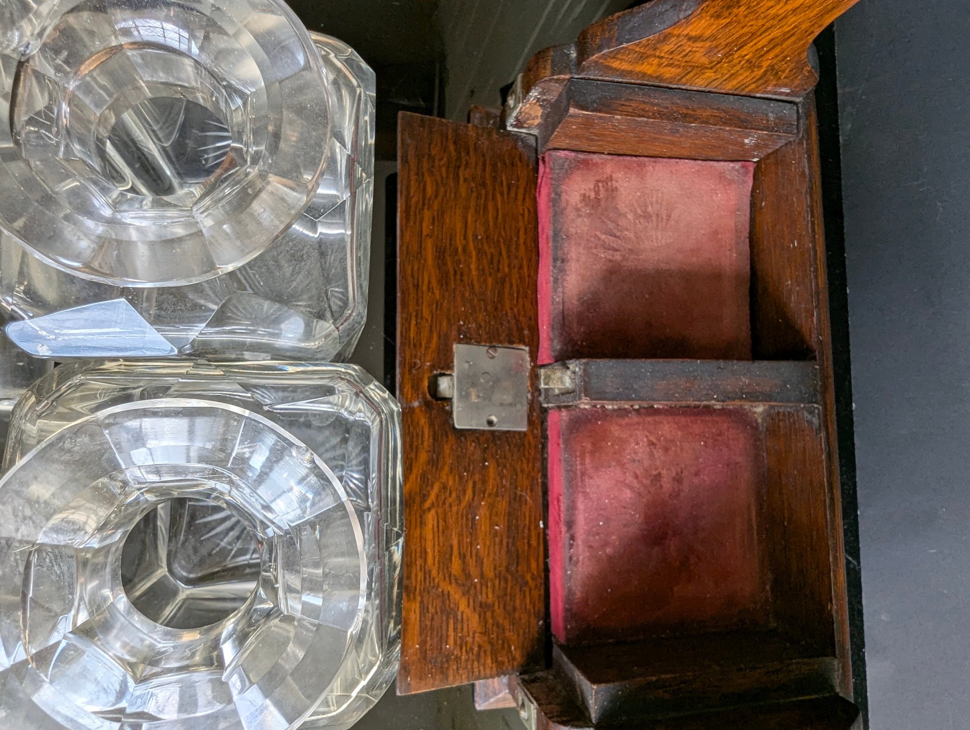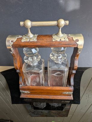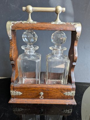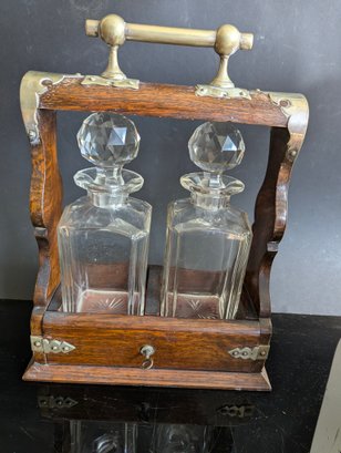 This magnificent piece is called "The Betjemann patent Tantalus". As the name indicates, it was manufactured by Betjemann prior to 1900. The "Tantalus" is an apparatus for locking decanters of drink away from the servants. The Tantalus is considered to be the most popular item manufactured by Betjemann. Interestingly, the concept of the Tantalus is said to have come from son John Betjemann's literary work "Diary of a Nobody". The Betjemann firm was a provider of very high-end craftsmanship that catered to the likes of Aspreys, and Harrods in London. This example is made of wood with a locking metal top, the lock is a Bramah lock top makers for quality in England so this must be a quality item--the top is probably brass having been nickel plated-- the base is a lovely grained oak wood with fine grain. It has two individual boxes for keeping the decanters separated. The decanters and stoppers are original to the set. The decanters are hand blown, with the base with a star pattern . The stoppers are multi-faceted or diamond cut and a ground fit. This piece is in excellent condition, with only a couple very small fleabite's in the glass, on the lip of one decanter a slight chip, and slight rub w the metal top probably rubbed against the stoppers when the apparatus was opened or closed. This Tantalus measures 10" long by 5"1/8" wide and is 11"1/2" tall (to the top of the handle). It is marked (see photos) and the number 23626 appears on the apparatus. It also has the original working Bramah lock and key. t is a nut which holds the lock missing see photos Presume that the plaque for Ross of Glasgow is the retailer When I first tried to open the lock did not seem to work tried it for ages but the secret is as in the last photos you slide the lock down after unlocking