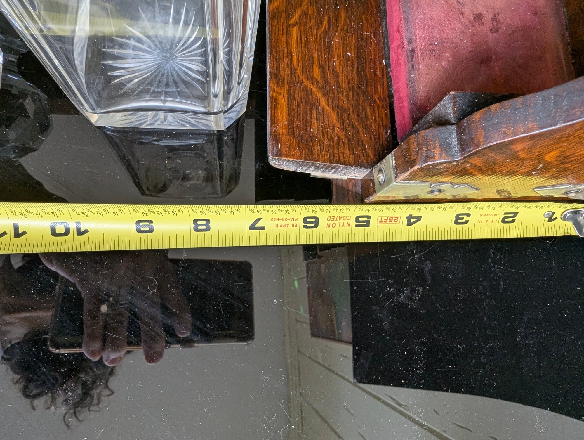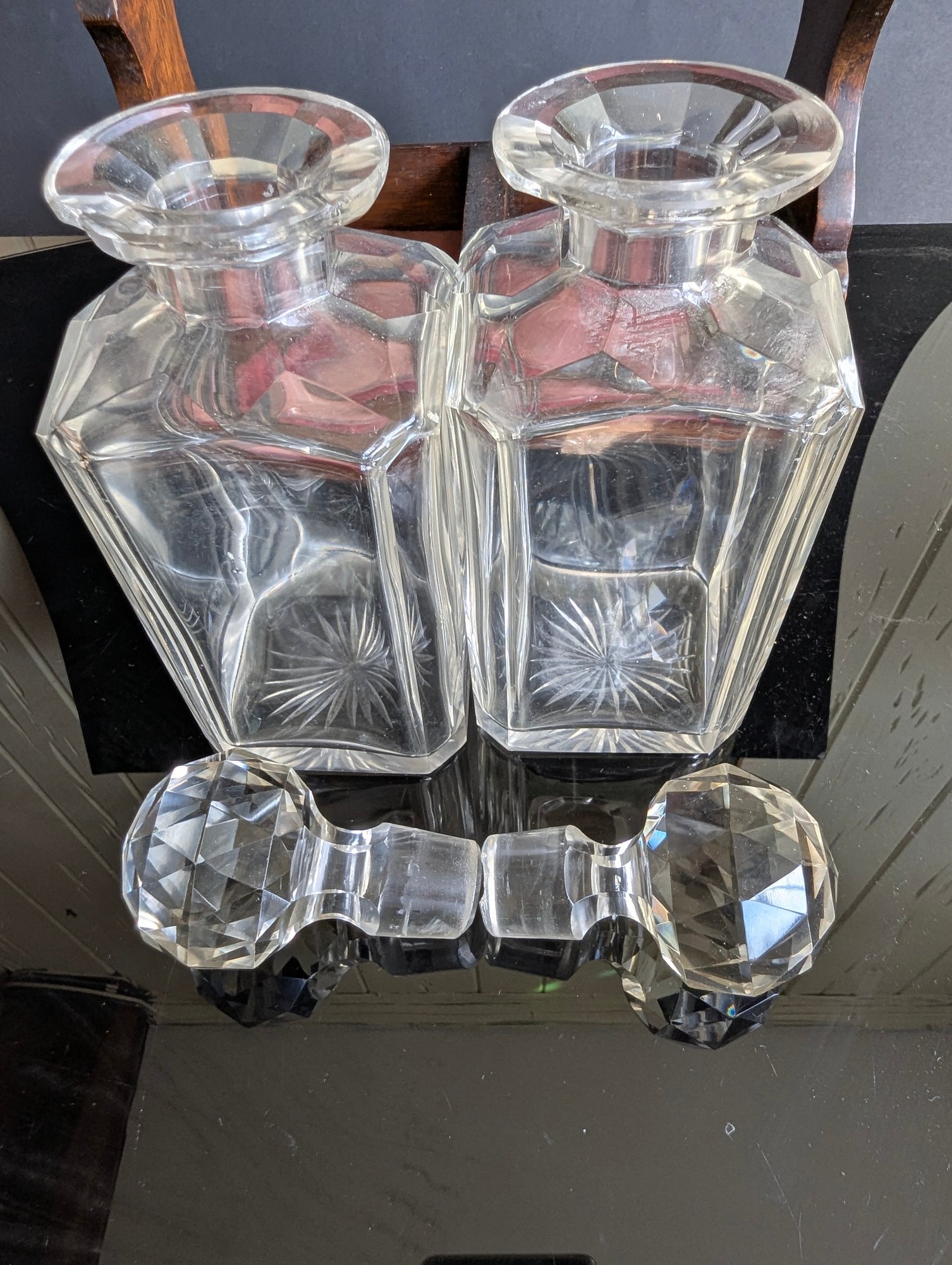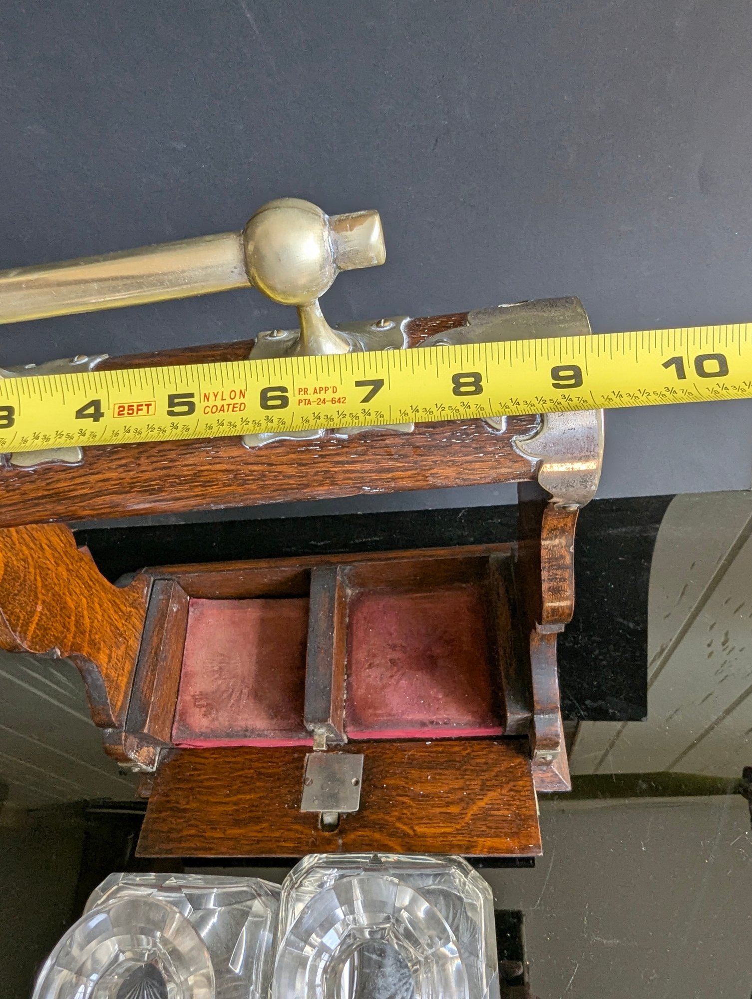 This magnificent piece is called "The Betjemann patent Tantalus". As the name indicates, it was manufactured by Betjemann prior to 1900. The "Tantalus" is an apparatus for locking decanters of drink away from the servants. The Tantalus is considered to be the most popular item manufactured by Betjemann. Interestingly, the concept of the Tantalus is said to have come from son John Betjemann's literary work "Diary of a Nobody". The Betjemann firm was a provider of very high-end craftsmanship that catered to the likes of Aspreys, and Harrods in London. This example is made of wood with a locking metal top, the lock is a Bramah lock top makers for quality in England so this must be a quality item--the top is probably brass having been nickel plated-- the base is a lovely grained oak wood with fine grain. It has two individual boxes for keeping the decanters separated. The decanters and stoppers are original to the set. The decanters are hand blown, with the base with a star pattern . The stoppers are multi-faceted or diamond cut and a ground fit. This piece is in excellent condition, with only a couple very small fleabite's in the glass, on the lip of one decanter a slight chip, and slight rub w the metal top probably rubbed against the stoppers when the apparatus was opened or closed. This Tantalus measures 10" long by 5"1/8" wide and is 11"1/2" tall (to the top of the handle). It is marked (see photos) and the number 23626 appears on the apparatus. It also has the original working Bramah lock and key. t is a nut which holds the lock missing see photos Presume that the plaque for Ross of Glasgow is the retailer When I first tried to open the lock did not seem to work tried it for ages but the secret is as in the last photos you slide the lock down after unlocking