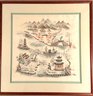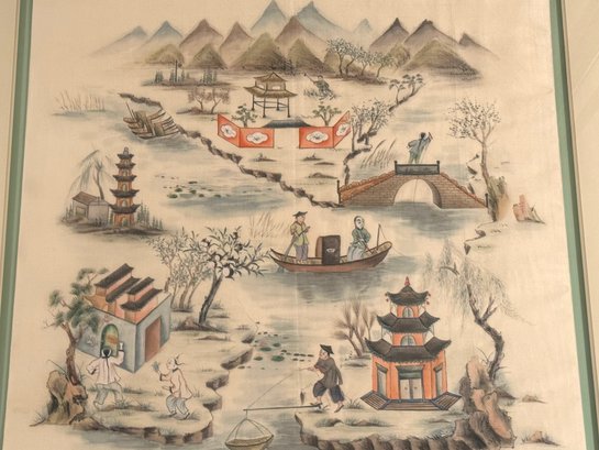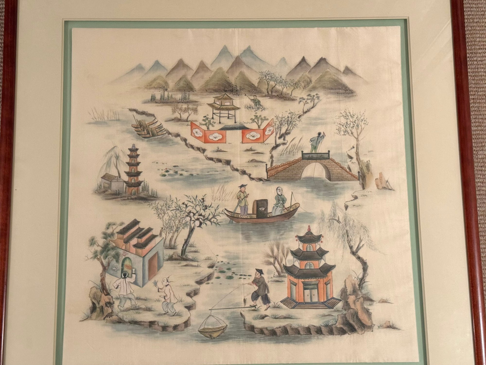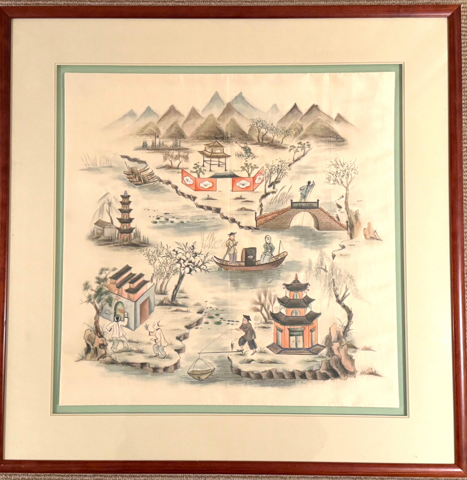 Sweet and lovely scene of fisherman painted on silk framed, raised and floating on a celadon background under a wide beveled matt. This works to highlight the water tone and create a three dimensional effect.