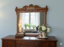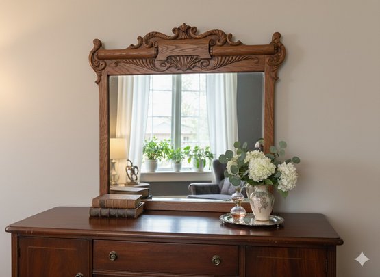 Provenance & Style A masterful intersection of late-Victorian craftsmanship and early 20th-century architectural flair. This statement piece features a high-relief hand-carved pediment showcasing traditional shell motifs and scrolled volutes characteristic of the bespoke woodwork found in the grand estates of the Gilded Age.