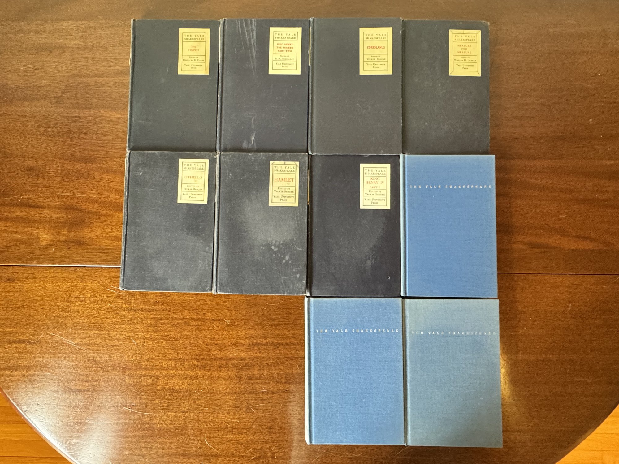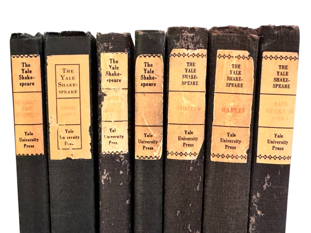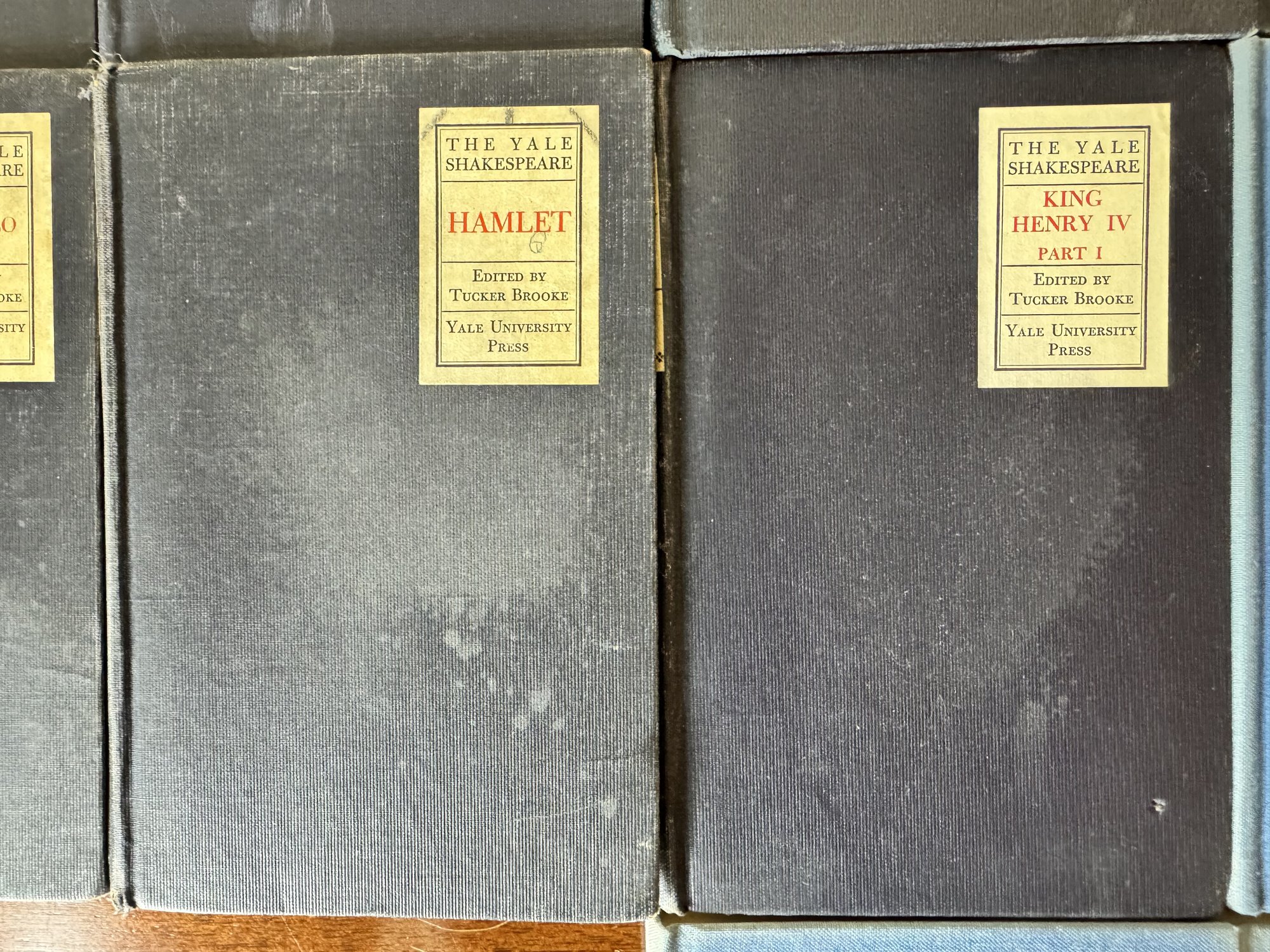 A grouping of The Yale Shakespeare editions published by Yale University Press, including multiple classic plays edited by Tucker Brooke and others. Copyright pages indicate 1917 / 1947 printings.