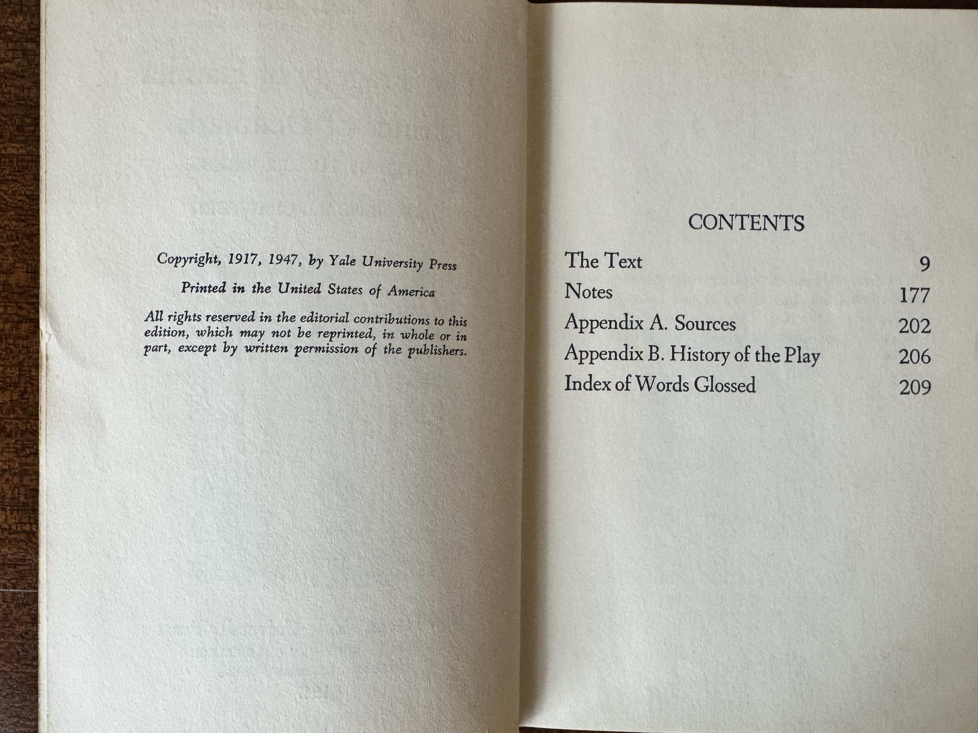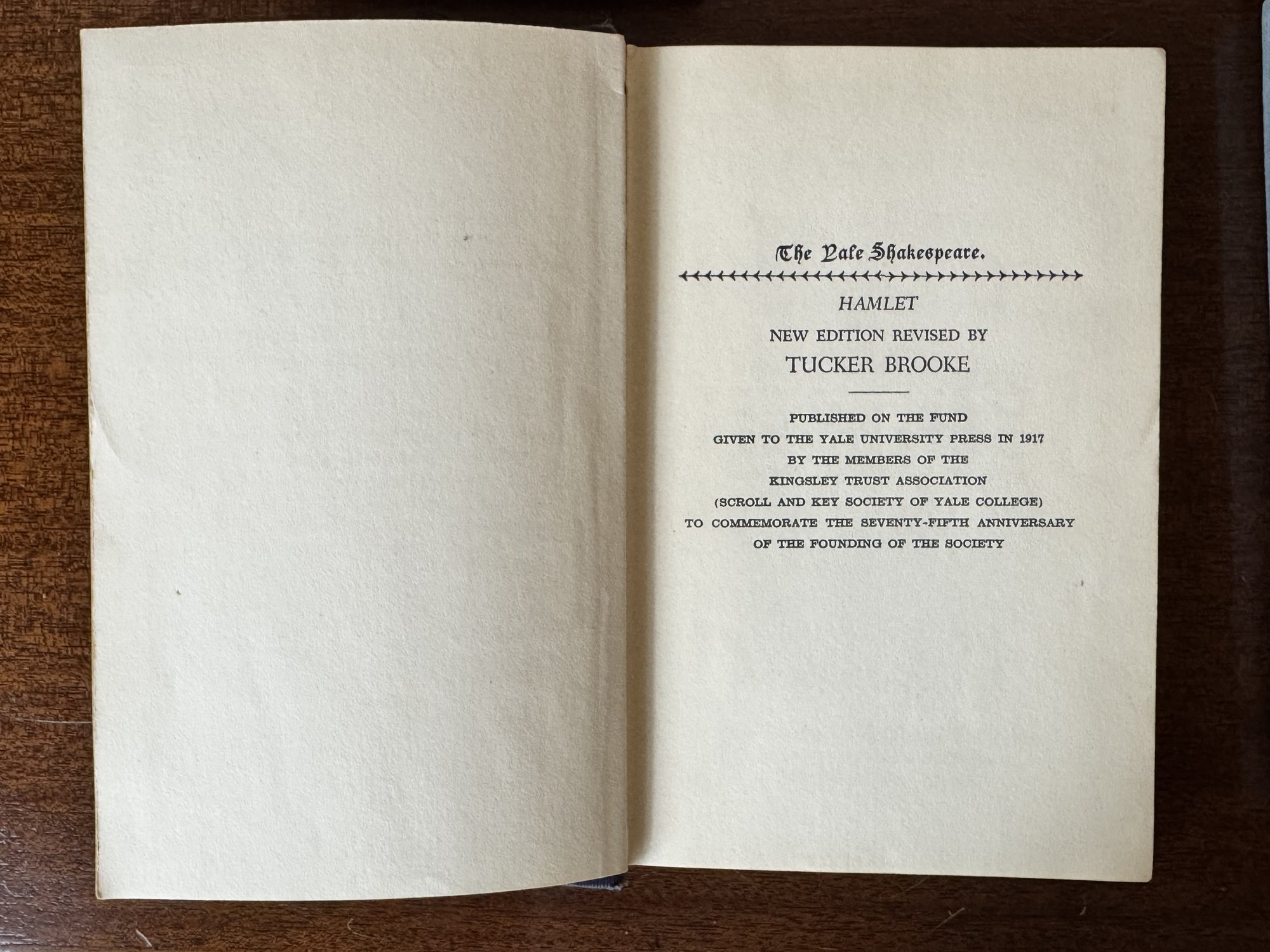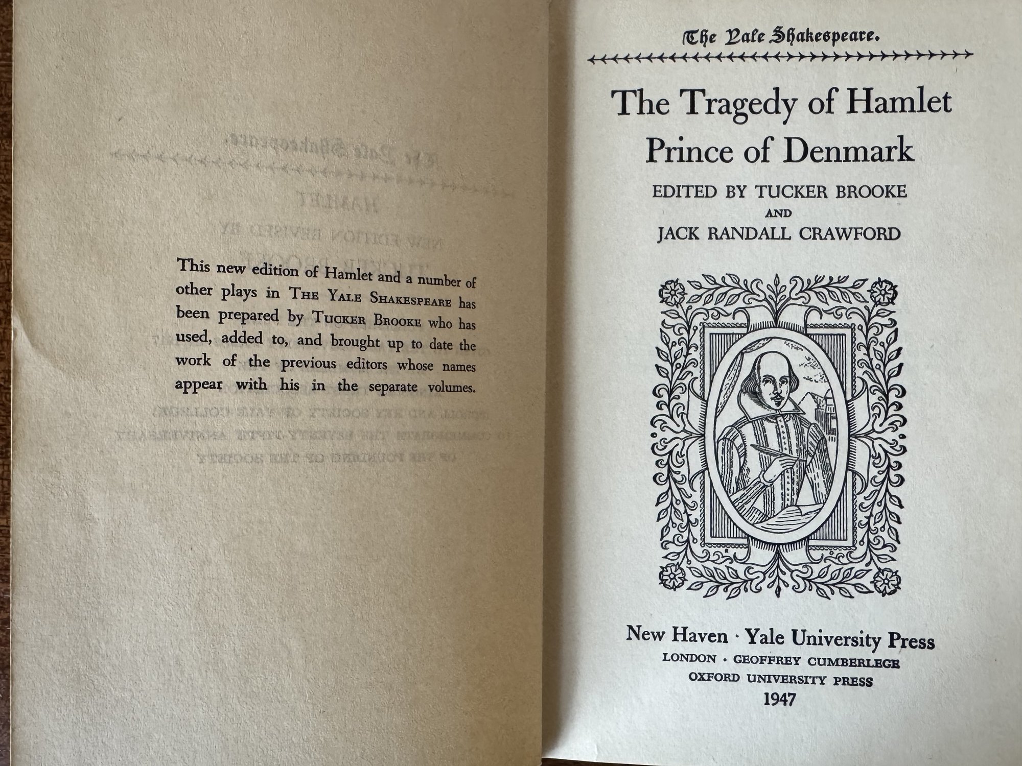 A grouping of The Yale Shakespeare editions published by Yale University Press, including multiple classic plays edited by Tucker Brooke and others. Copyright pages indicate 1917 / 1947 printings.