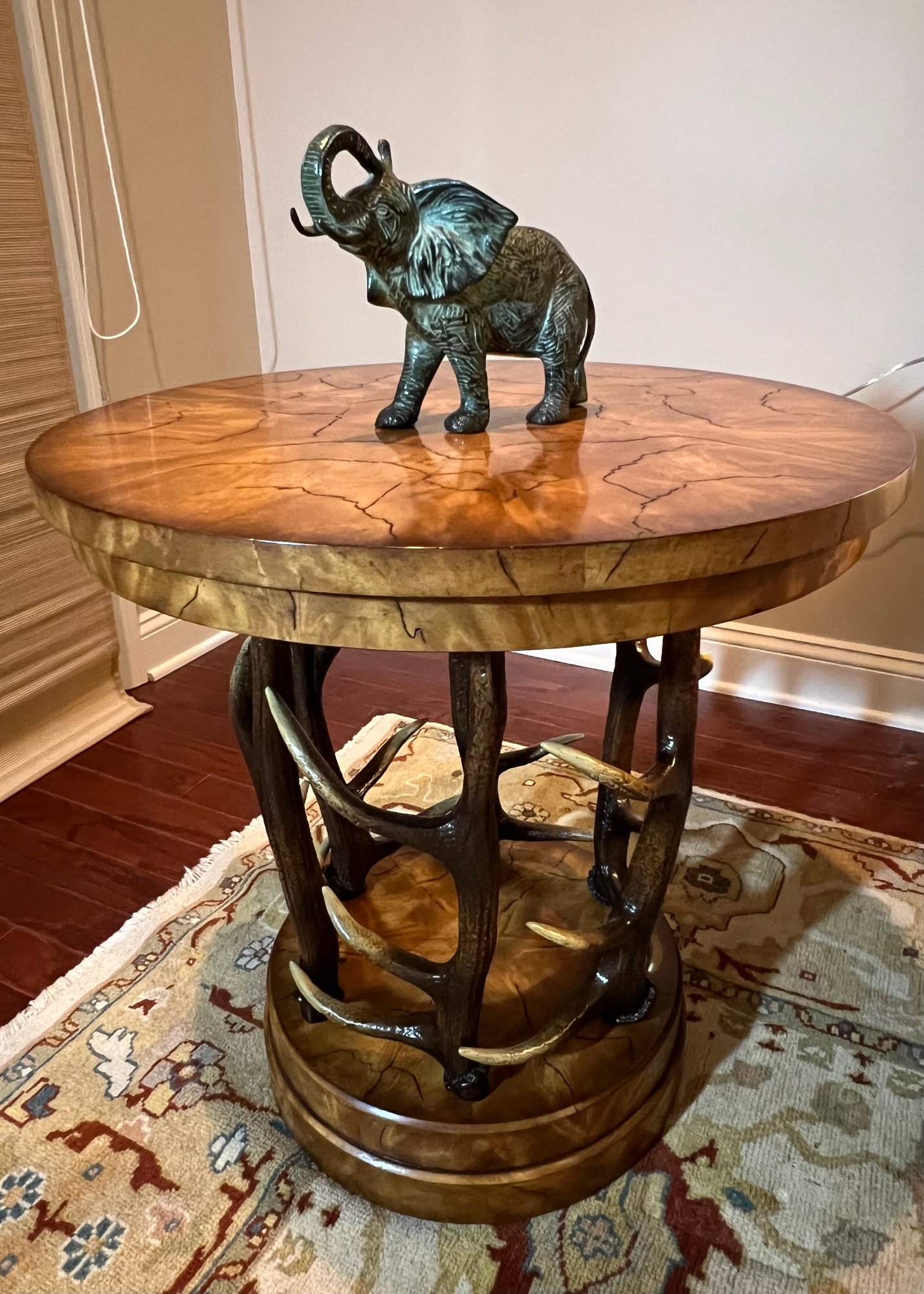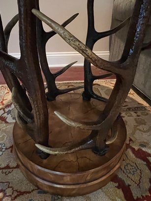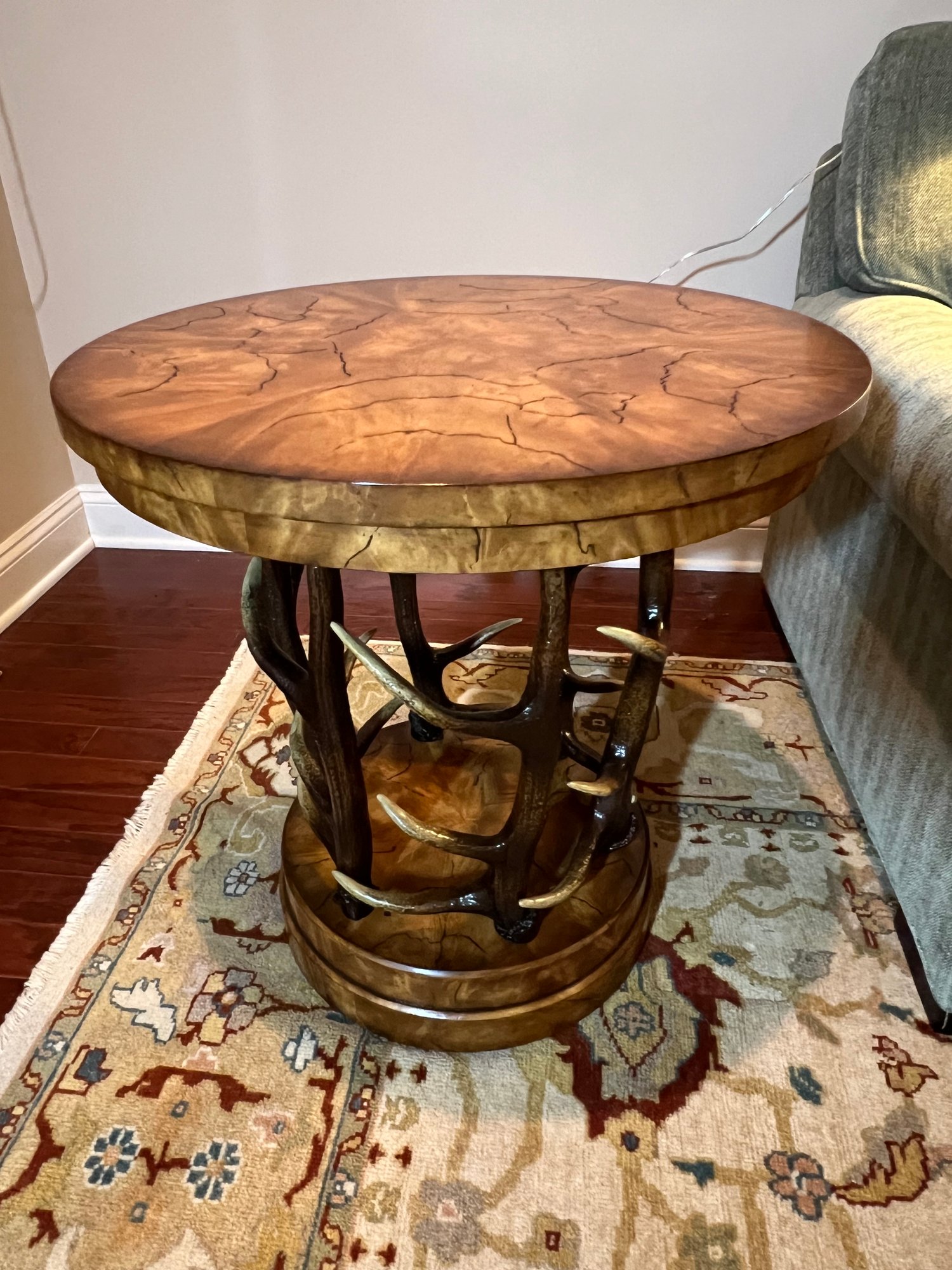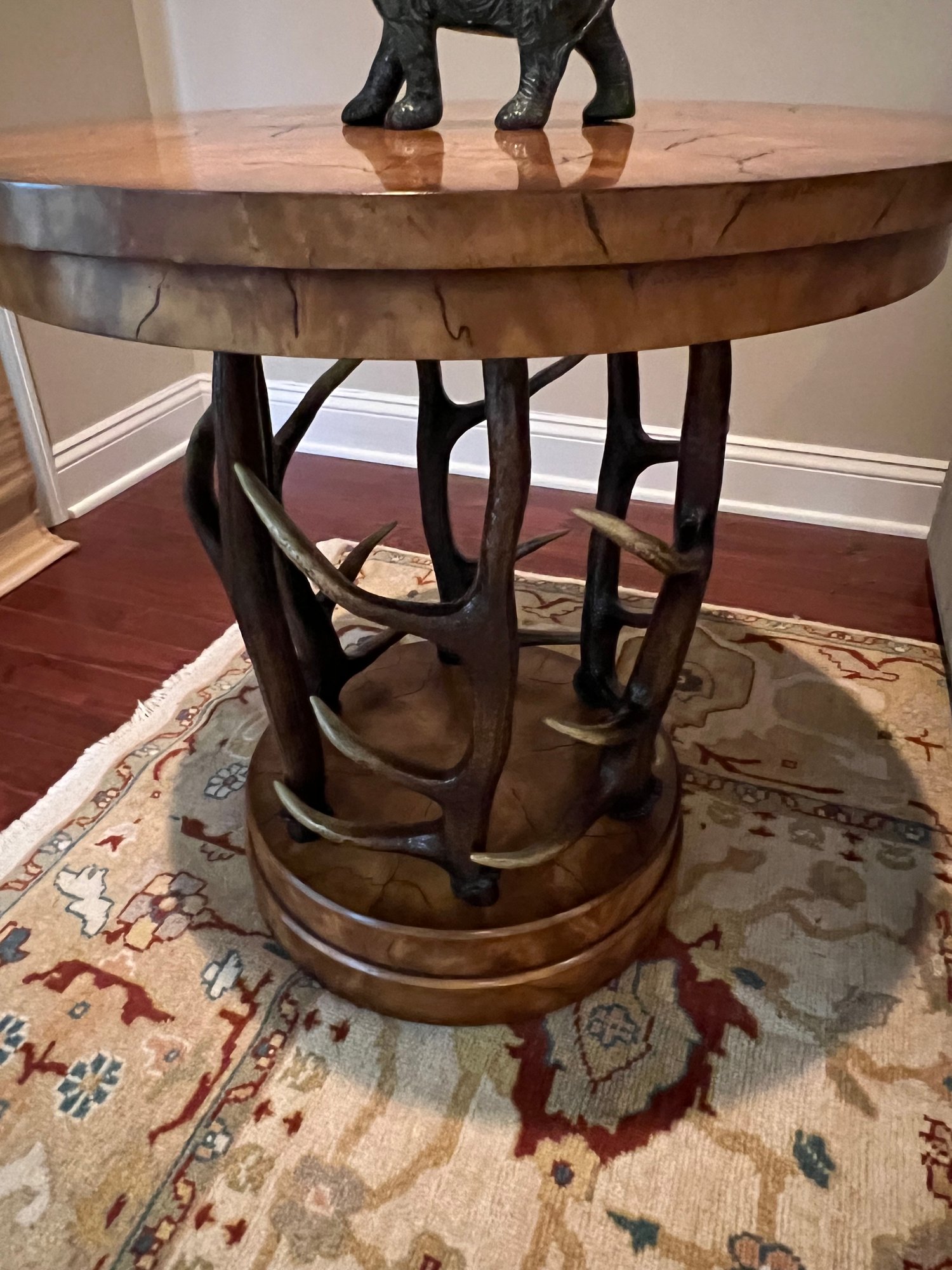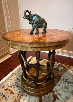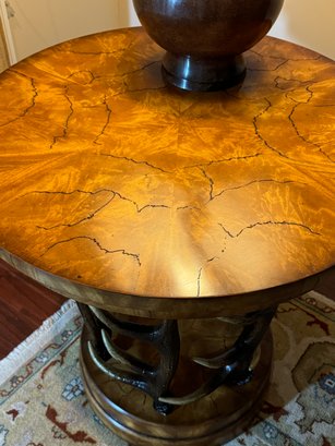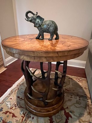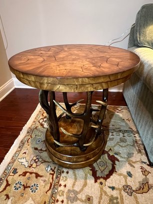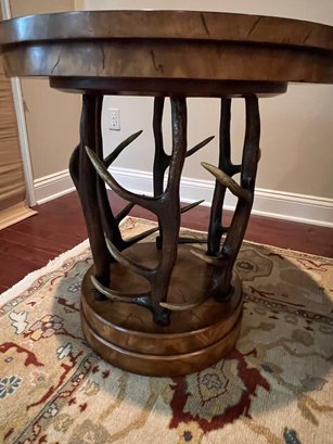 Handsome circular side table with burlwood style top antler designed base.