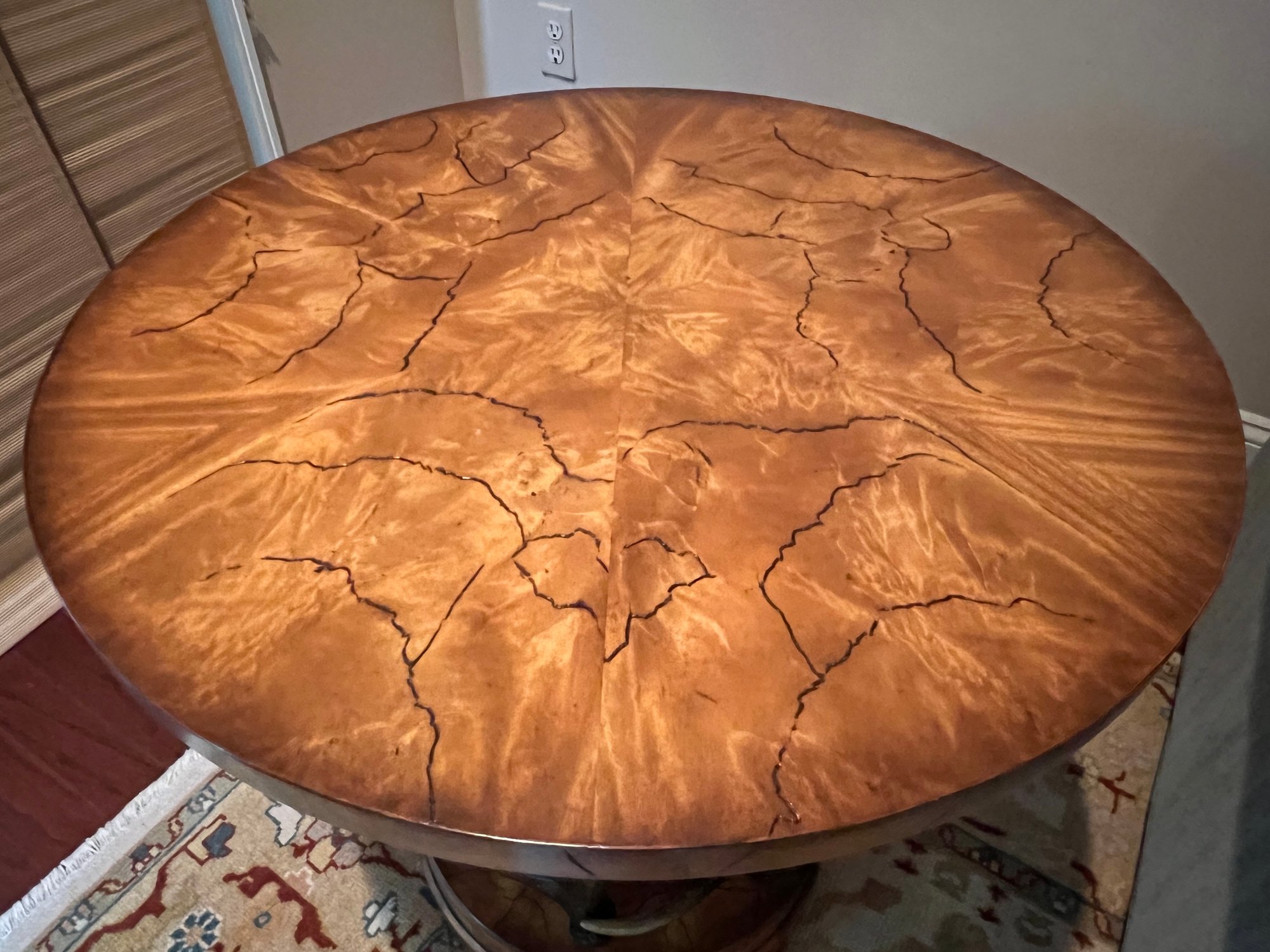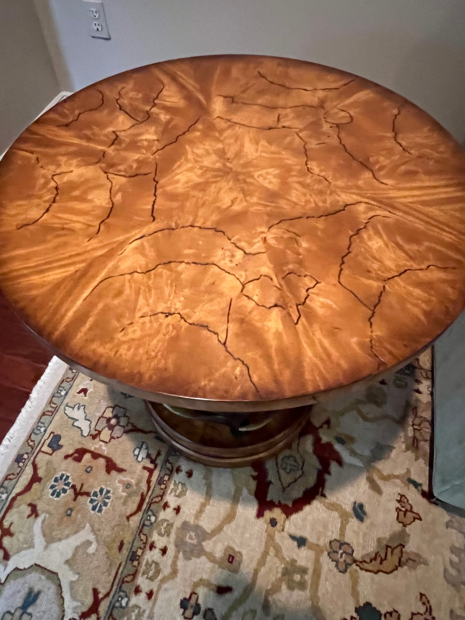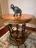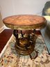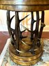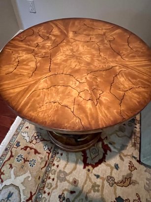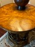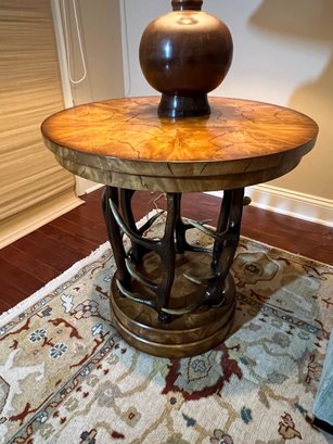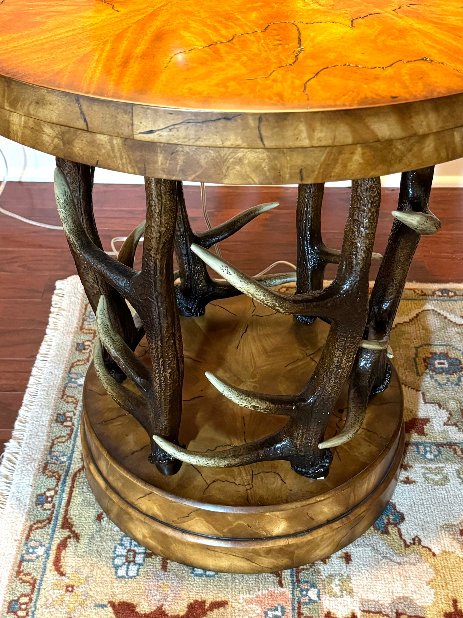 Handsome circular side table with burlwood style top antler designed base.