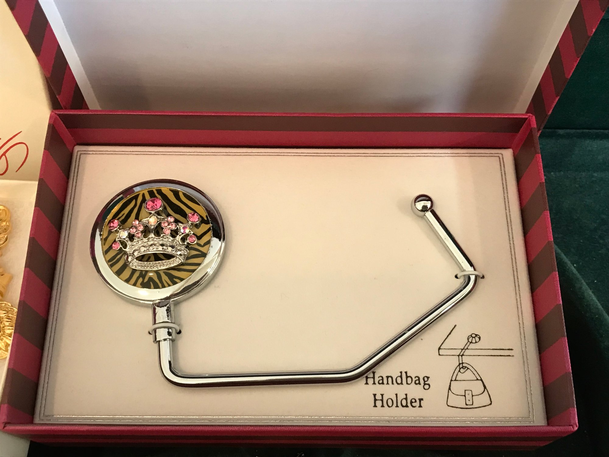 Unique Accessories: A jeweled "Crown" handbag holder in its original striped gift box.