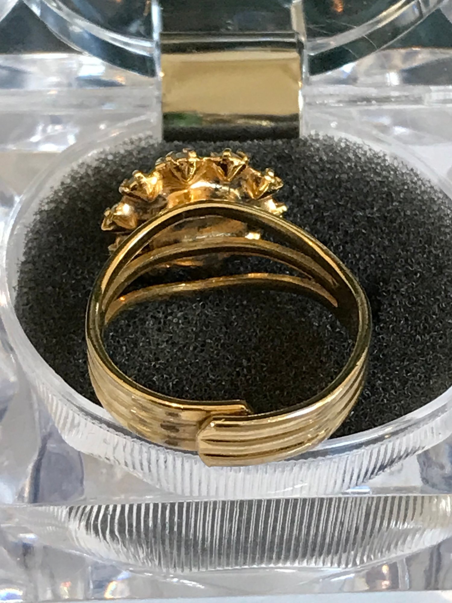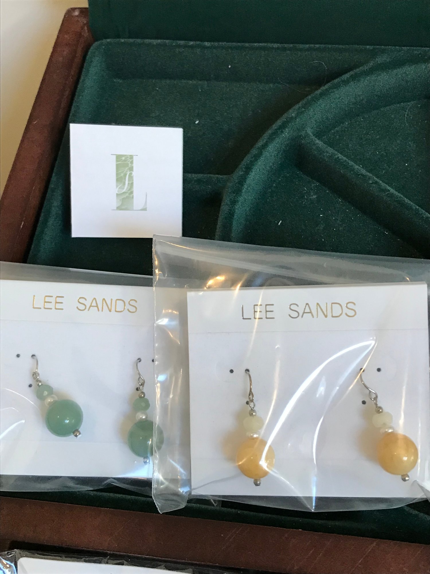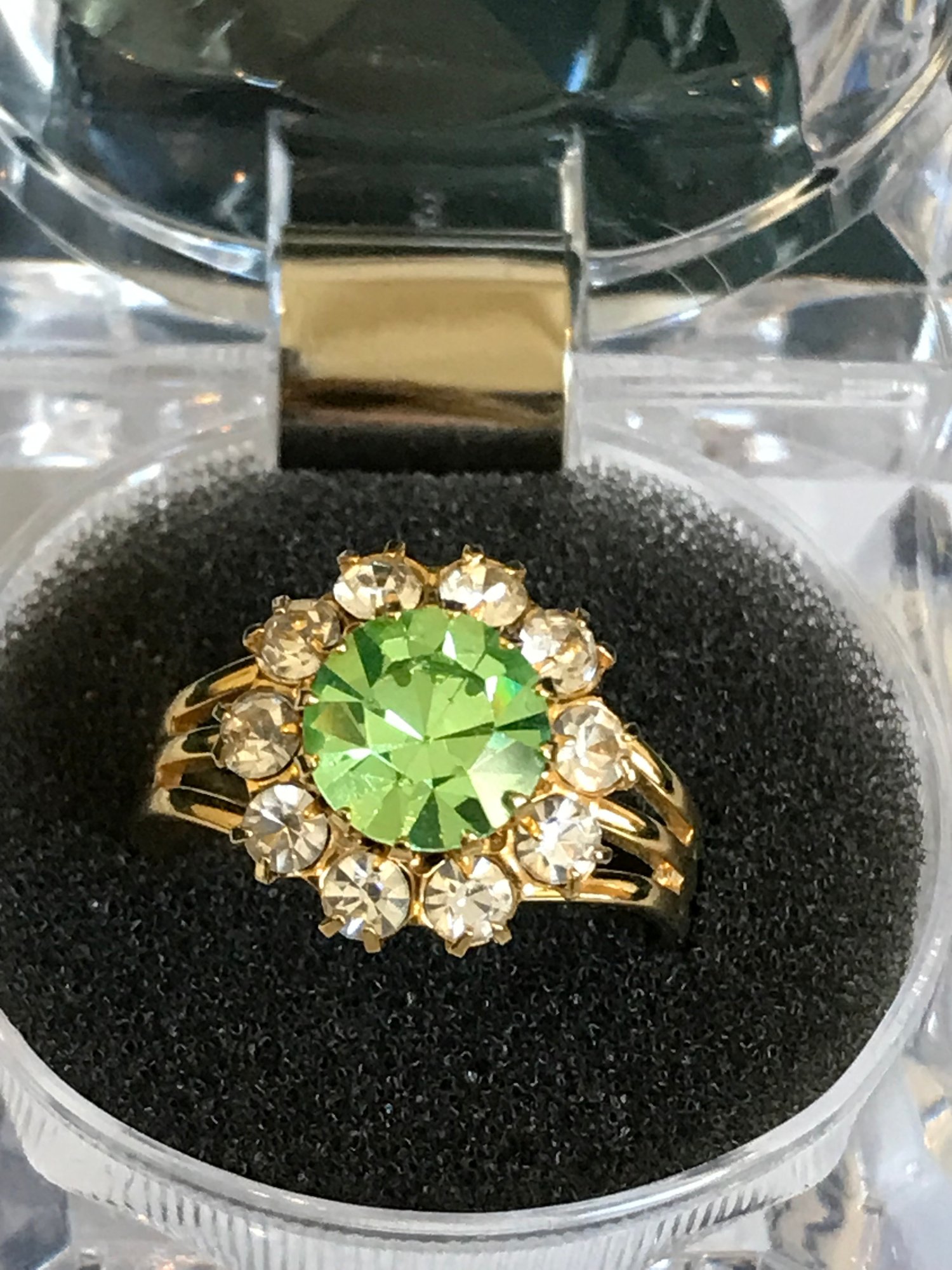 Rings: Includes a brilliant lime-green faceted cocktail ring with a clear rhinestone halo (adjustable band).