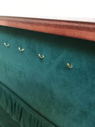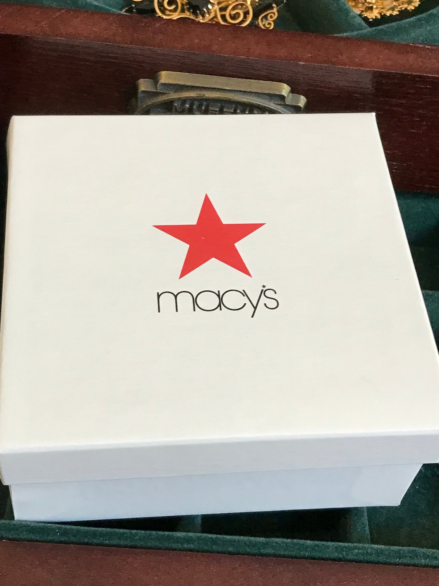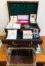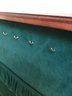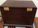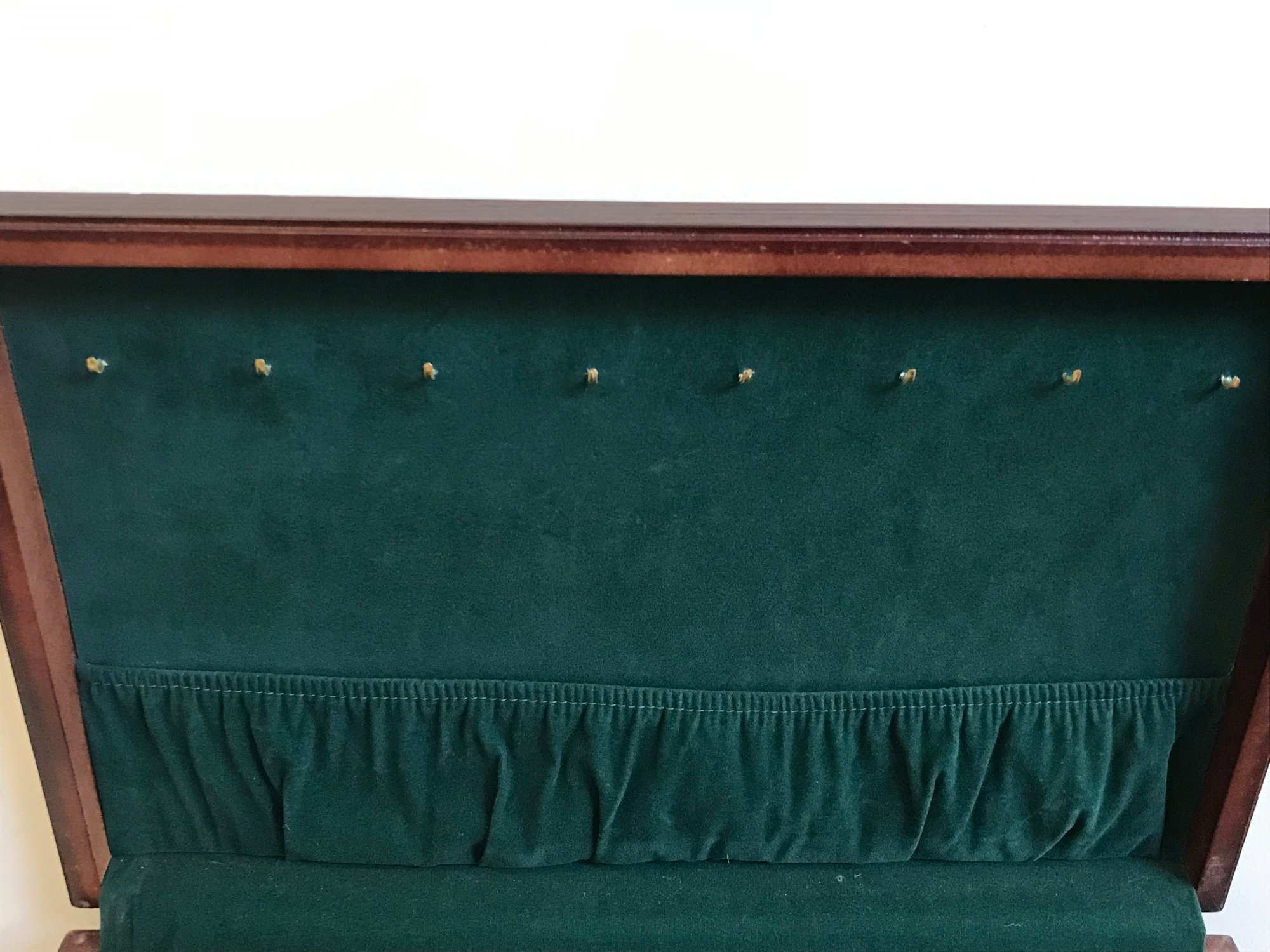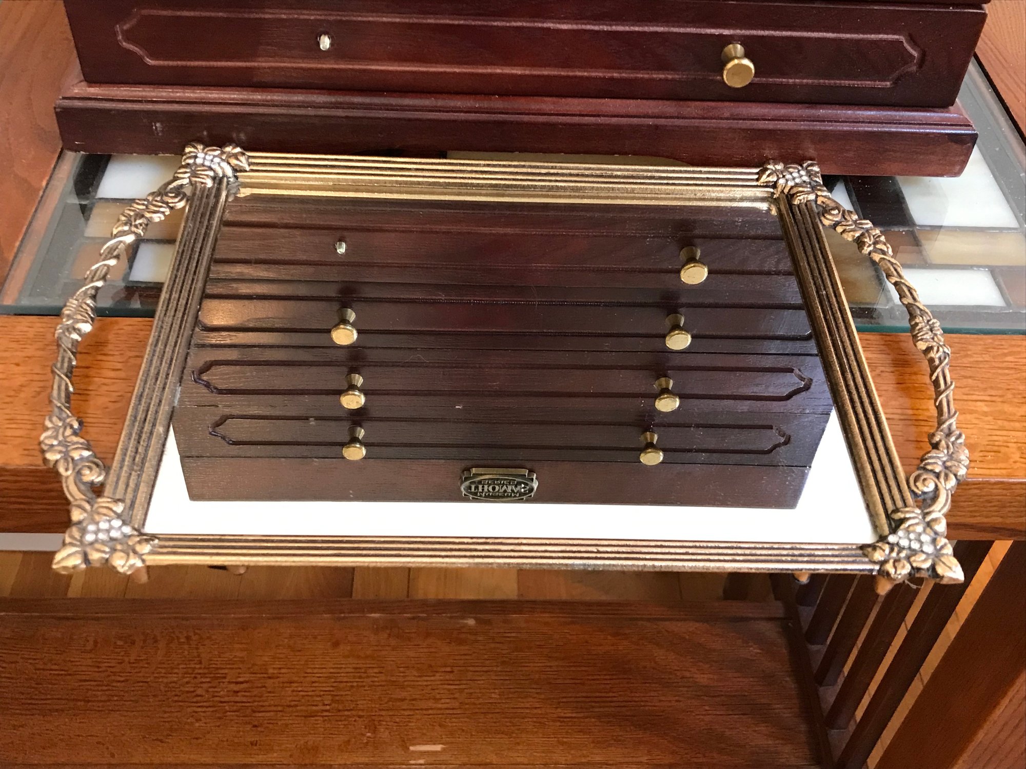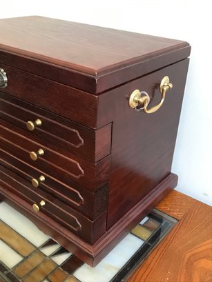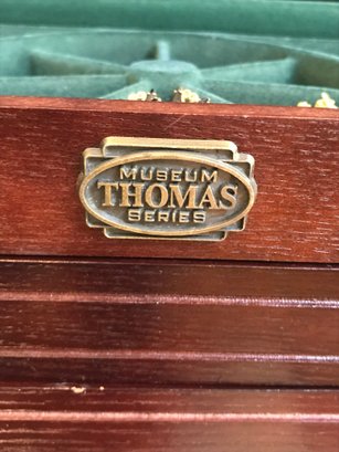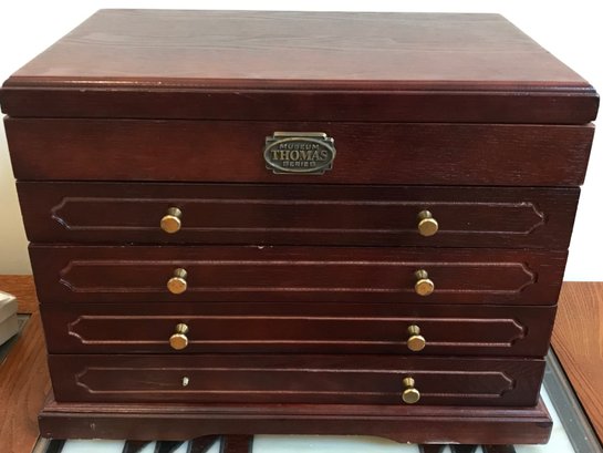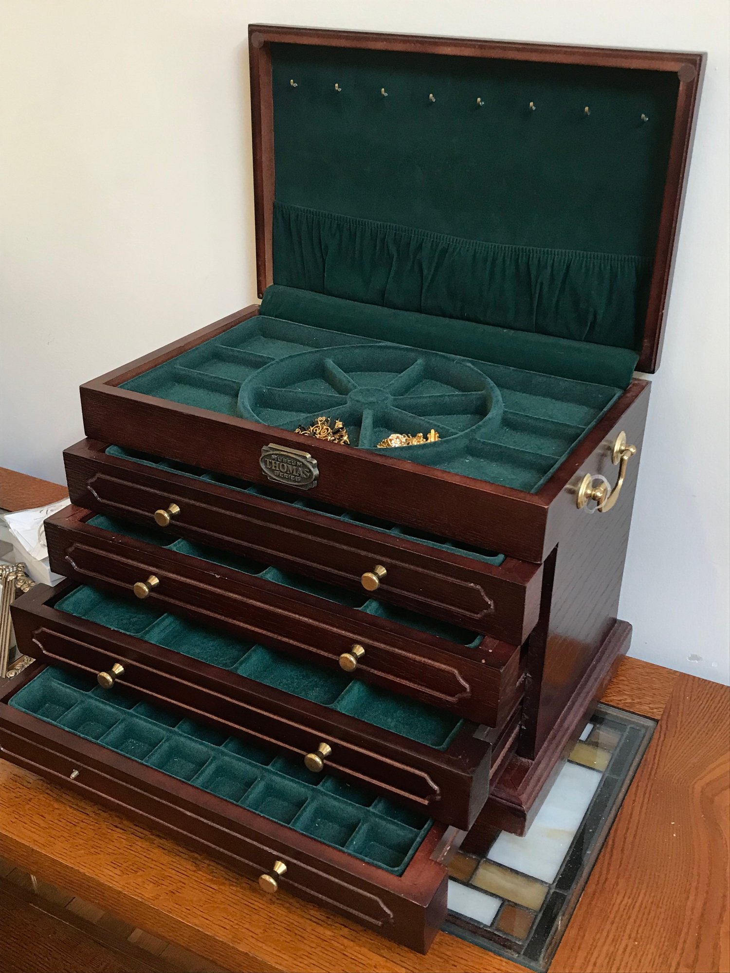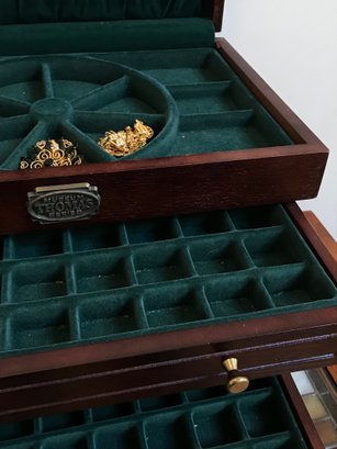 This multi-tiered Thomas Museum Series wooden jewelry chest features a rich mahogany-toned finish with a plush hunter green velvet-lined interior. The chest is designed for maximum organization, including four pull-out drawers (lower drawer features a divided grid), a top lift-compartment with a unique wagon-wheel sorter, and side brass-toned swing handles. Also includes a mirrored jewelry/perfume tray.