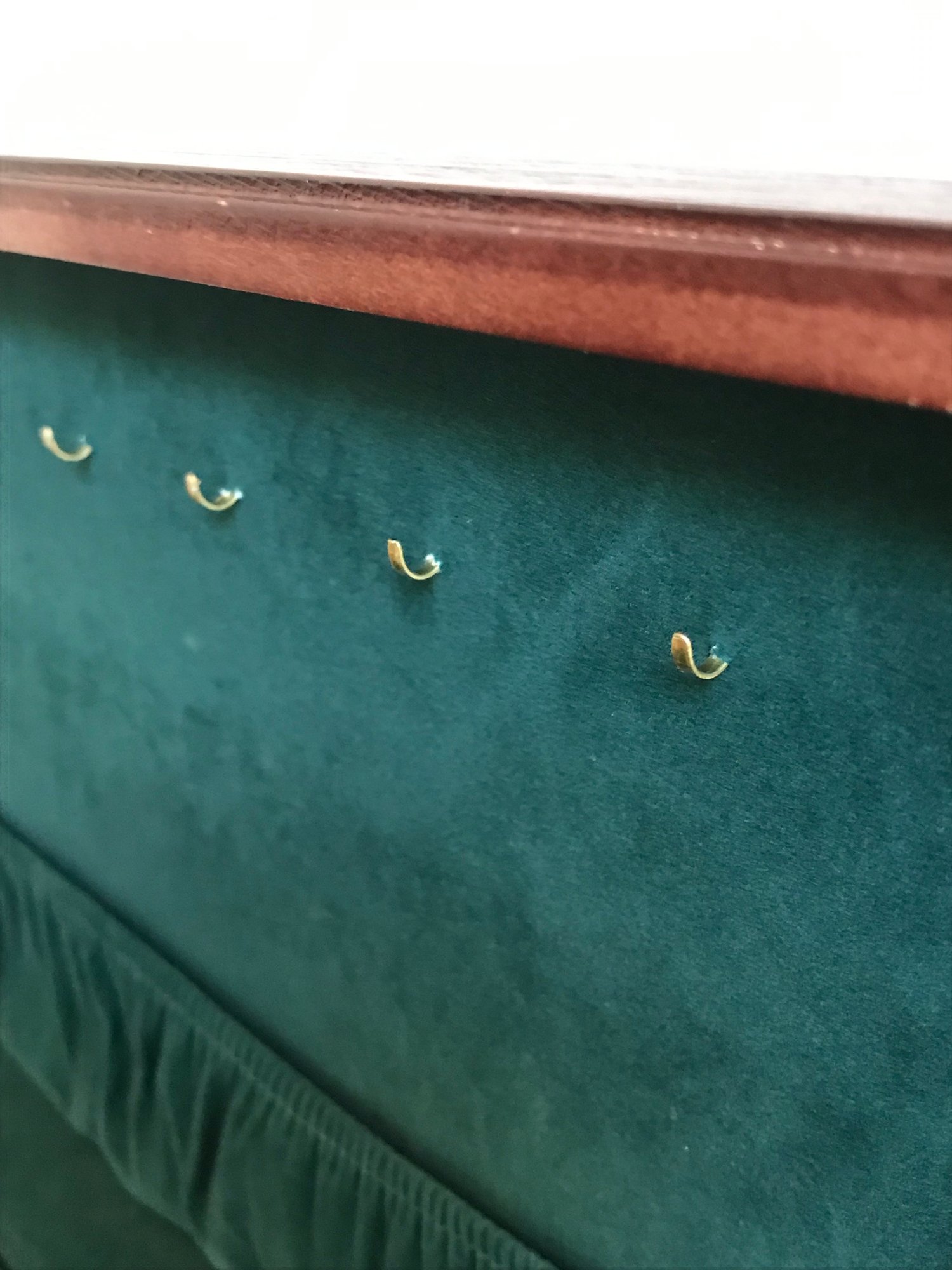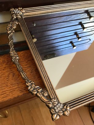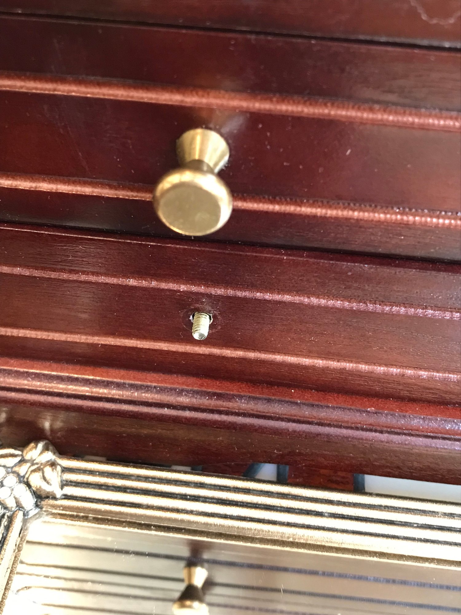The jewelry chest is in good structural condition but is missing one brass-toned pull knob on the third drawer. Some light surface wear consistent with age and use.