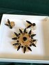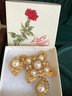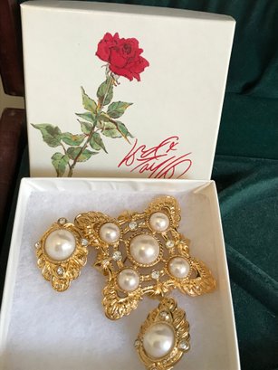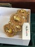 Vintage Styles: An assortment of gold-tone clip-on earrings, including a large pearl-style statement brooch/earring set and floral-themed pieces.
