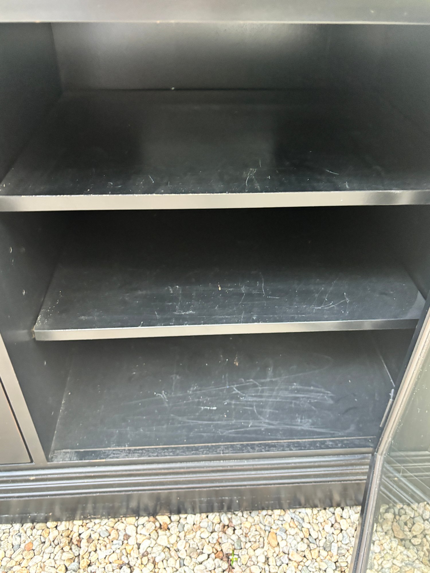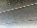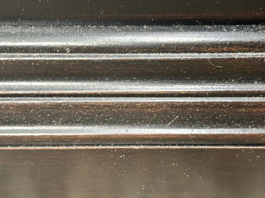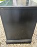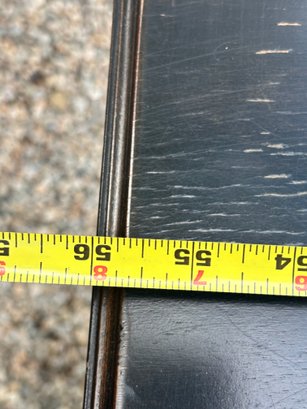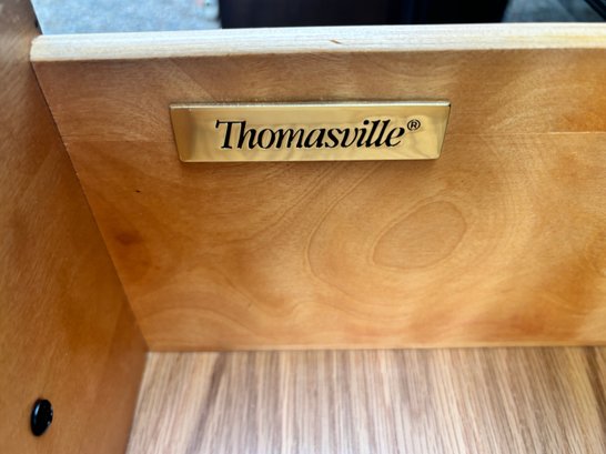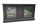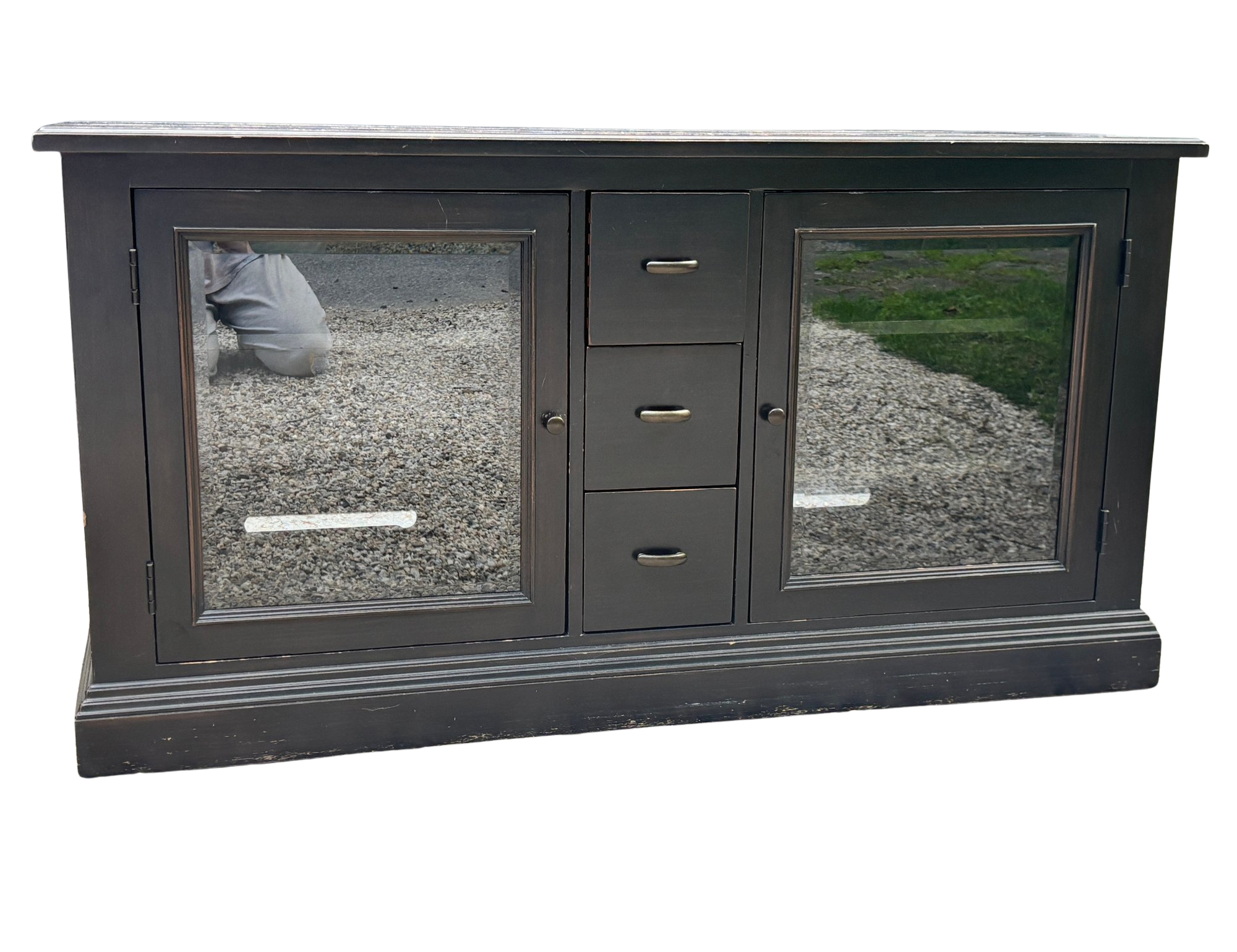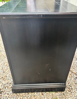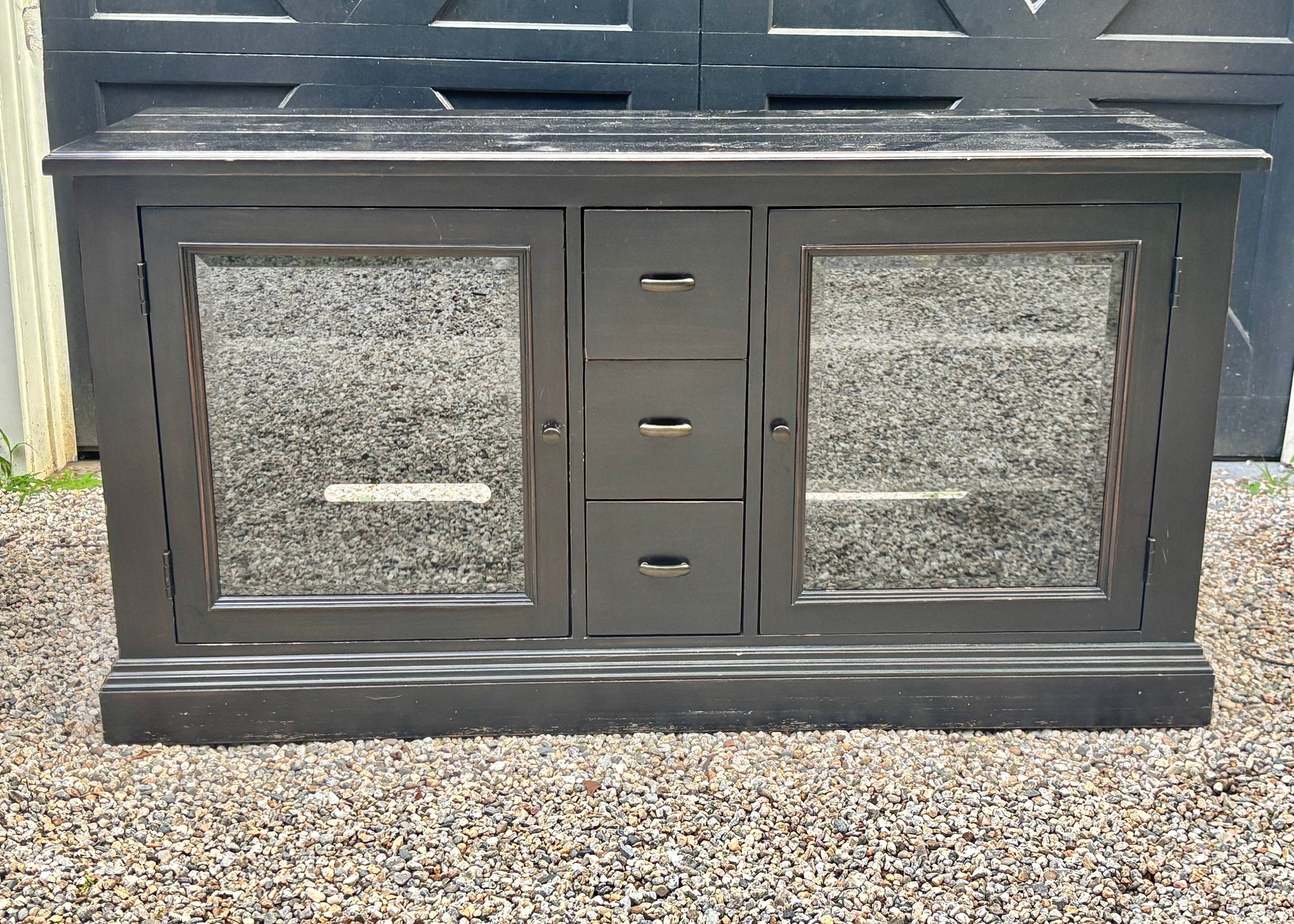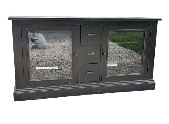 Black painted Thomasville Console Table with three center drawers, two glass side cabinets.