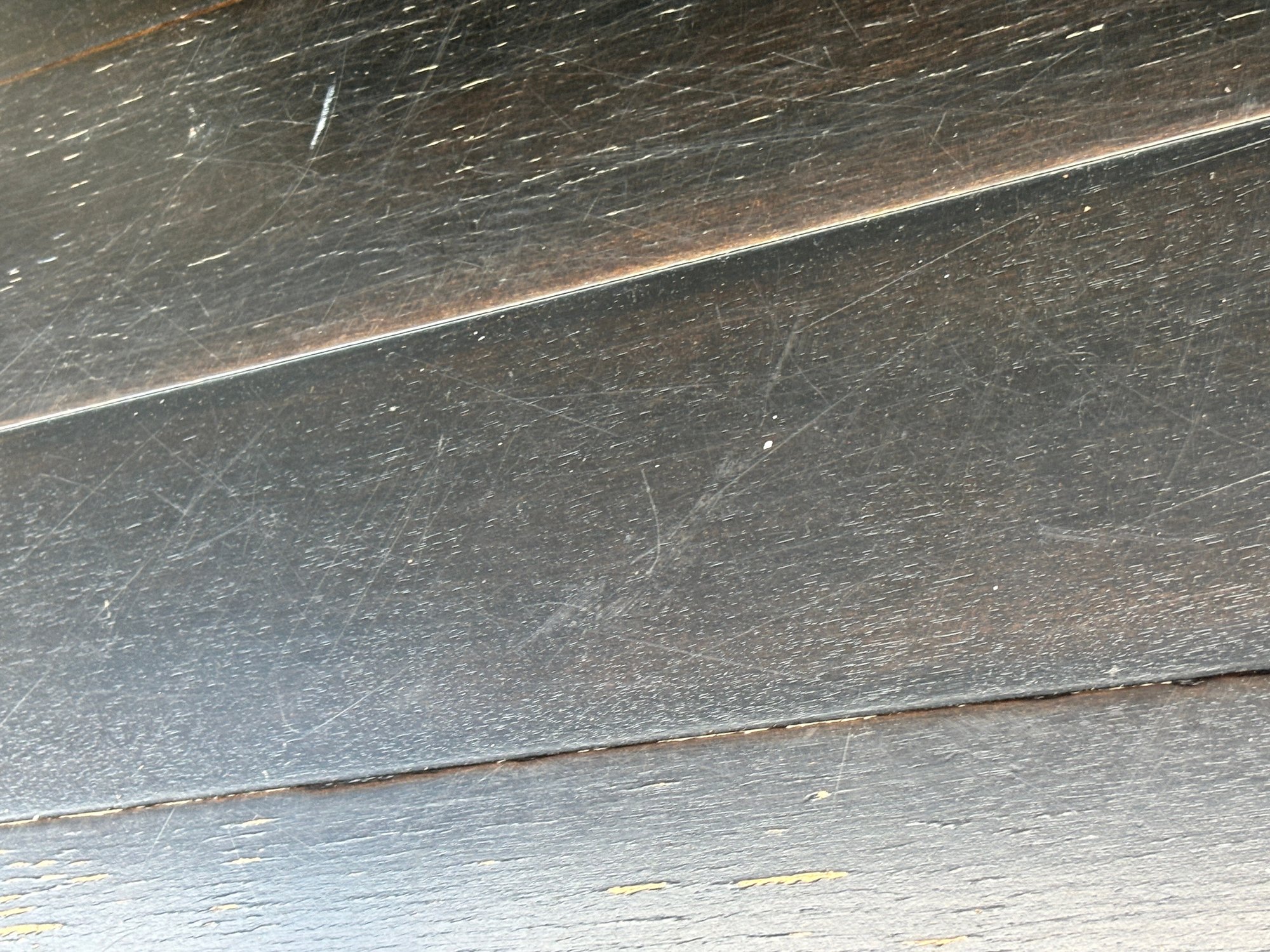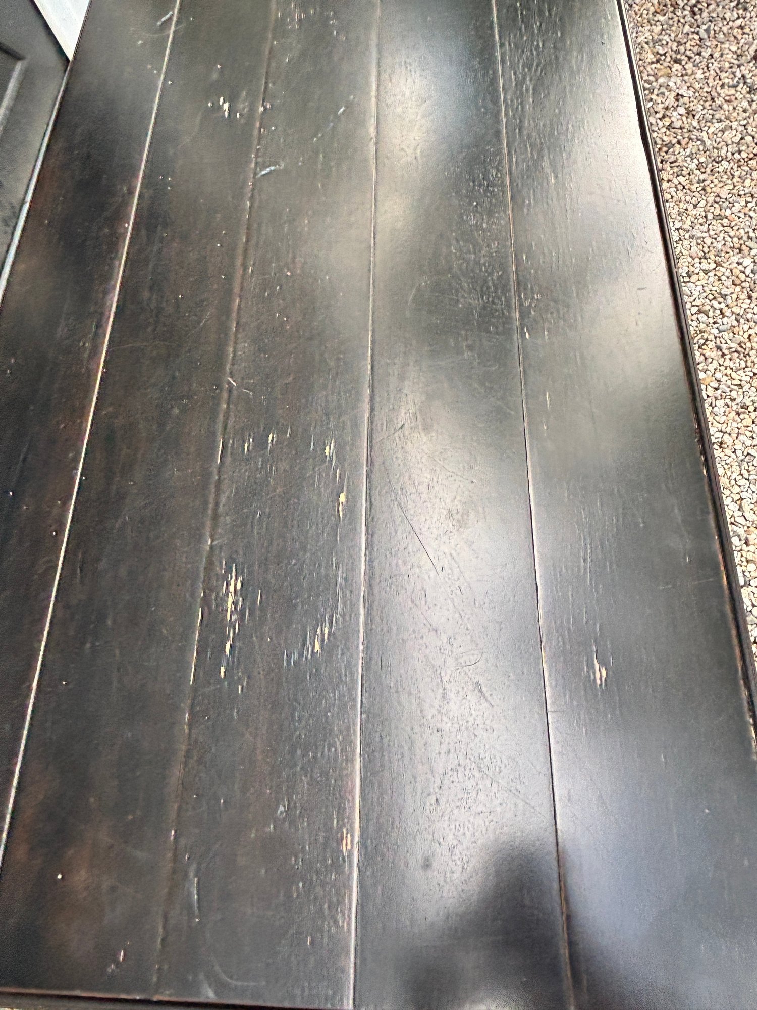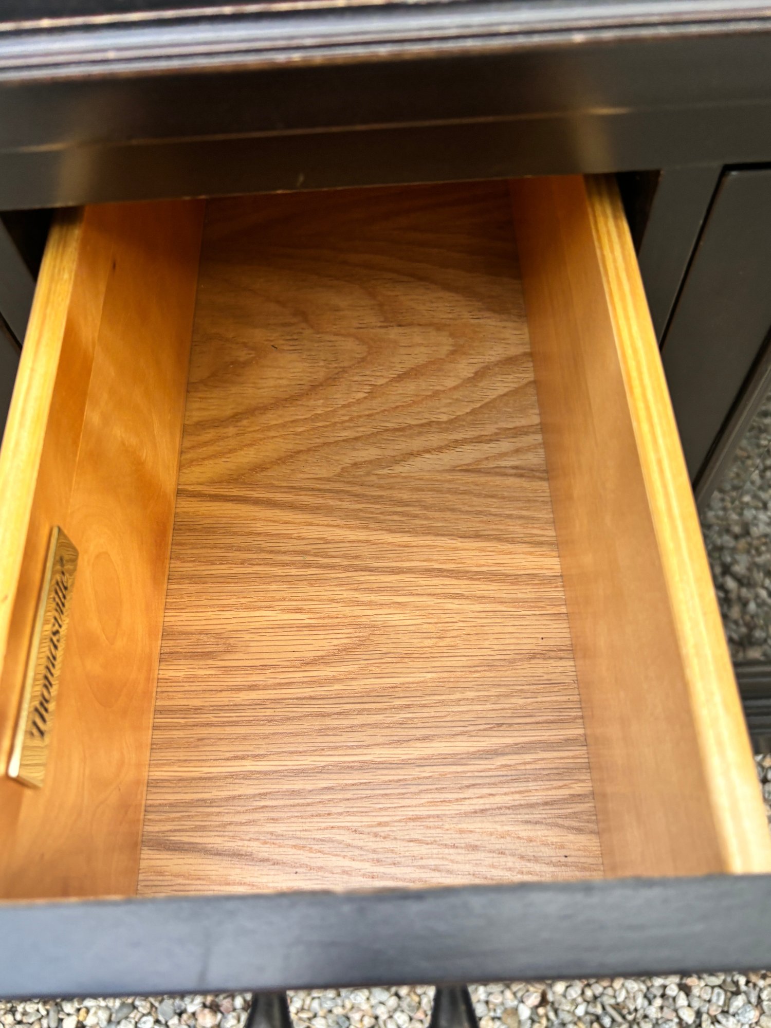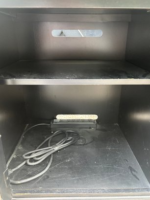 Black painted Thomasville Console Table with three center drawers, two glass side cabinets.