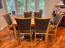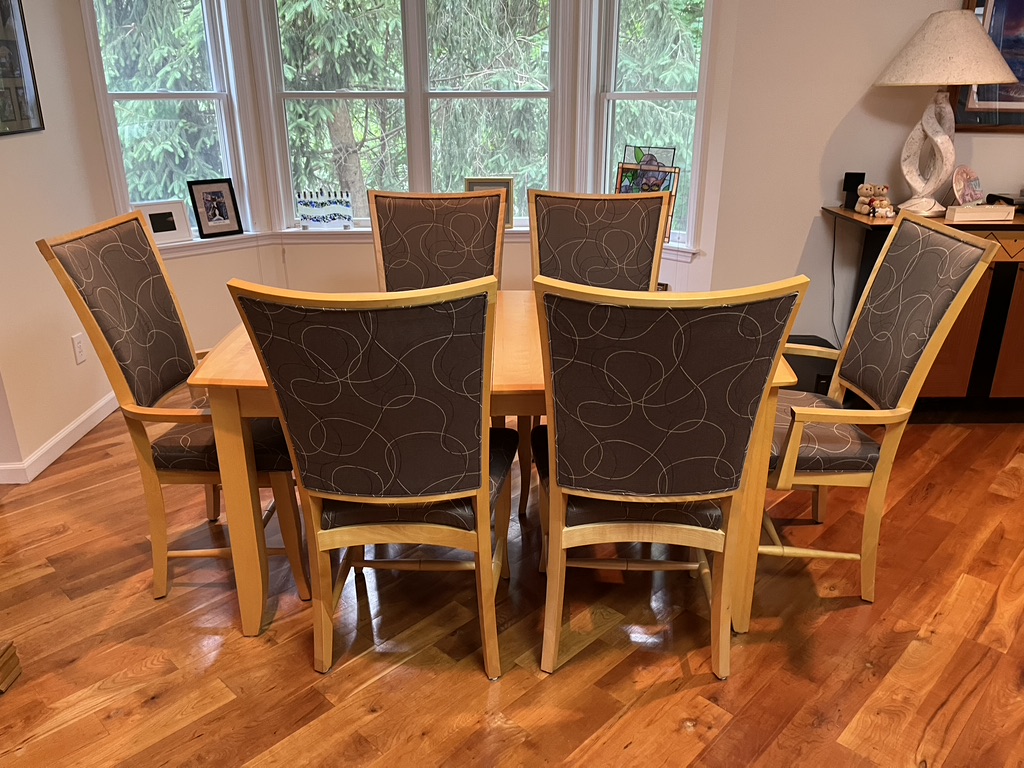 Insert for table is 18", has a stain. Two captain chairs, measuring 24.5x17x41". 4 regular chairs. Upholstered seats, small stains.