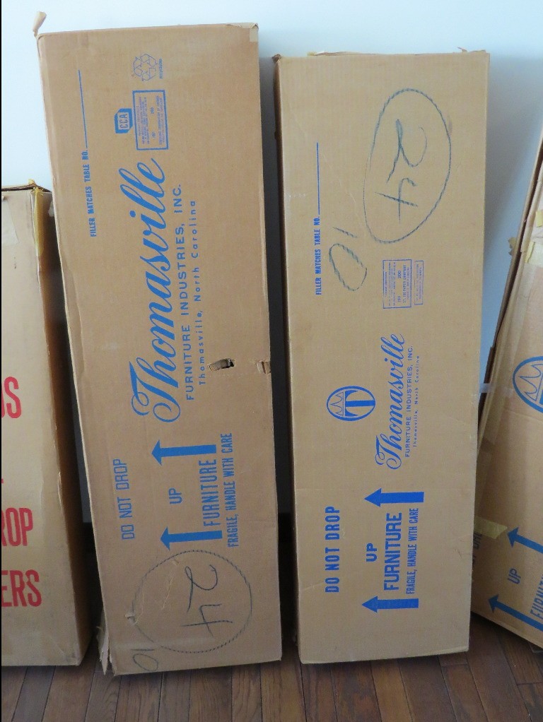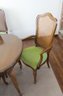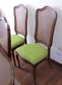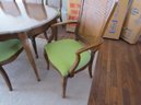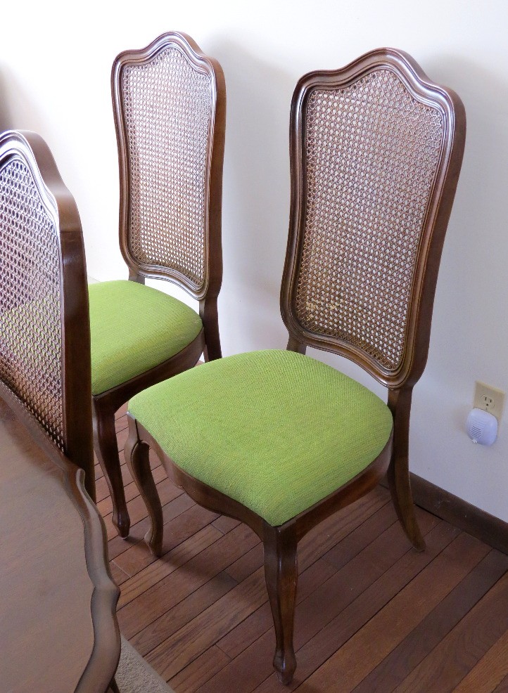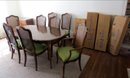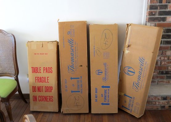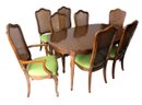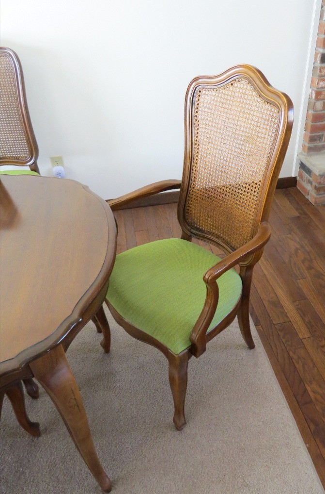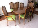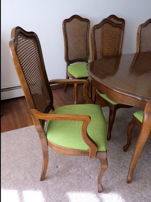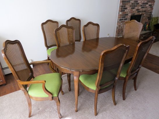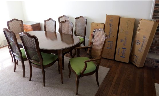 Purchased new, along with all the other Thomasville furniture right out of their showrooms in North Carolina c.1972. Table comes with 3 leaves and pads for the full spread. 8 chairs, 2 captain, 6 sides with original green upholstery seating and woven backs all in very good condition. All the furniture shipped from NC to NYS for $180 back then, can you imagine? Table is 46" x 40" without leaves, 29" height. Each leaf is another 12" so overall length is 76" with all three leaves, pictured with one leaf in it currently. The pads are still new in the boxes, never put on, finish is very good on this table, always protected with a tablecloth since 1972. Matches the China Closet/Hutch.