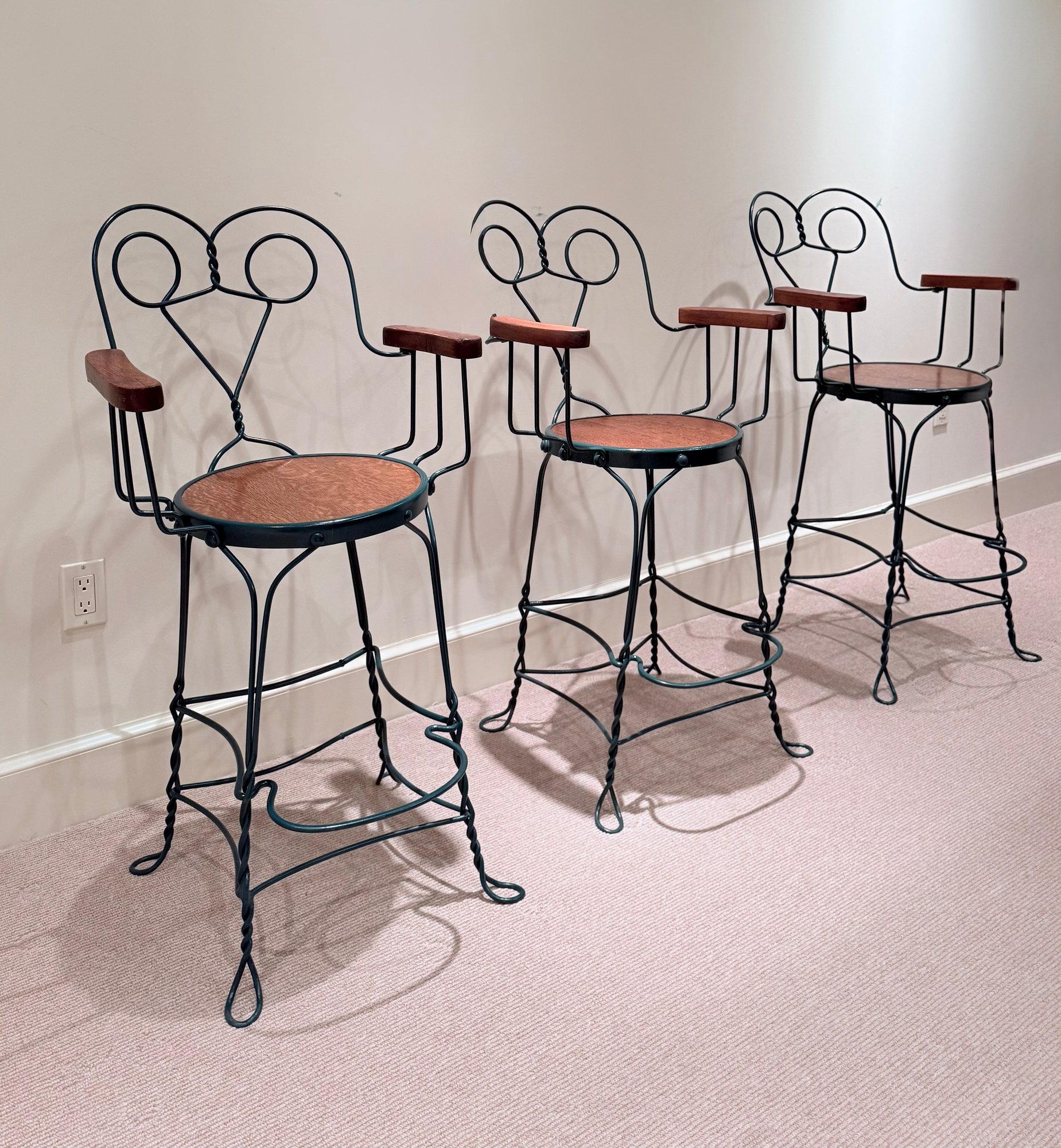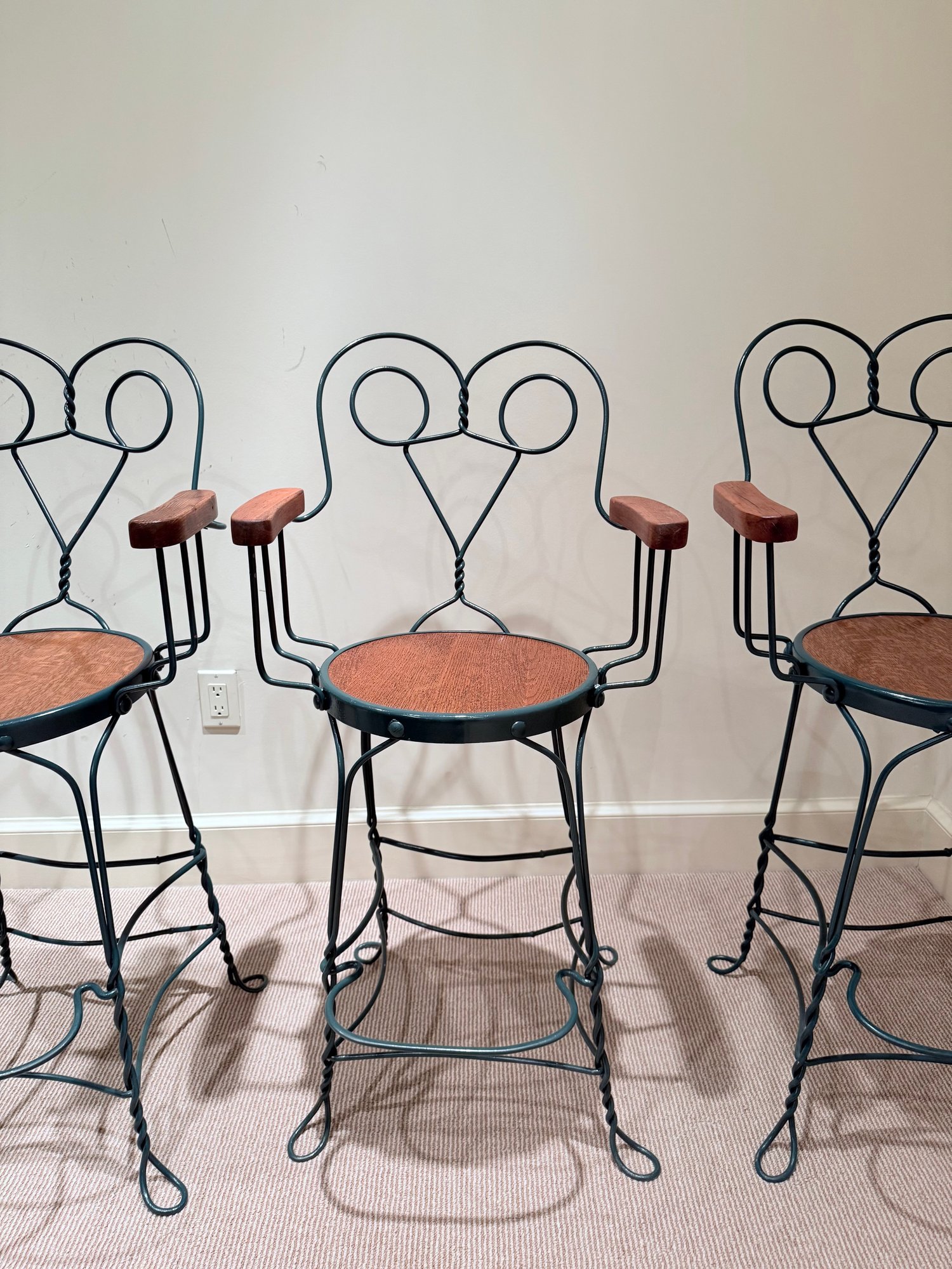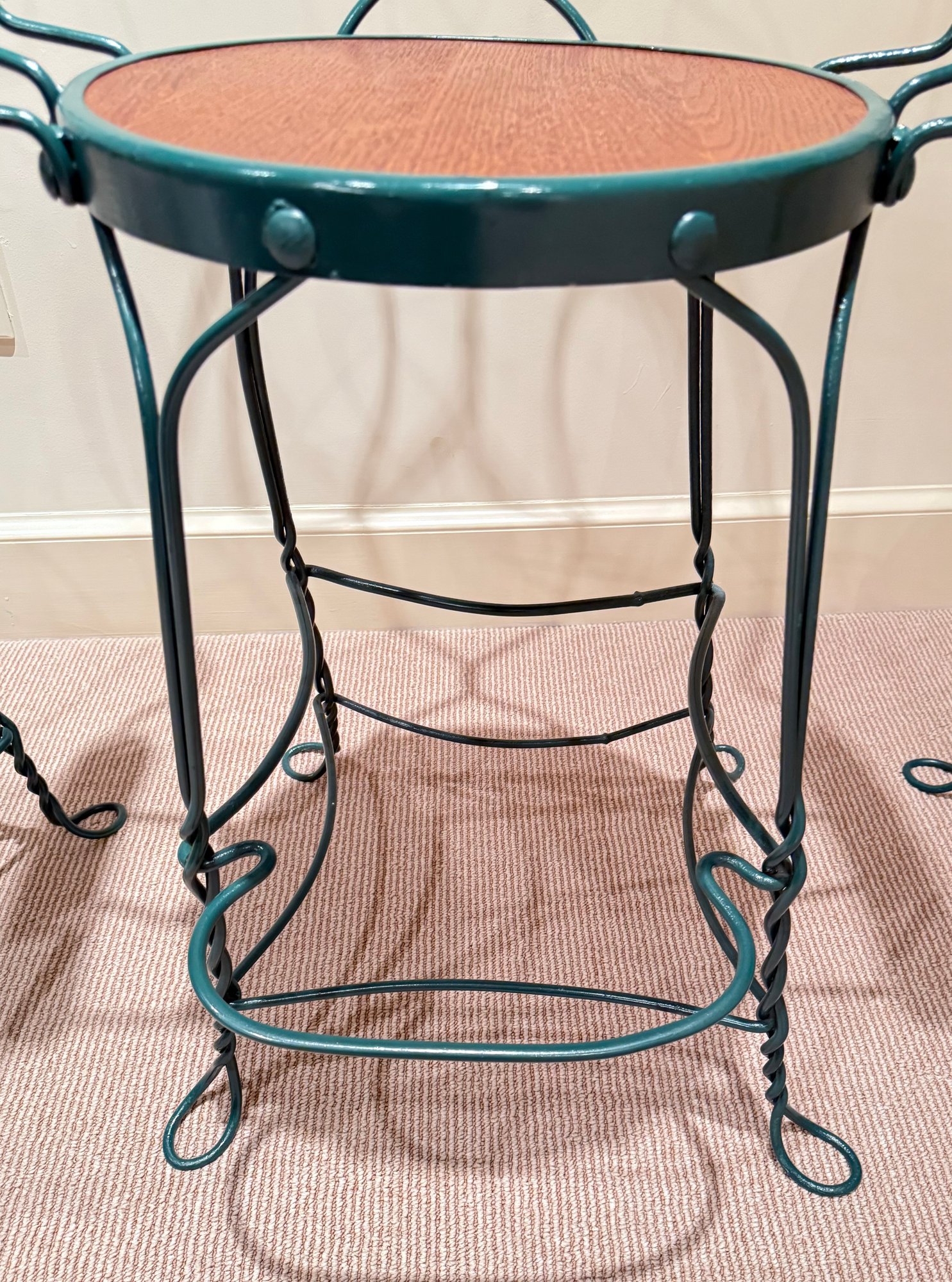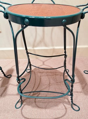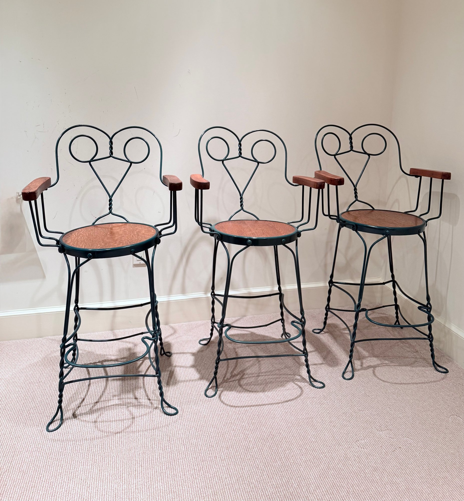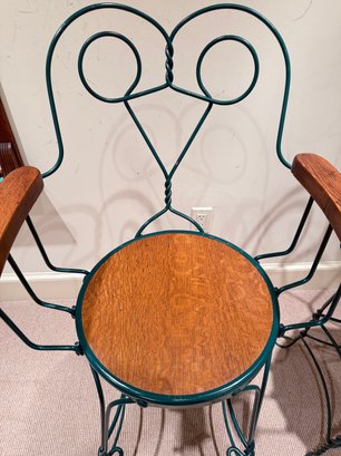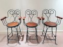 Painted wrought arm Counter Stools with green frames and oak arm rests & seats. All in very nice condition.