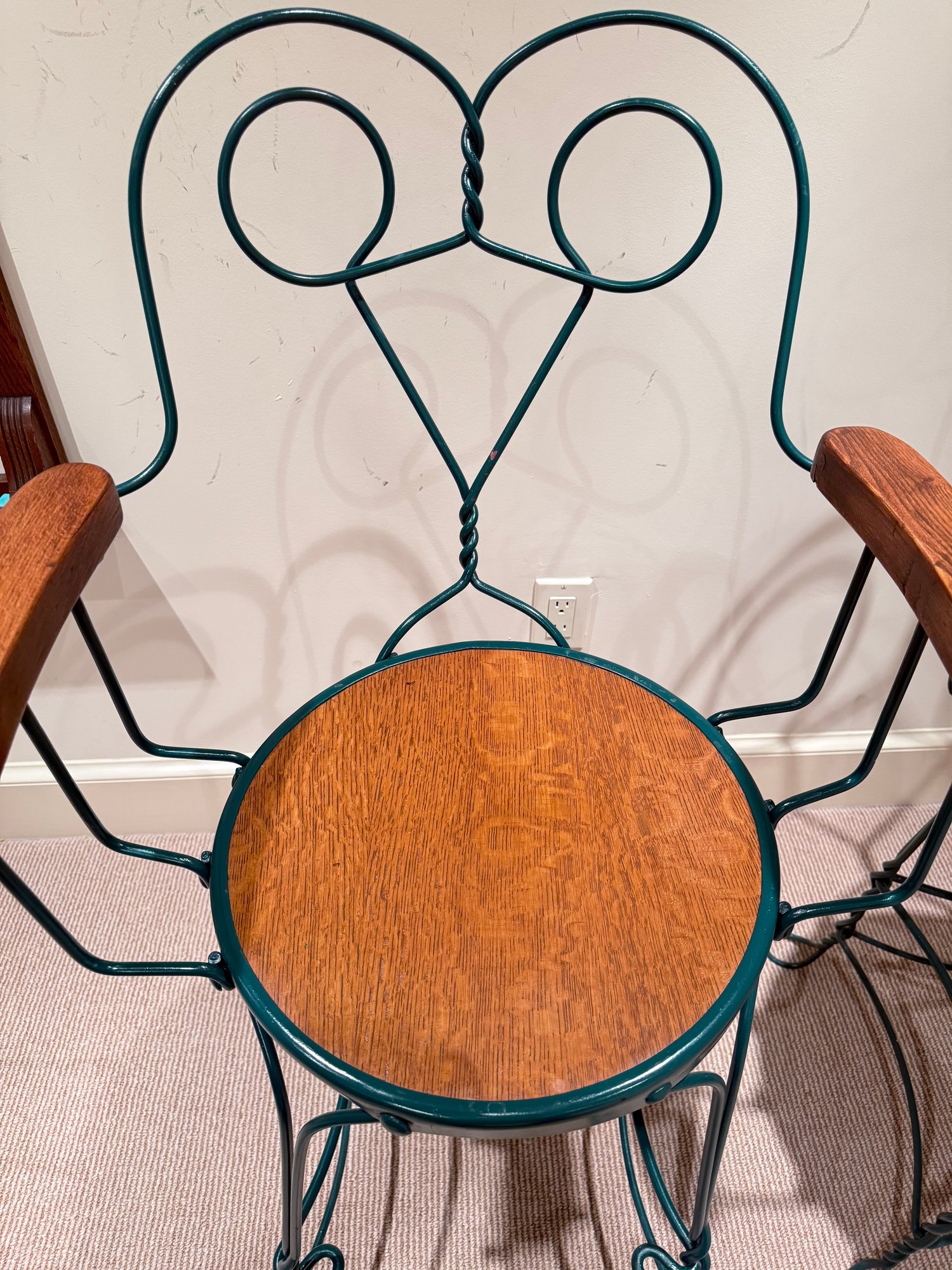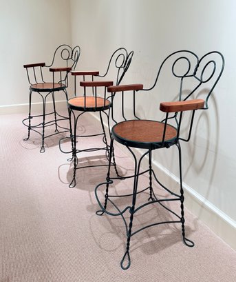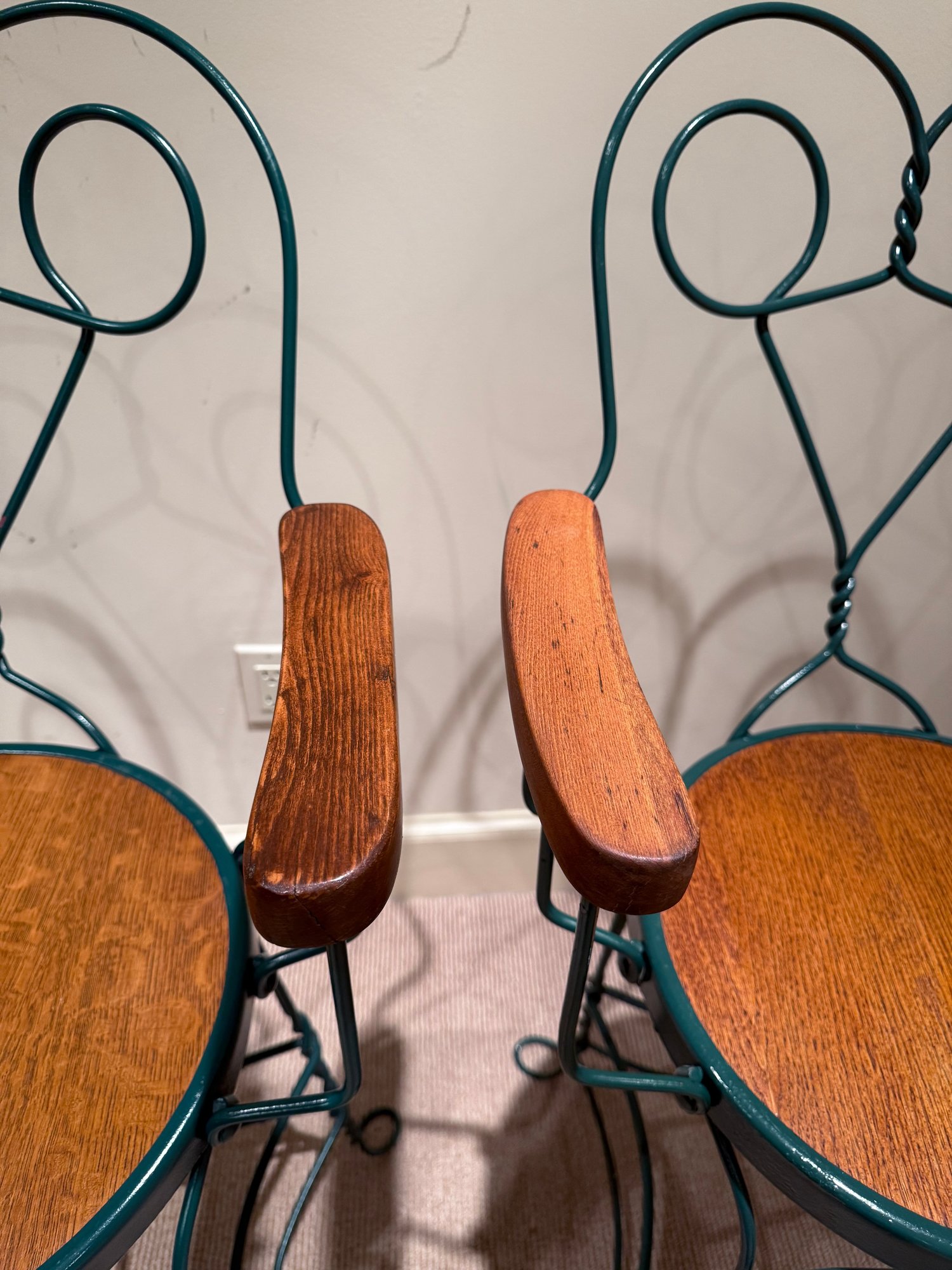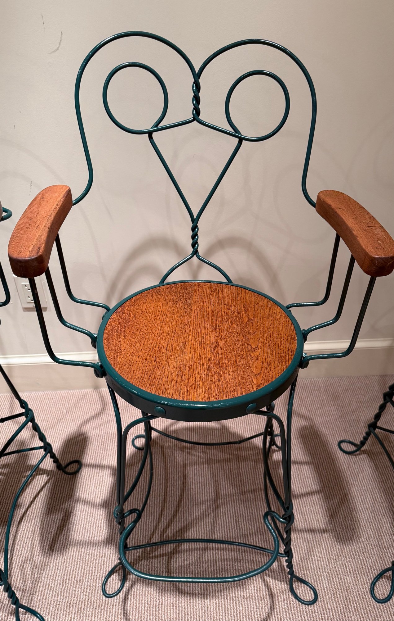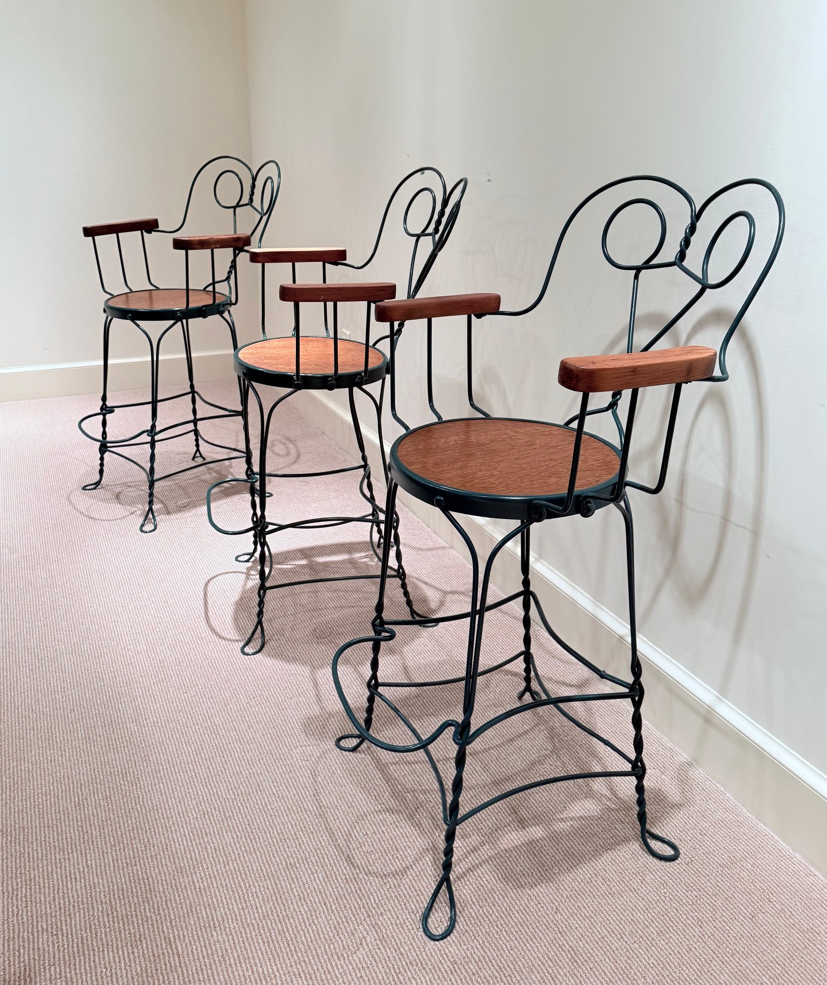 Painted wrought arm Counter Stools with green frames and oak arm rests & seats. All in very nice condition.