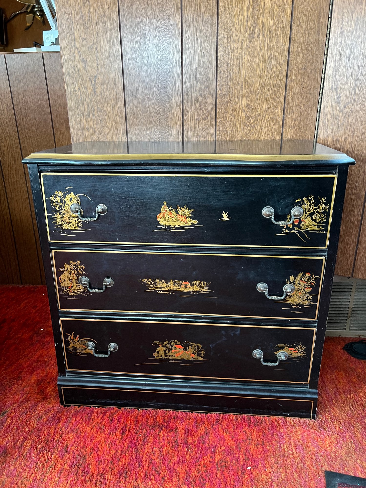 Vintage three-drawer chinoiserie black lacquer dresser with hand-painted designs in gold.