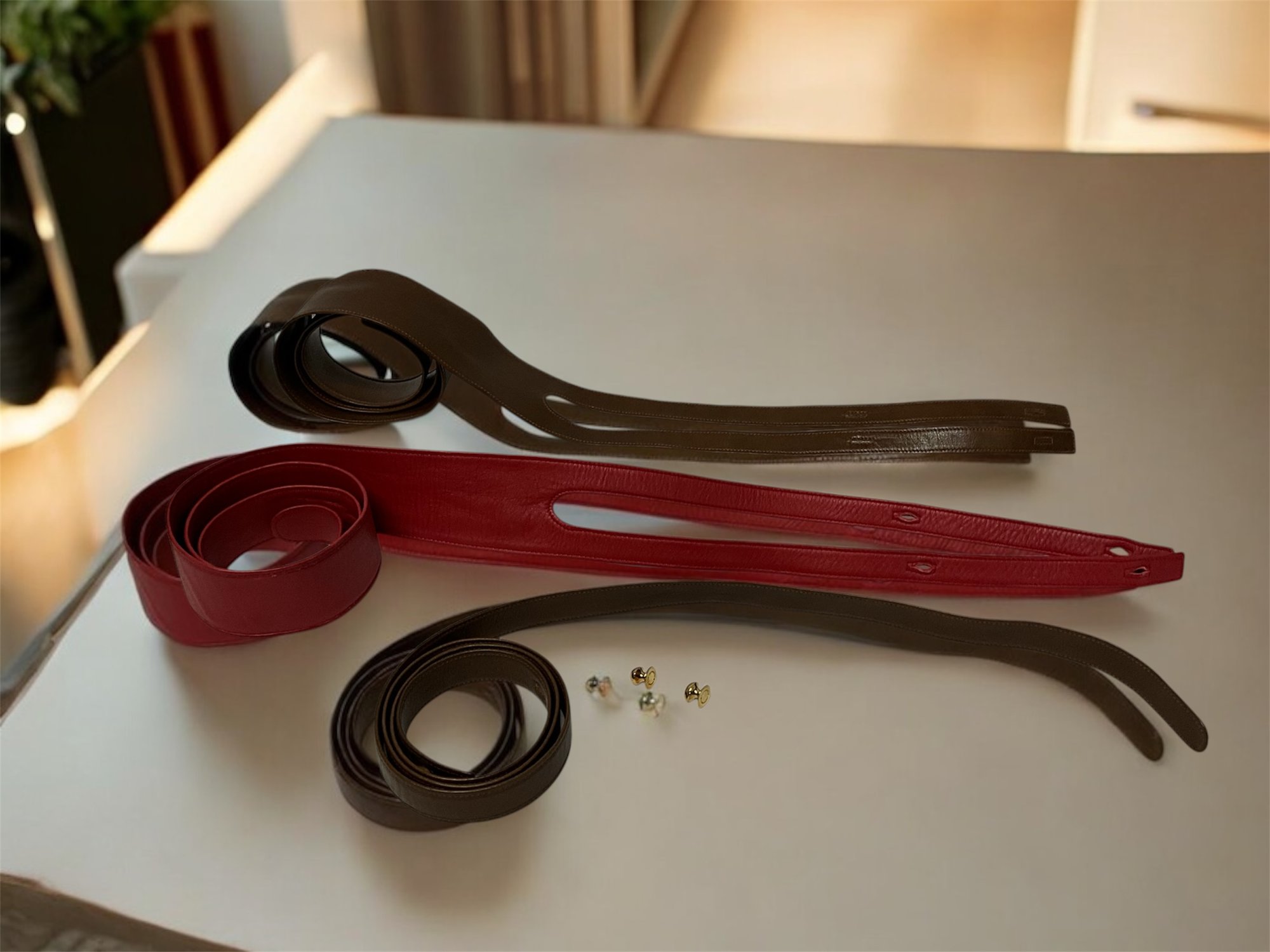 The style of one brown and the red leather belt is "Equestrian." The other brown belt is a simple strap. All are stamped. Included are two 18K gold studs used to attach the buckle. The Equestrian belt requires both studs and the strap belt needs only one. Button hole type openings allow for moving the studs. Buckle not included.