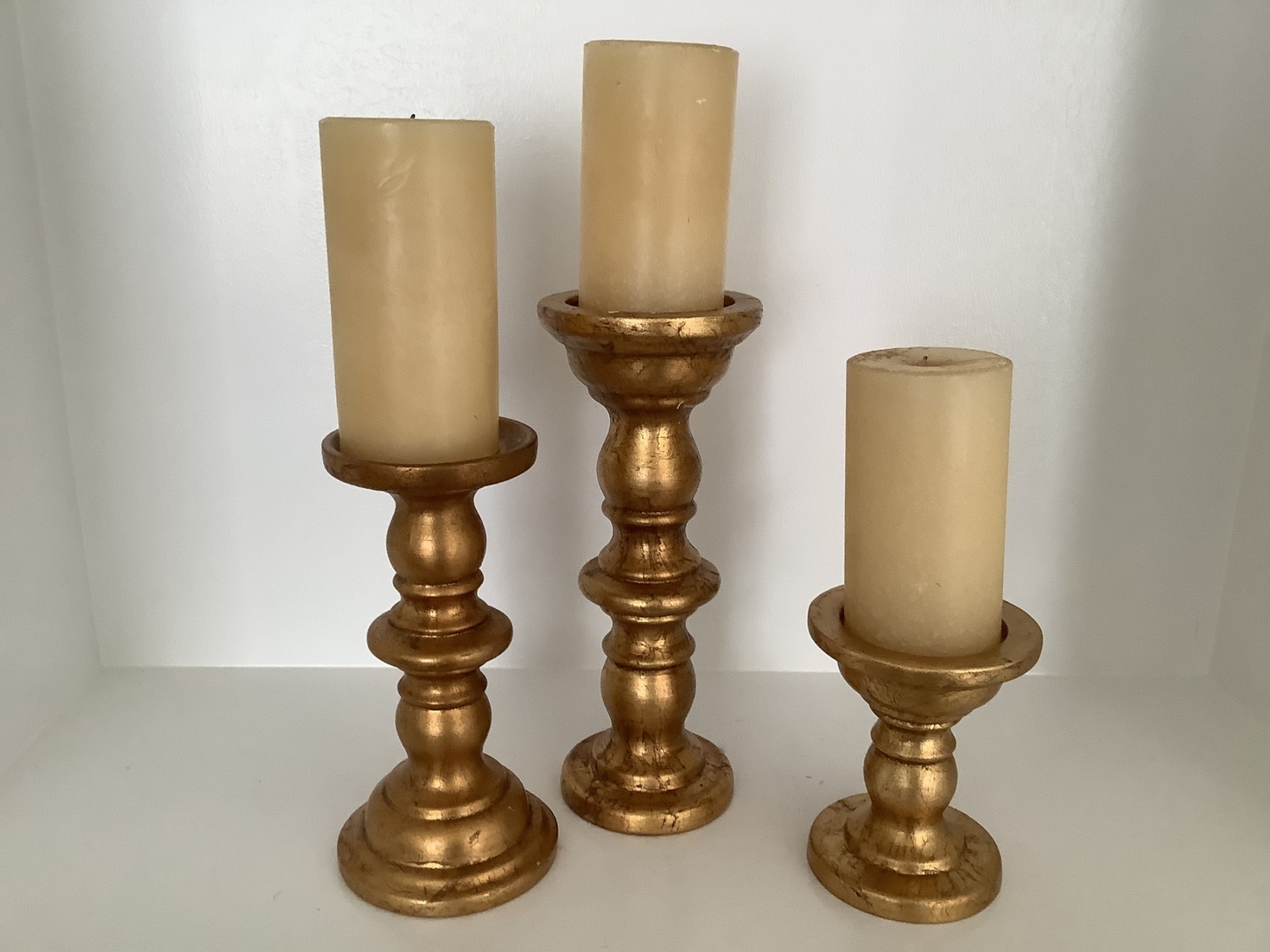 Three Gold Tone Candlestick Holders In Different Sizes. Candles Included