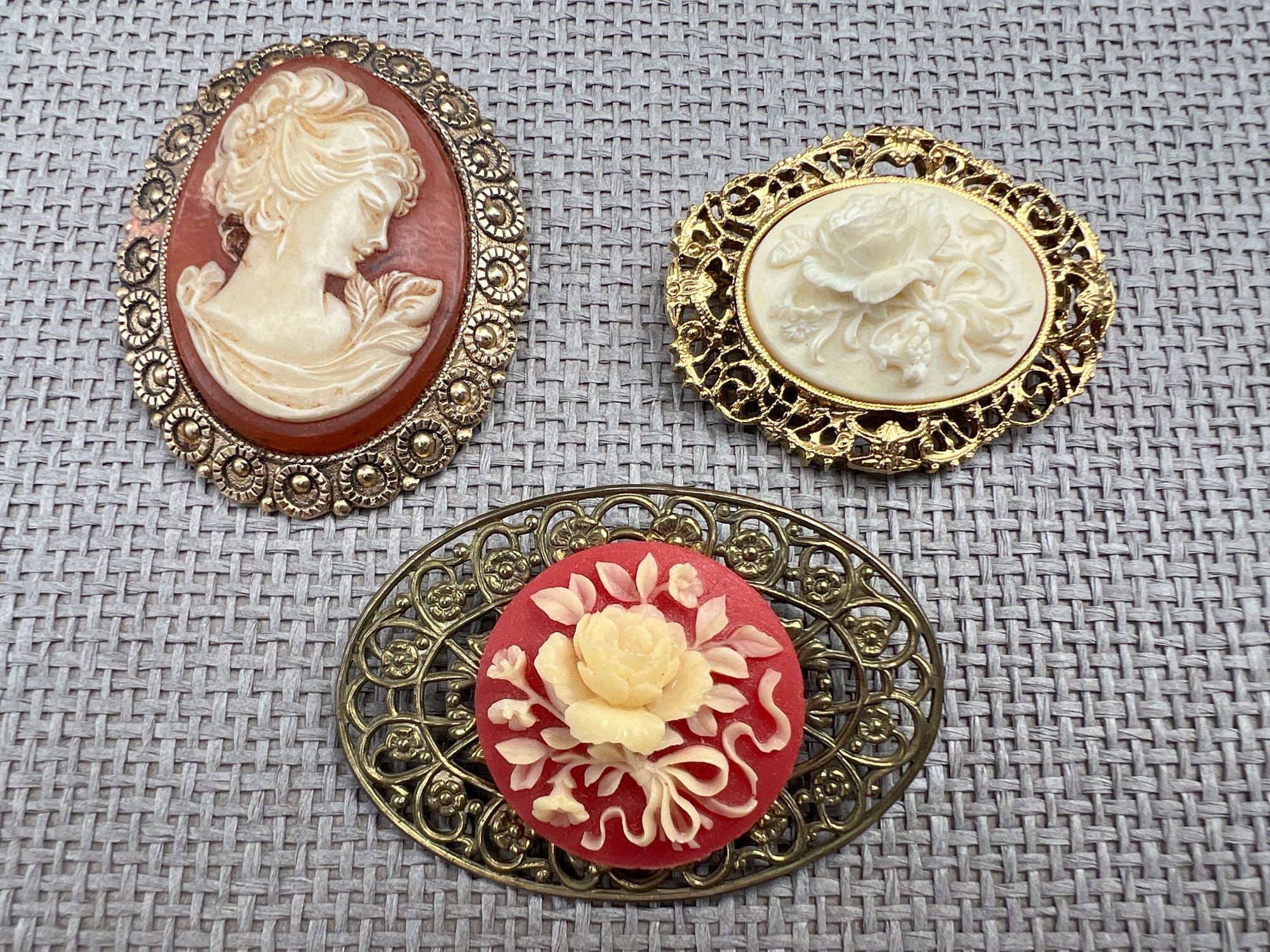 Trio of vintage gilt metal and cameo or carved shell type brooches.
