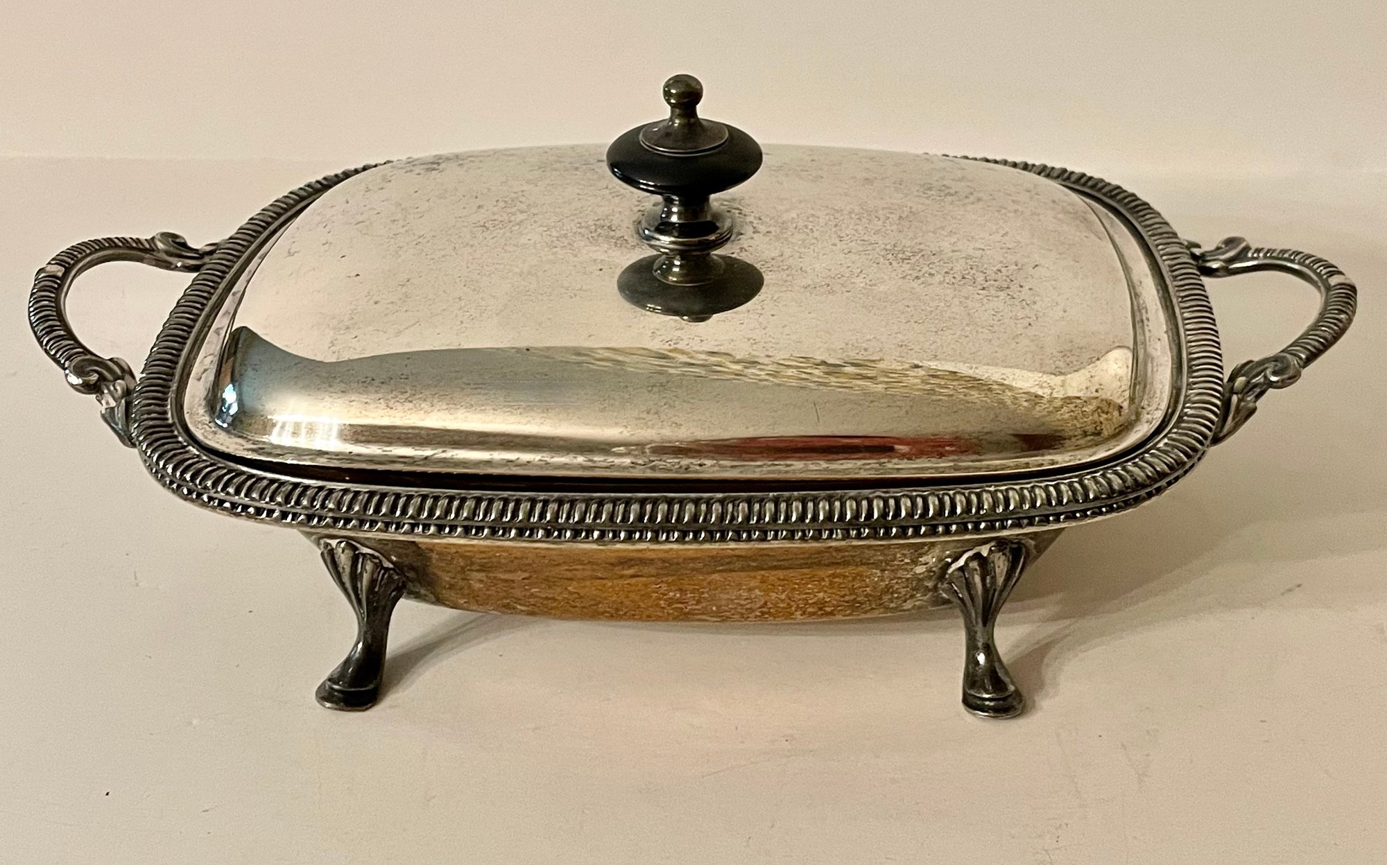 Nice vintage 3 piece footed serving tray with handles with a Sheffield mark. It's in very good condition with only a tiny dent on the inner tray. Will not show when it's being used.