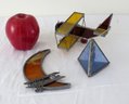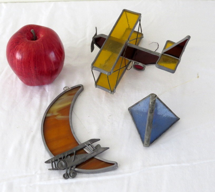 Three stained glass sun catchers, one in the form of a WWI Biplane, another a half moon form with WWI leaded biplane and a small blue pyramid.