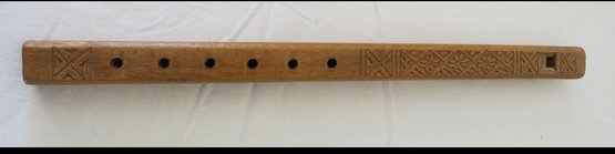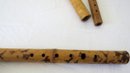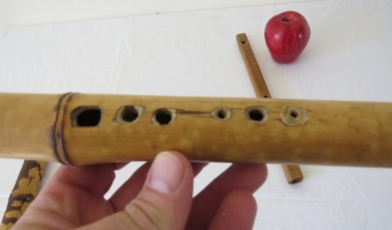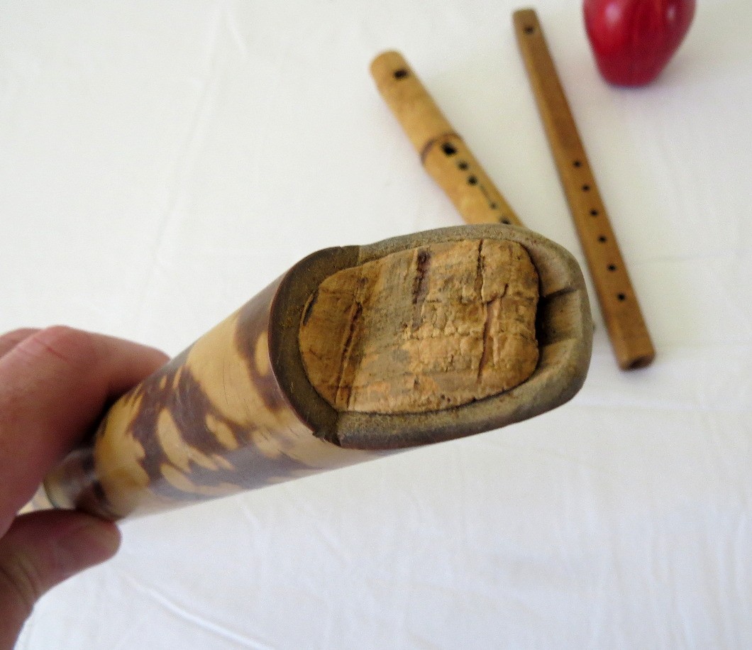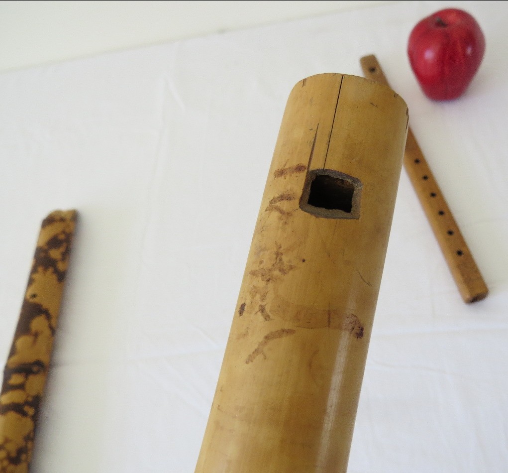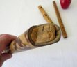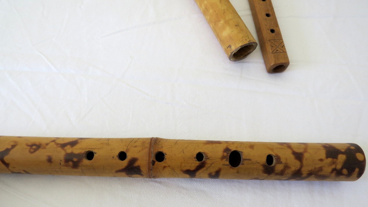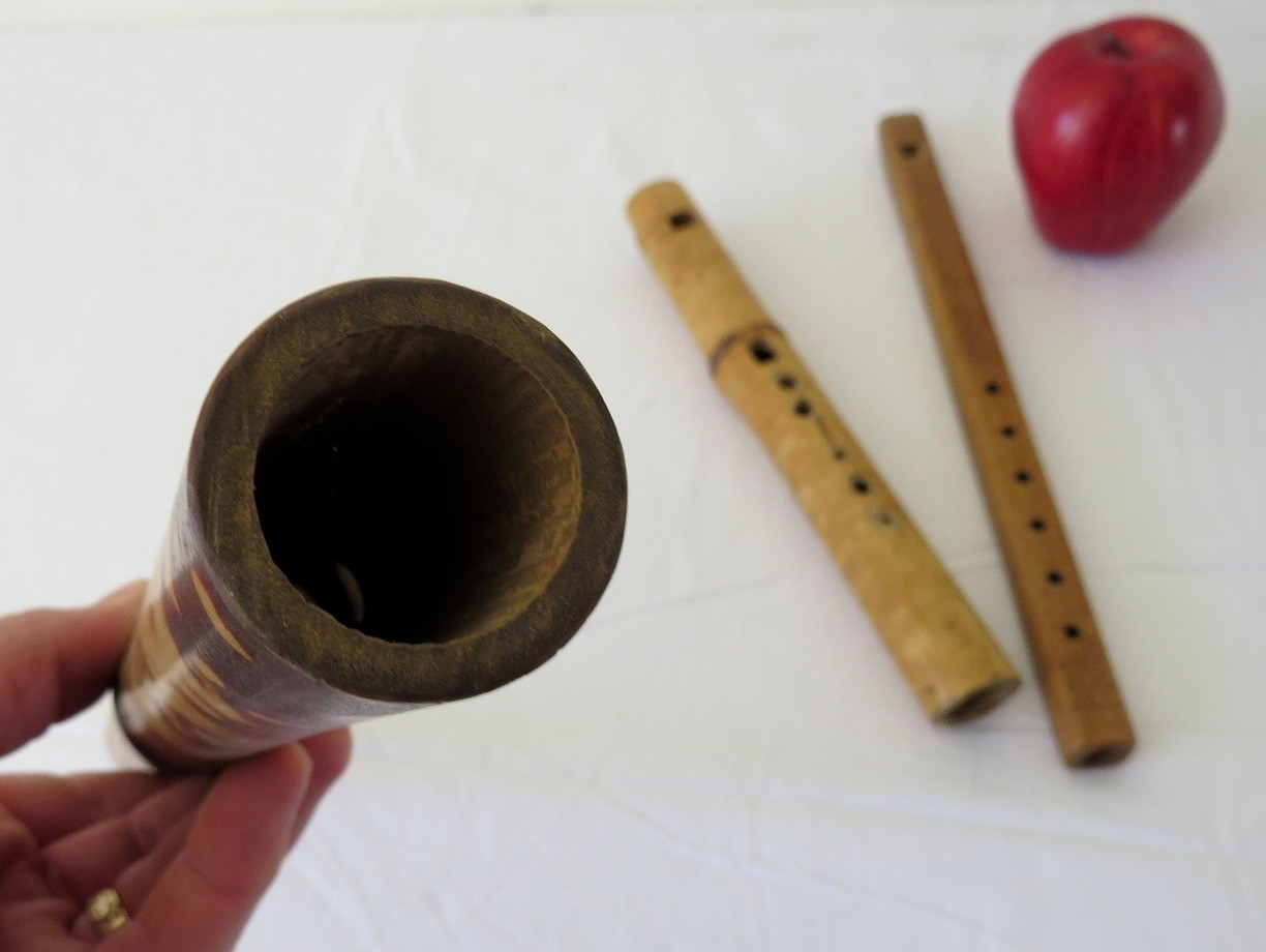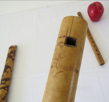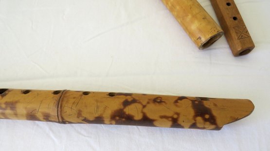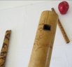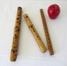 Three woodwind instruments / flutes, hand carved of bamboo and other woods, 10.5" to 14" in length.