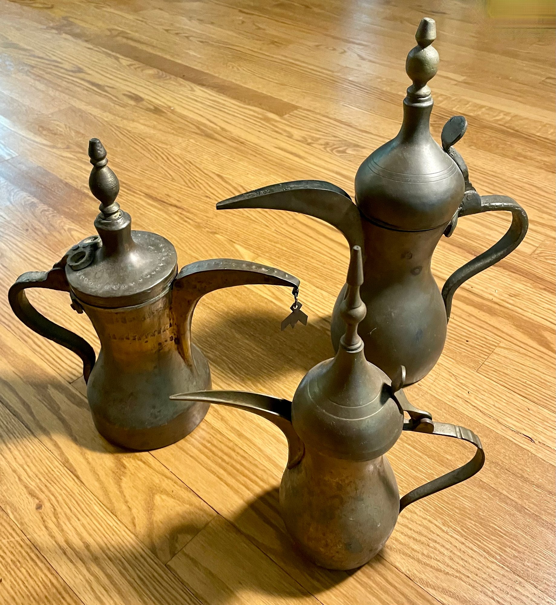 Exotic Middle Eastern brass jugs in unusual forms. They are 13", 11 1/2" and 11" in height. They are all in good condition.