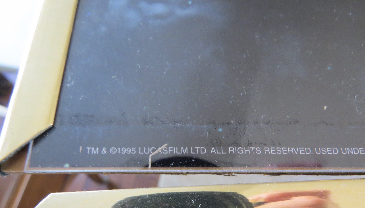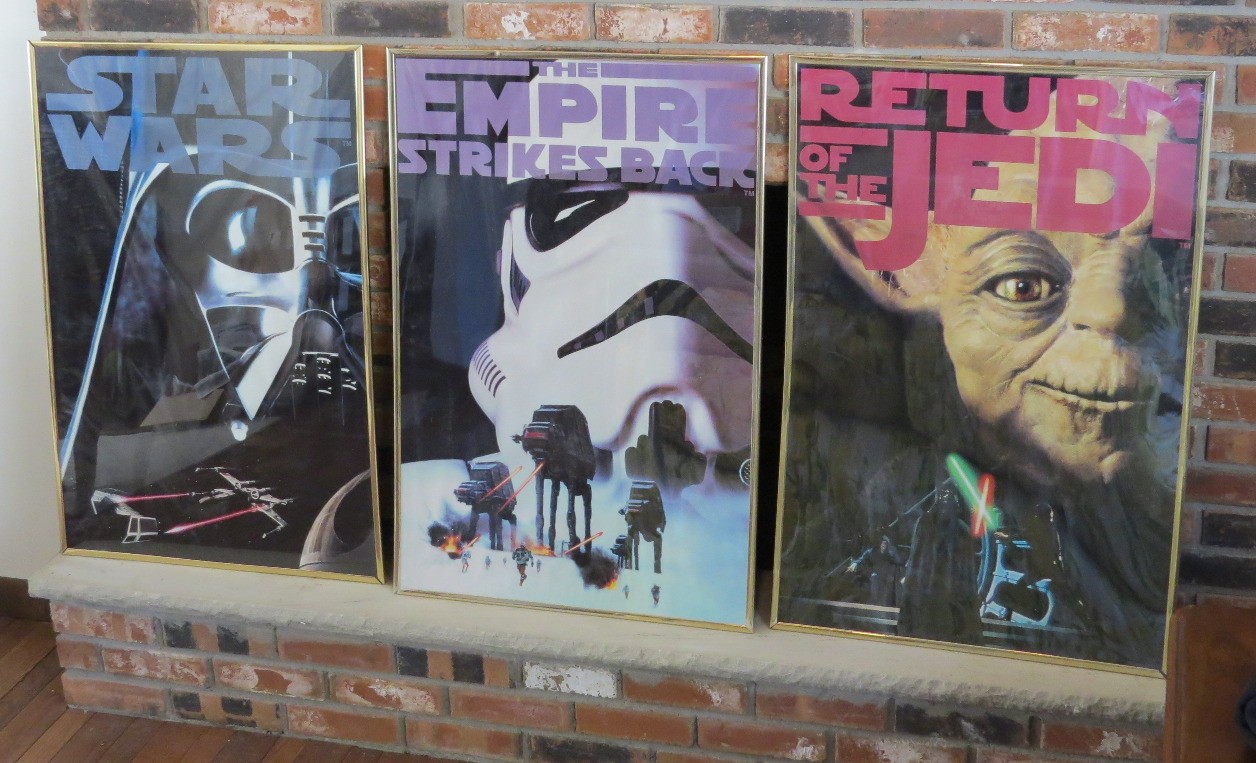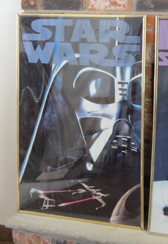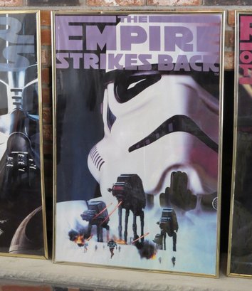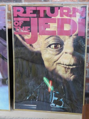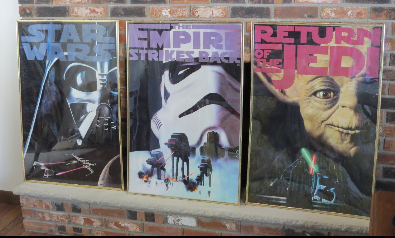 A set of 3 vintage Star Wars posters for the first three movies, Star Wars, Empire Strikes Back and Return of the Jedi. Published 1995, in plastic frames with lexan plastic fronts, 24" x 36" in size. Despite all the reflections in the room on the glass, they're cool posters.