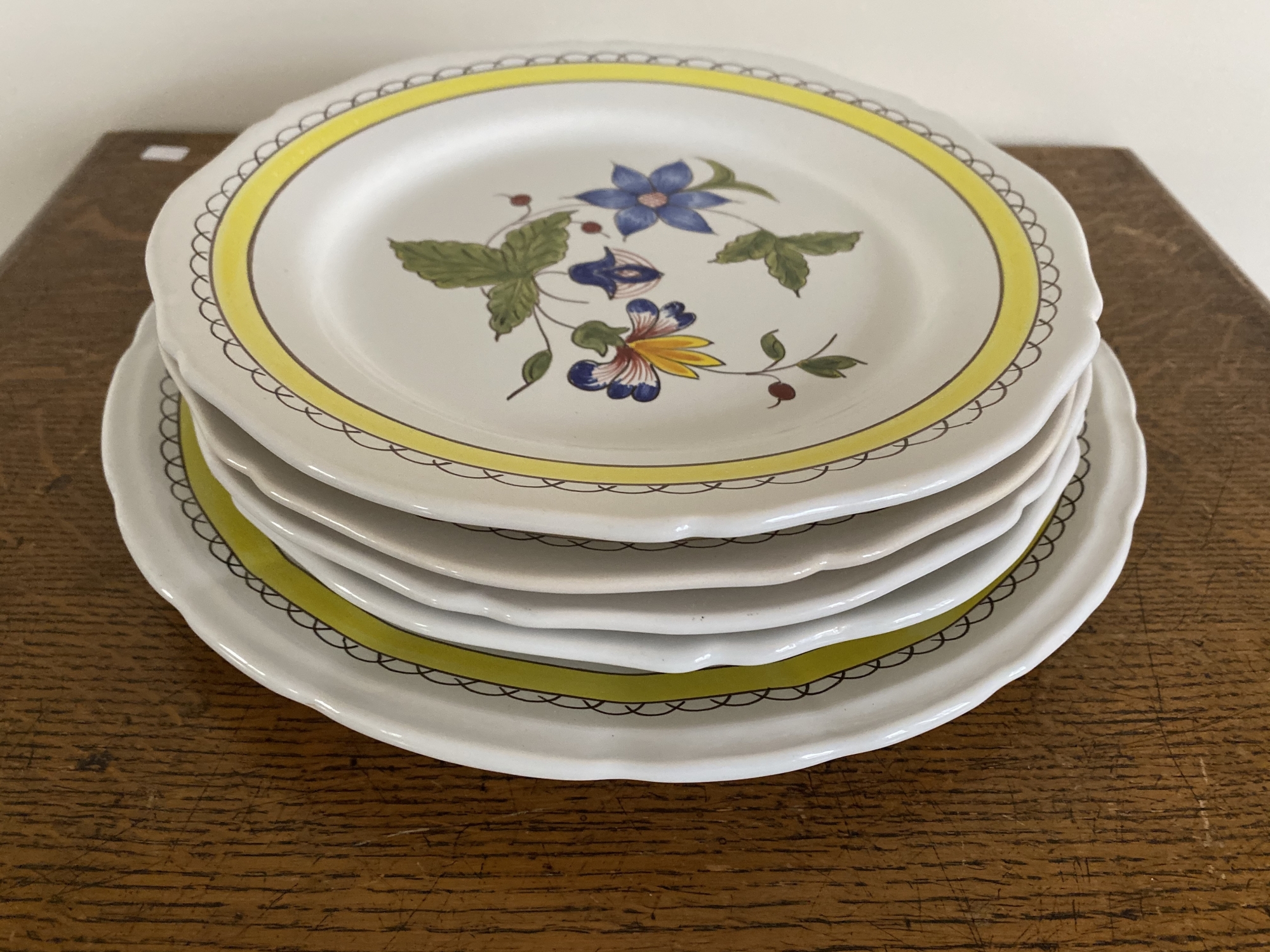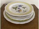 Tiffany ceramic, hand painted in France. Four plates and one serving dish. Center floral pattern with vibrant yellow border.