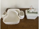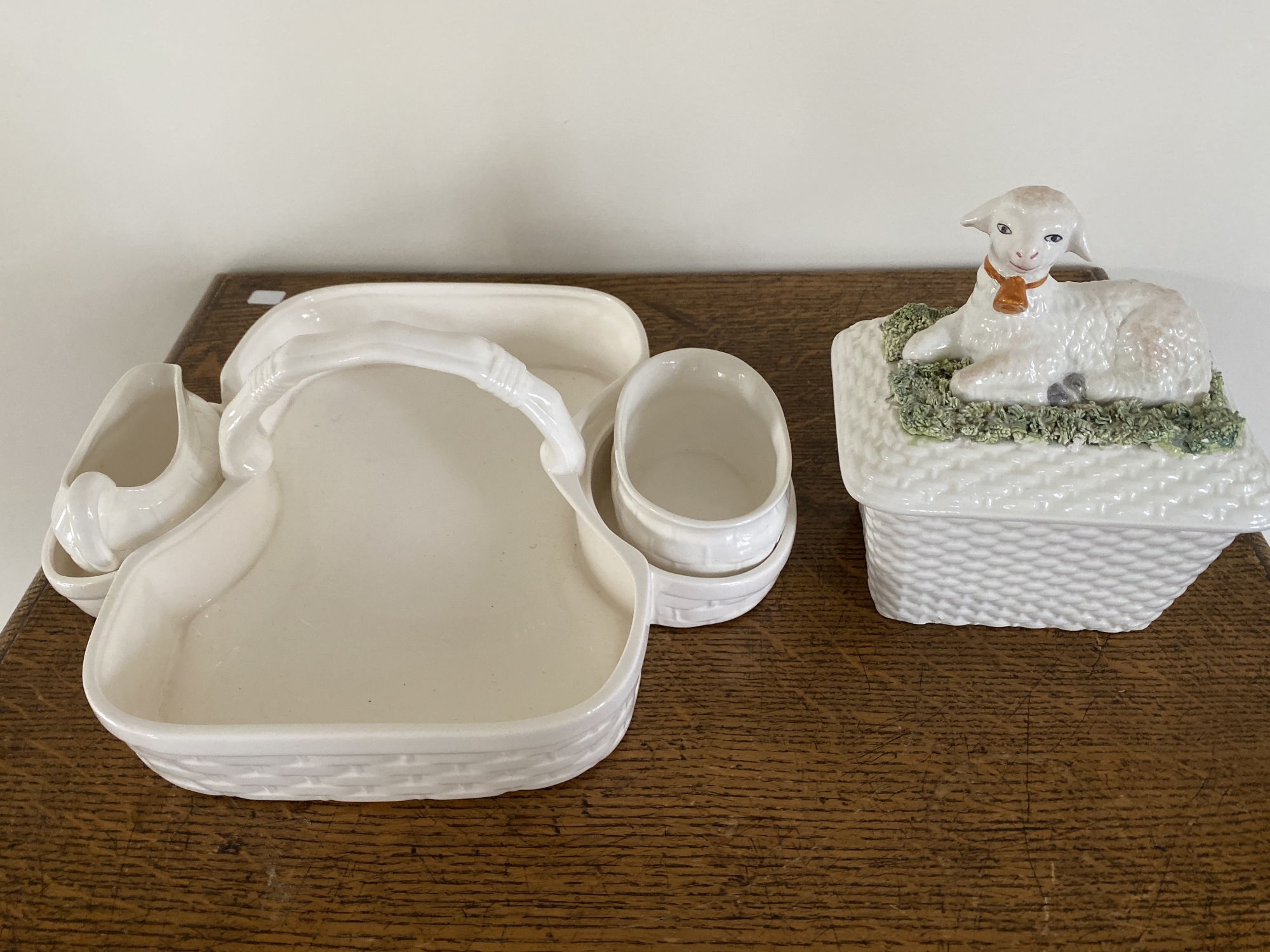 Porcelain basketweave box topped with darling lamb. Accompanied by porcelain basketweave berry box, including cream and sugar bowls and top porcelain handle. Both by Tiffany.