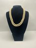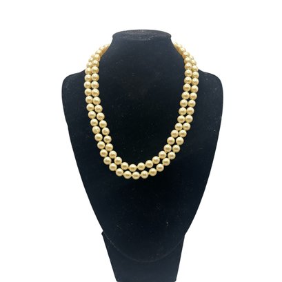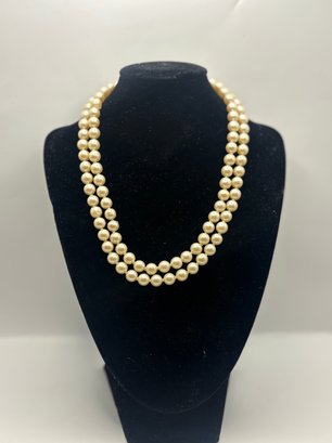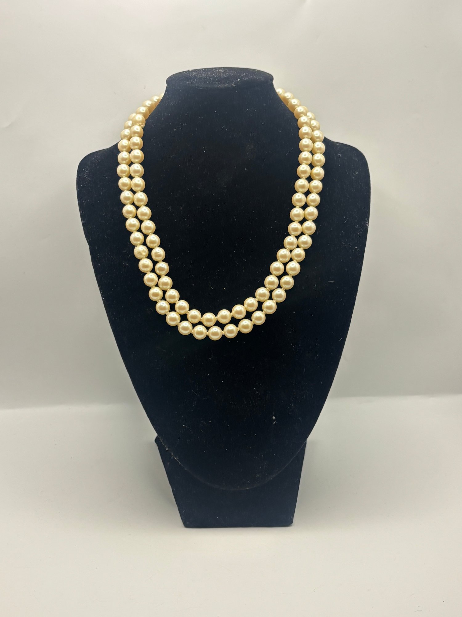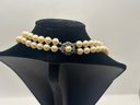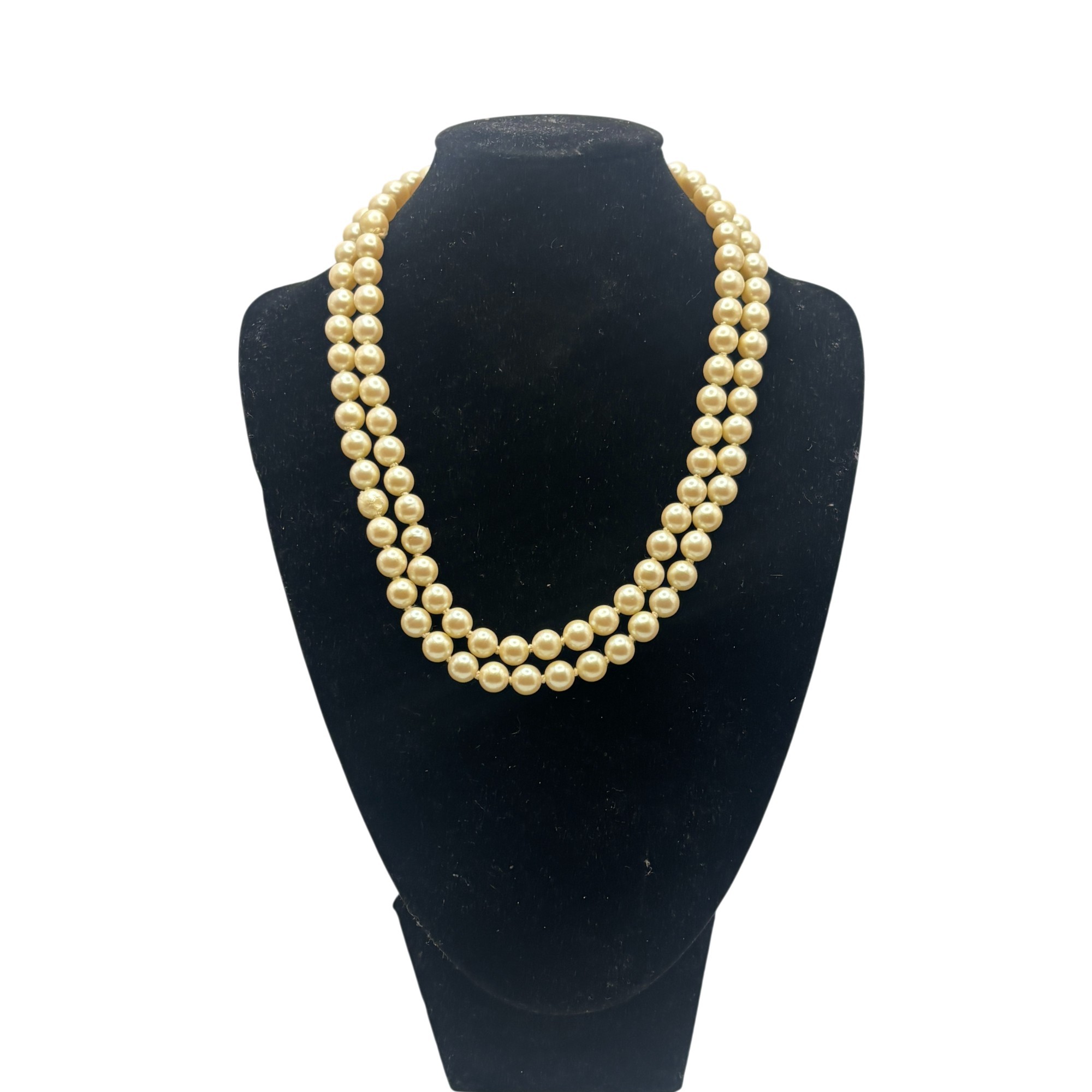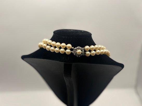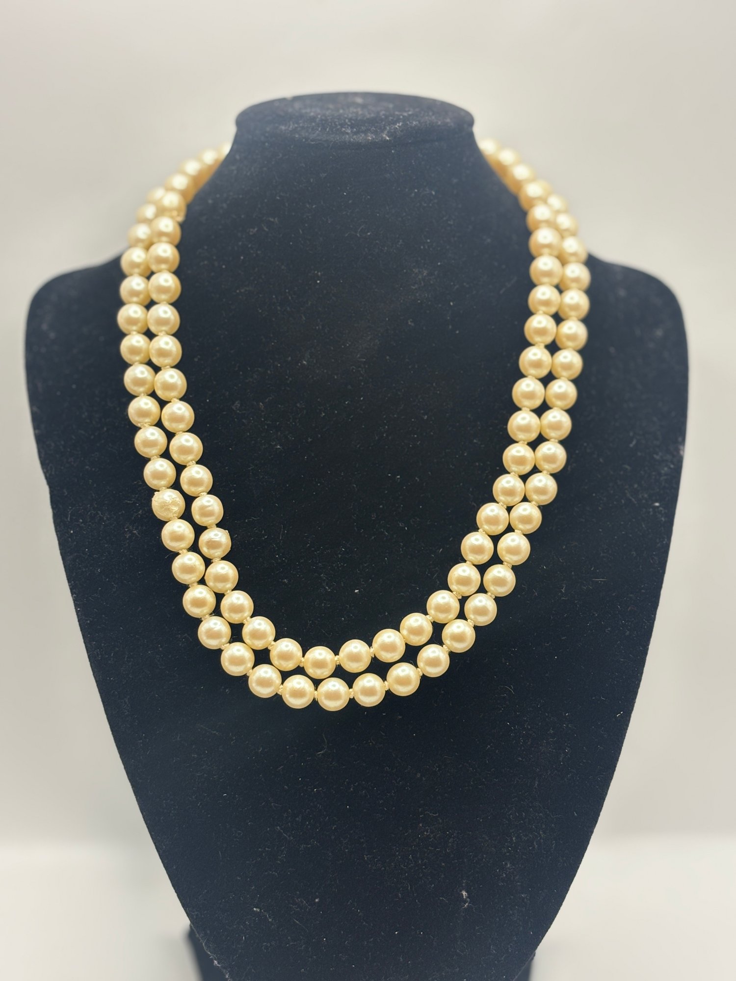 A graceful double strand pearl necklace featuring luminous cream-toned pearls and a decorative silver-tone clasp accented with a central pearl and marcasite-style detailing. The two-row design gives this piece added presence while maintaining classic sophistication. Perfect for formal occasions, bridal wear, or elevating everyday style with a touch of vintage-inspired refinement.