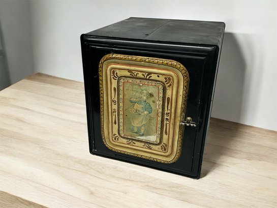 Antique/vintage tin pie safe painted black, but the door is decorated with a painted frame holding a picture of an antique baker. There is a tear in the bottom of the picture. The interior has a replacement wood shelf to make 2 levels. The back is ventilated with tiny holes in circle patterns.
